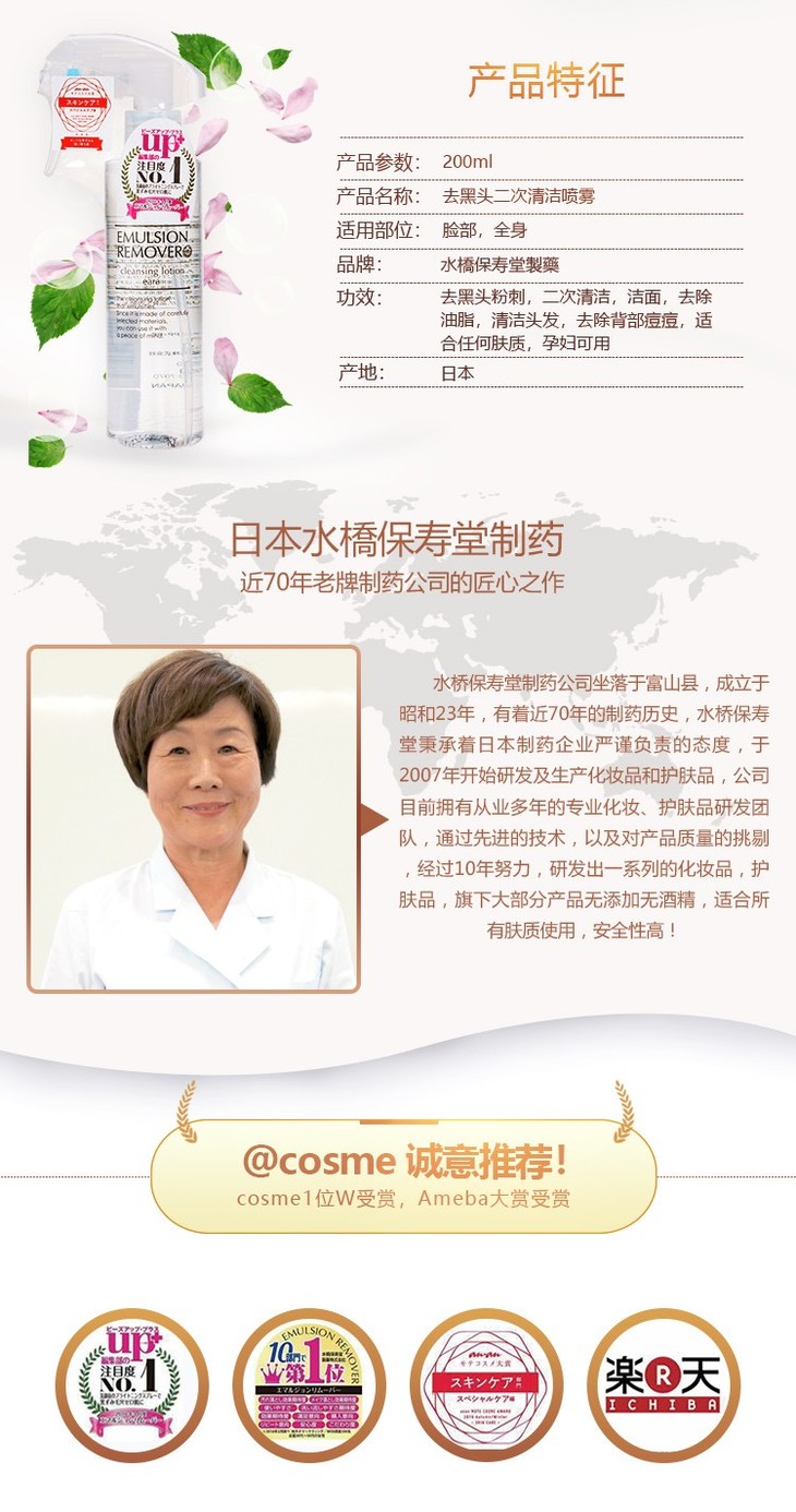 【保税仓】日本水桥保寿堂喷雾水二次清洁卸妆可用洁面喷雾200ml