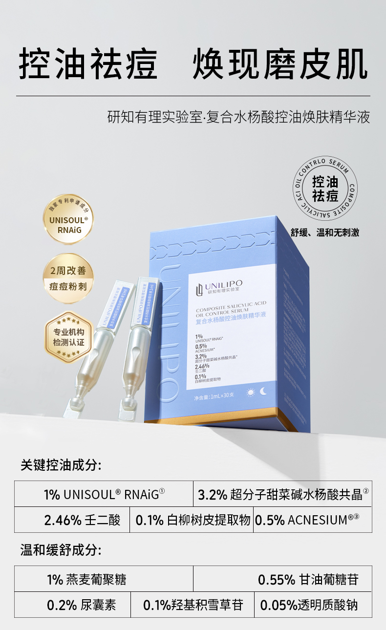 脸蛋更嫩滑 1盒尝鲜装!UNILIPO研知有理 水杨酸控油次抛精华液1ml*30支/痘肌/油性肌