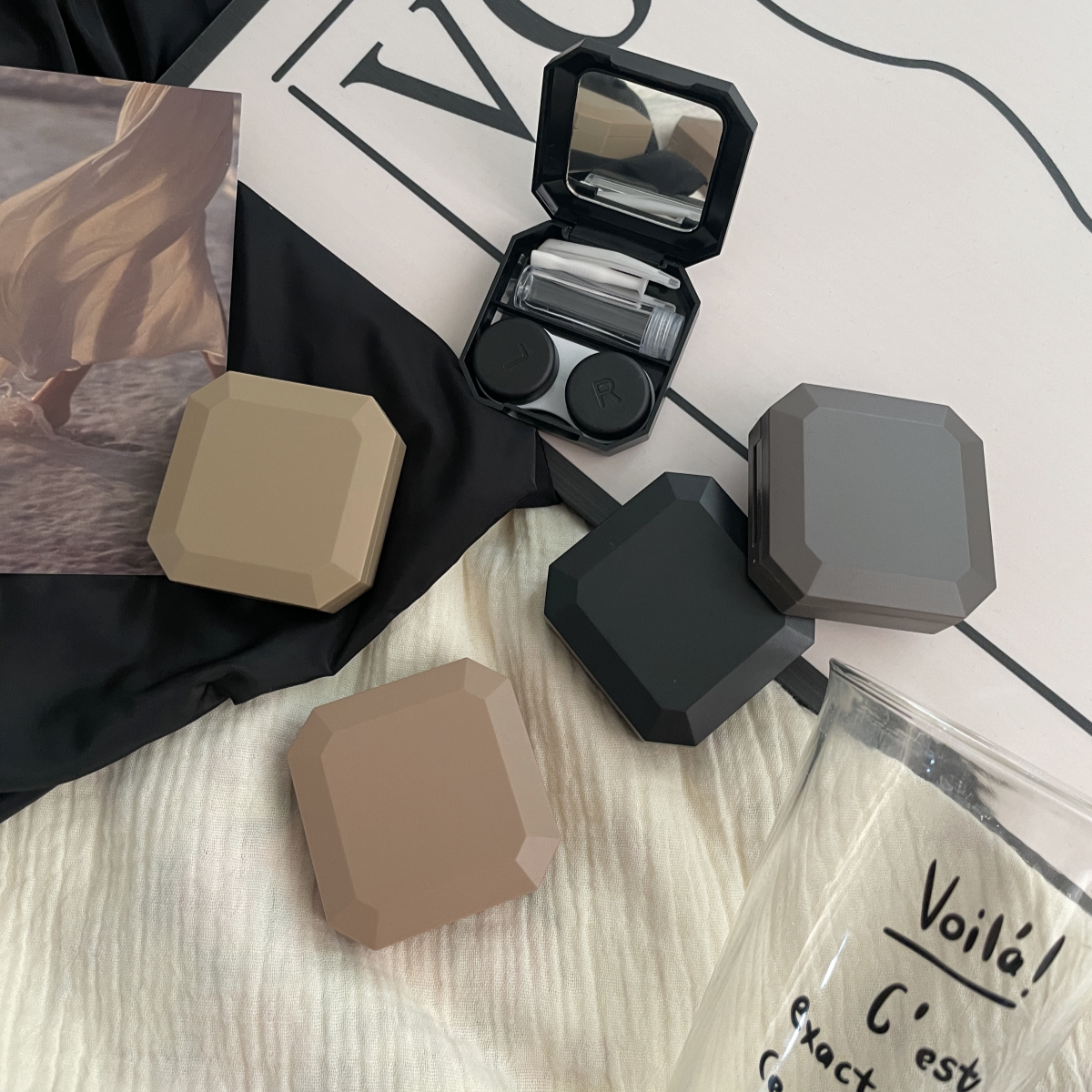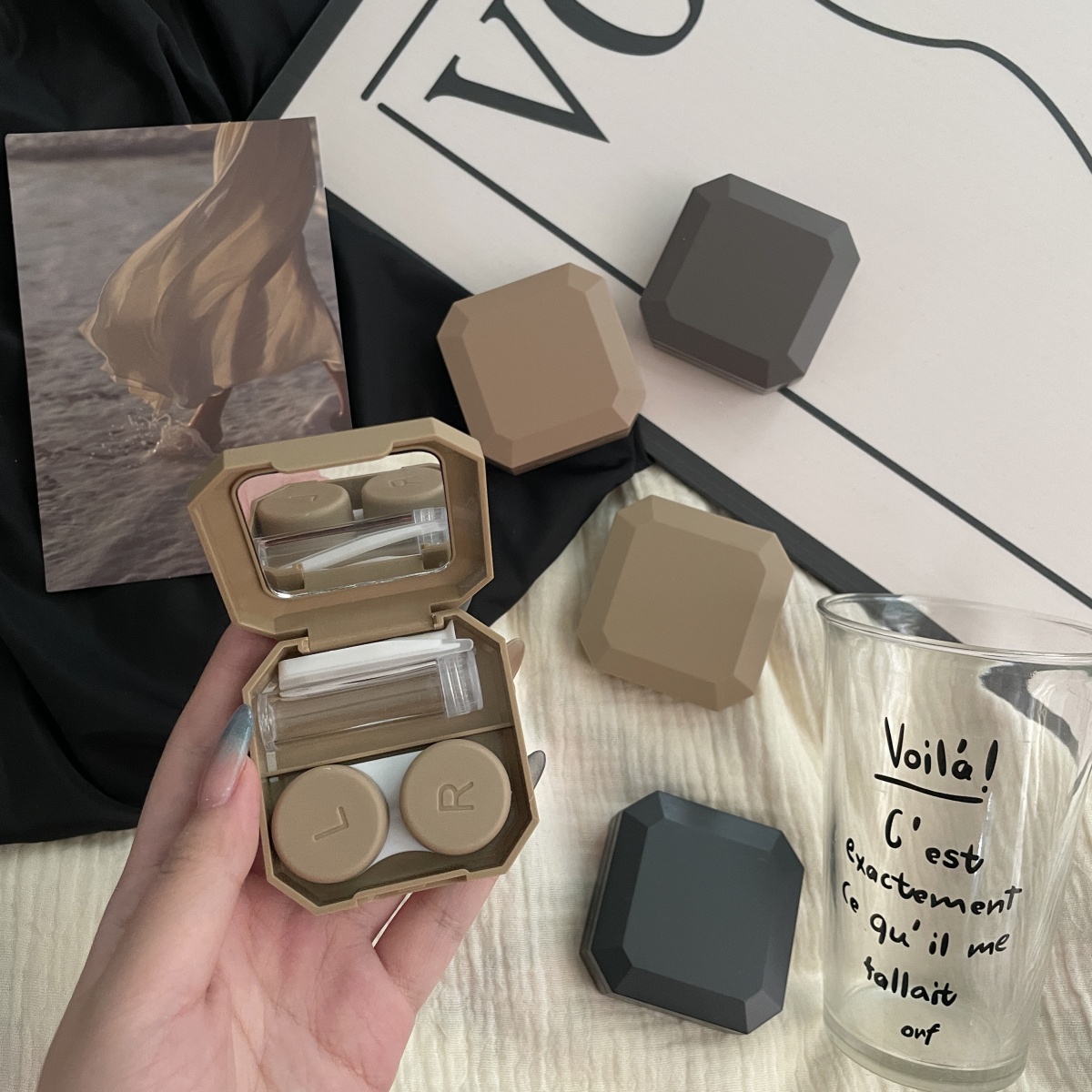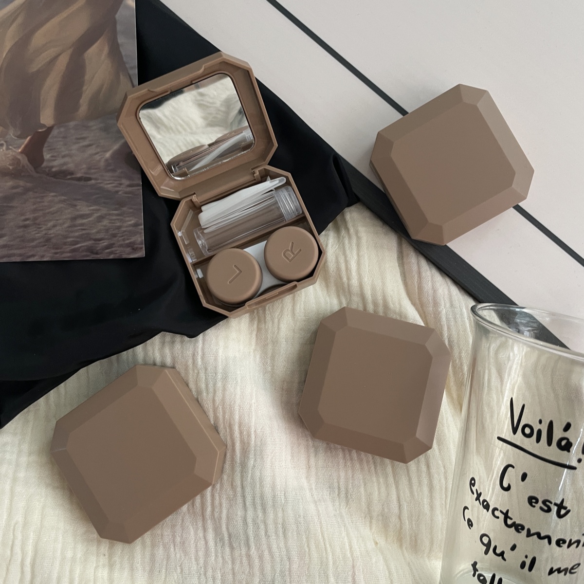 伴侣盒套装组成:双联盒、镊子、配戴棒、小瓶子、镜子。