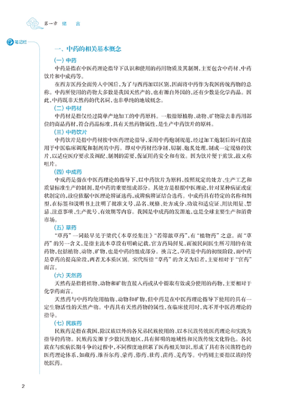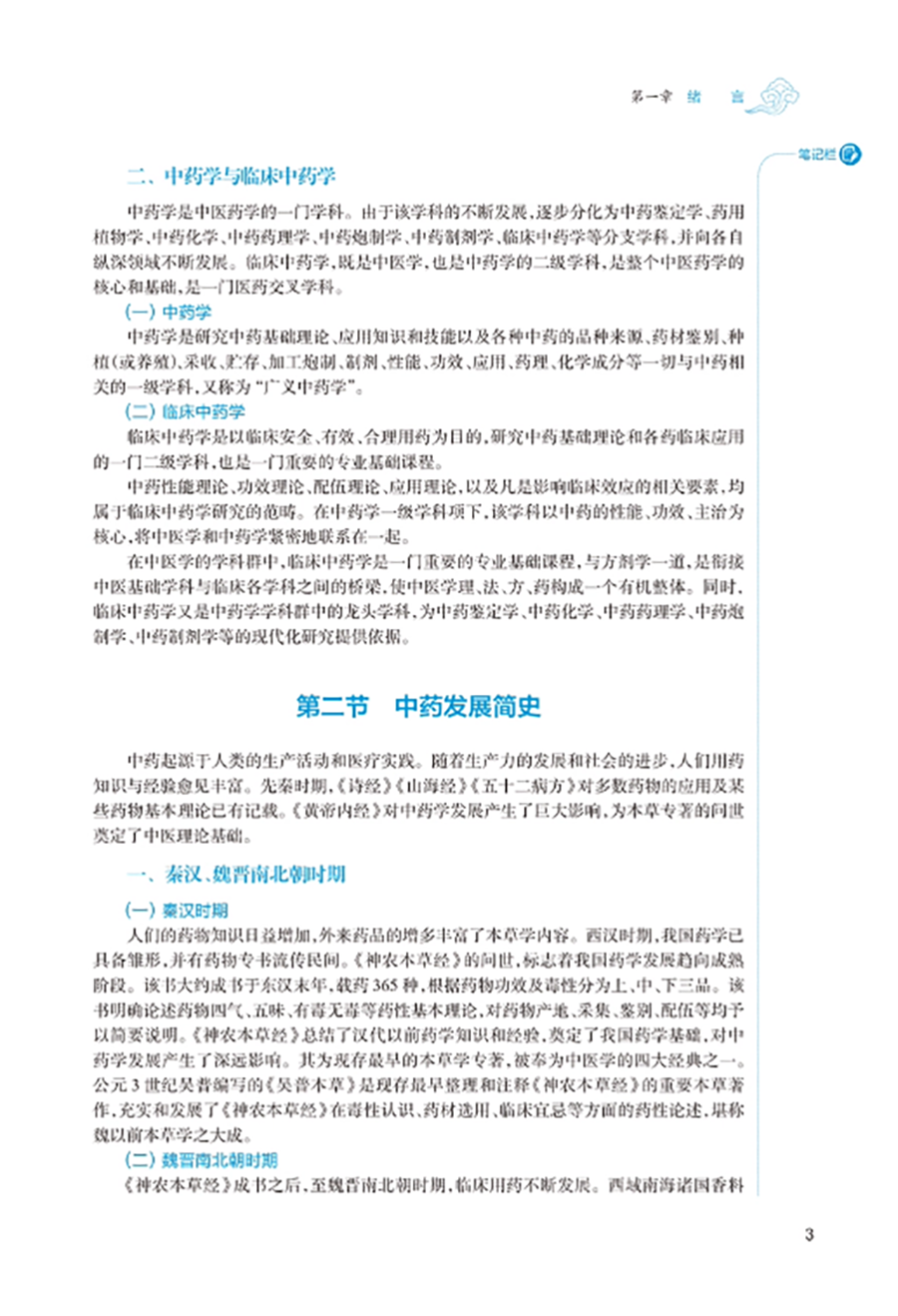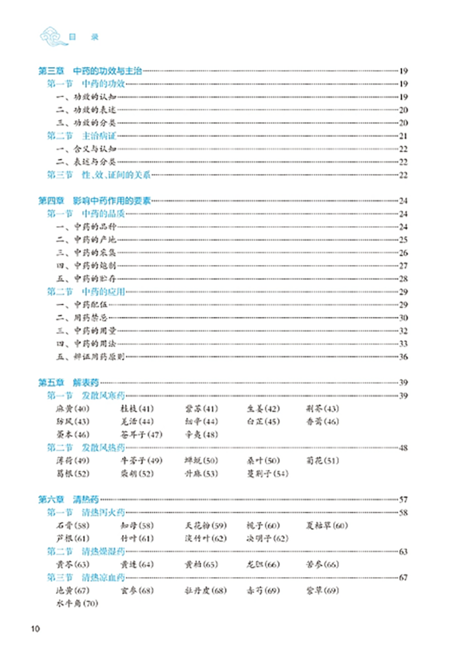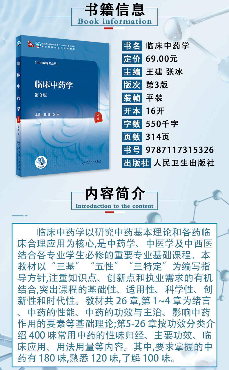 临床中药学以研究中药基本理论和各药临床合理应用为核心,是中药学、中医学及中西医结合各专业学生必修的重要专业基础课程。本教材以“三基”“五性”“三特定”为编写指导方针,注重知识点、创新点和执业需求的有机结合,突出课程的基础性、适用性、科学性、创新性和时代性。教材共 26 章,第 1~4 章为绪言、中药的性能、中药的功效与主治、影响中药作用的要素等基础理论;第5-26 章按功效分类介绍 400 味常用中药的性味归经、主要功效、临床应用、用法用量等内容。其中,要求掌握的中药有 180 味,熟悉 120 味,了解 100 味。