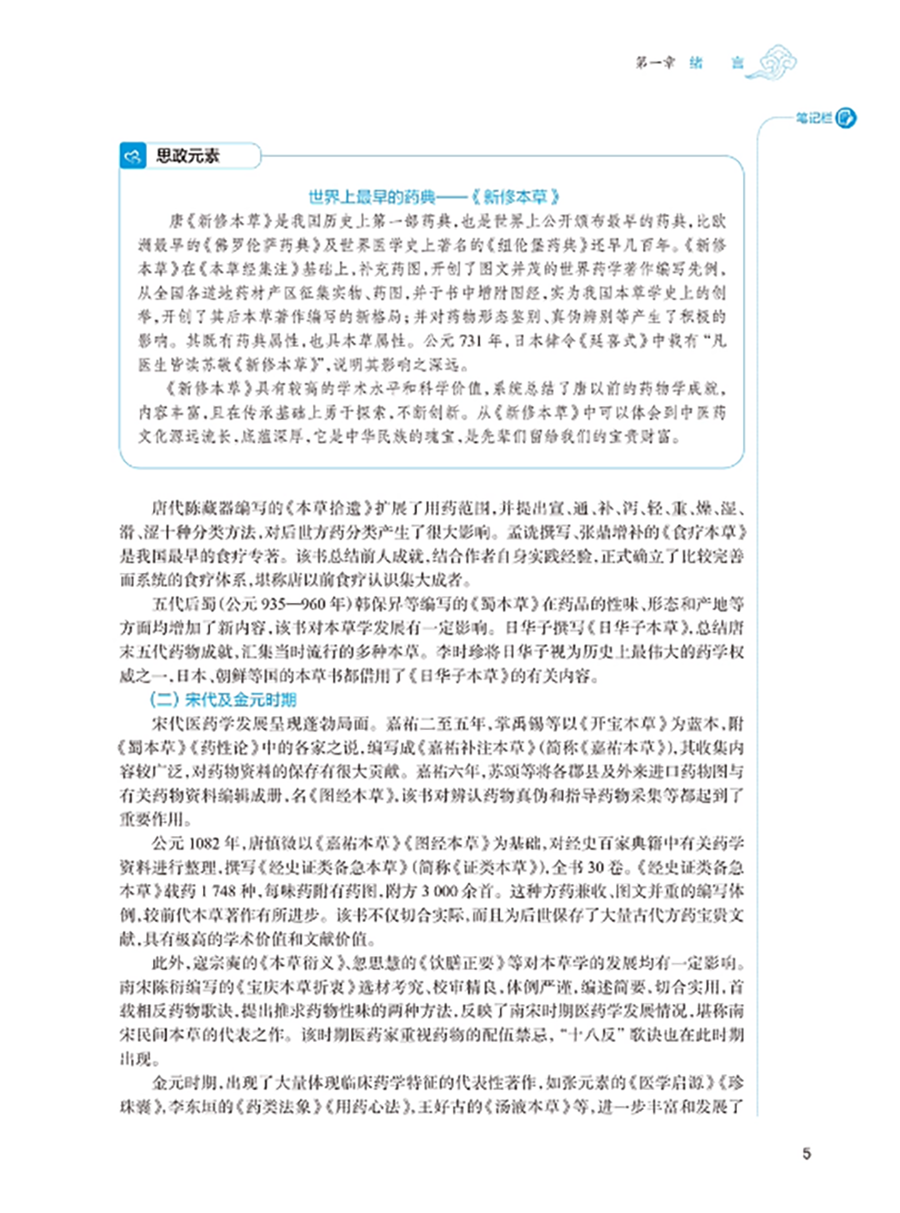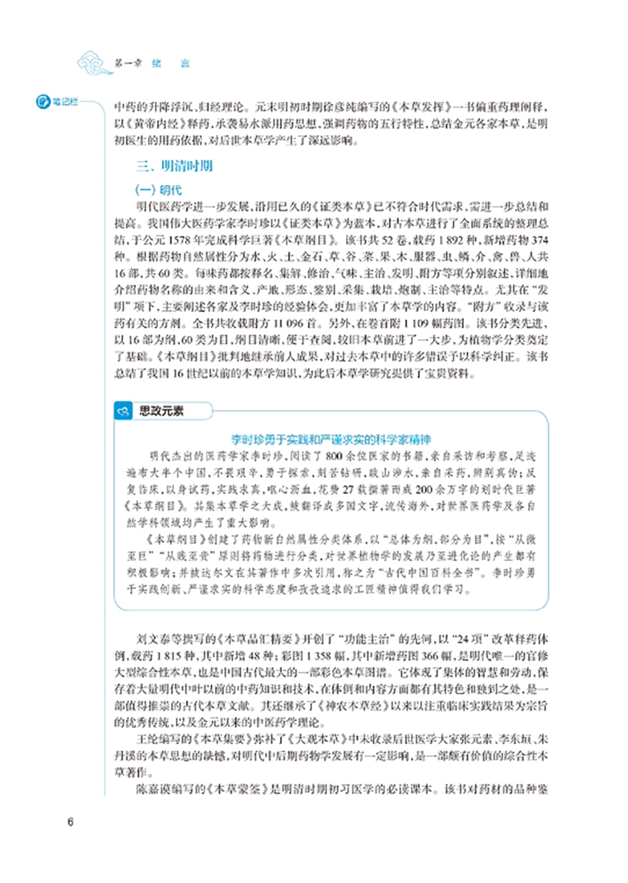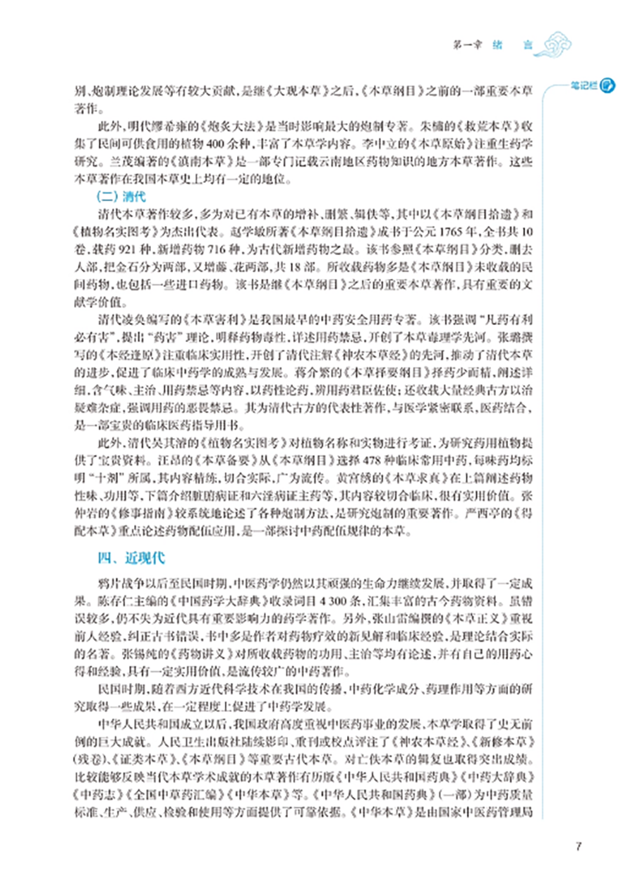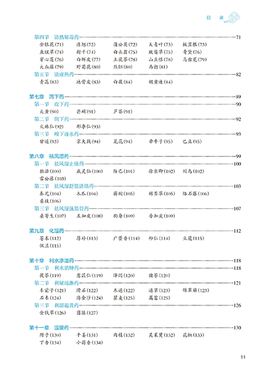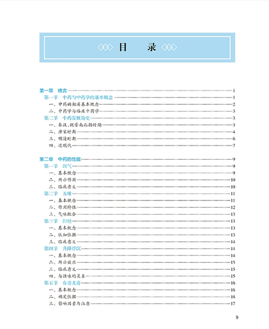临床中药学以研究中药基本理论和各药临床合理应用为核心,是中药学、中医学及中西医结合各专业学生必修的重要专业基础课程。本教材以“三基”“五性”“三特定”为编写指导方针,注重知识点、创新点和执业需求的有机结合,突出课程的基础性、适用性、科学性、创新性和时代性。教材共 26 章,第 1~4 章为绪言、中药的性能、中药的功效与主治、影响中药作用的要素等基础理论;第5-26 章按功效分类介绍 400 味常用中药的性味归经、主要功效、临床应用、用法用量等内容。其中,要求掌握的中药有 180 味,熟悉 120 味,了解 100 味。