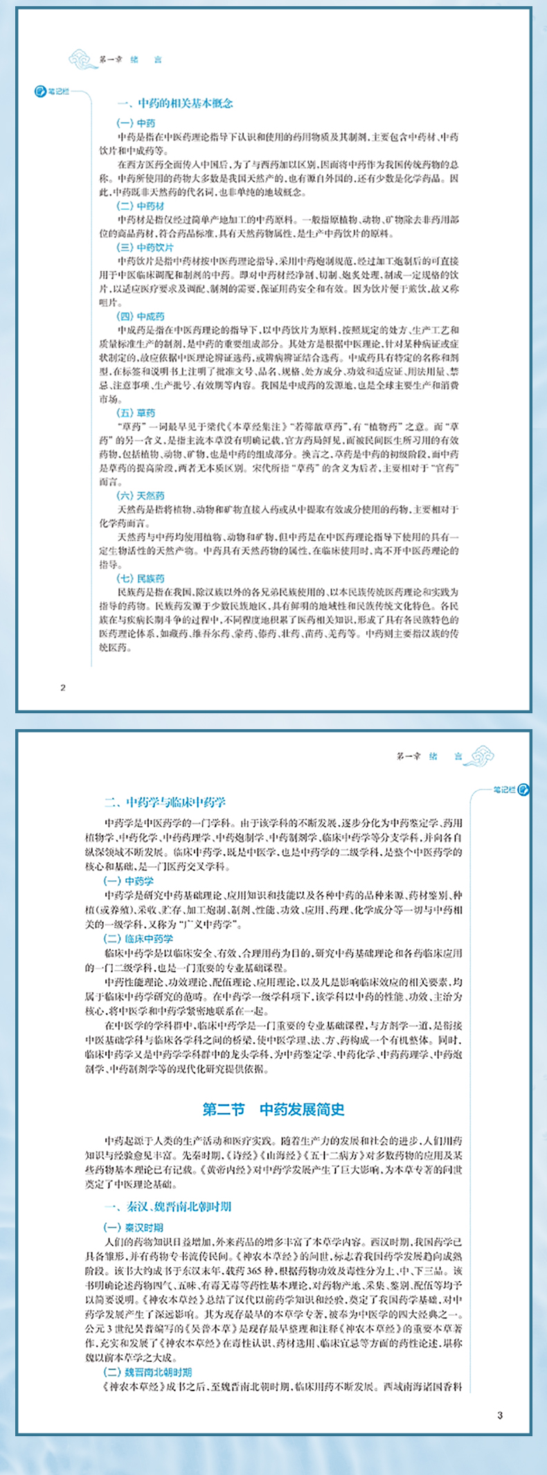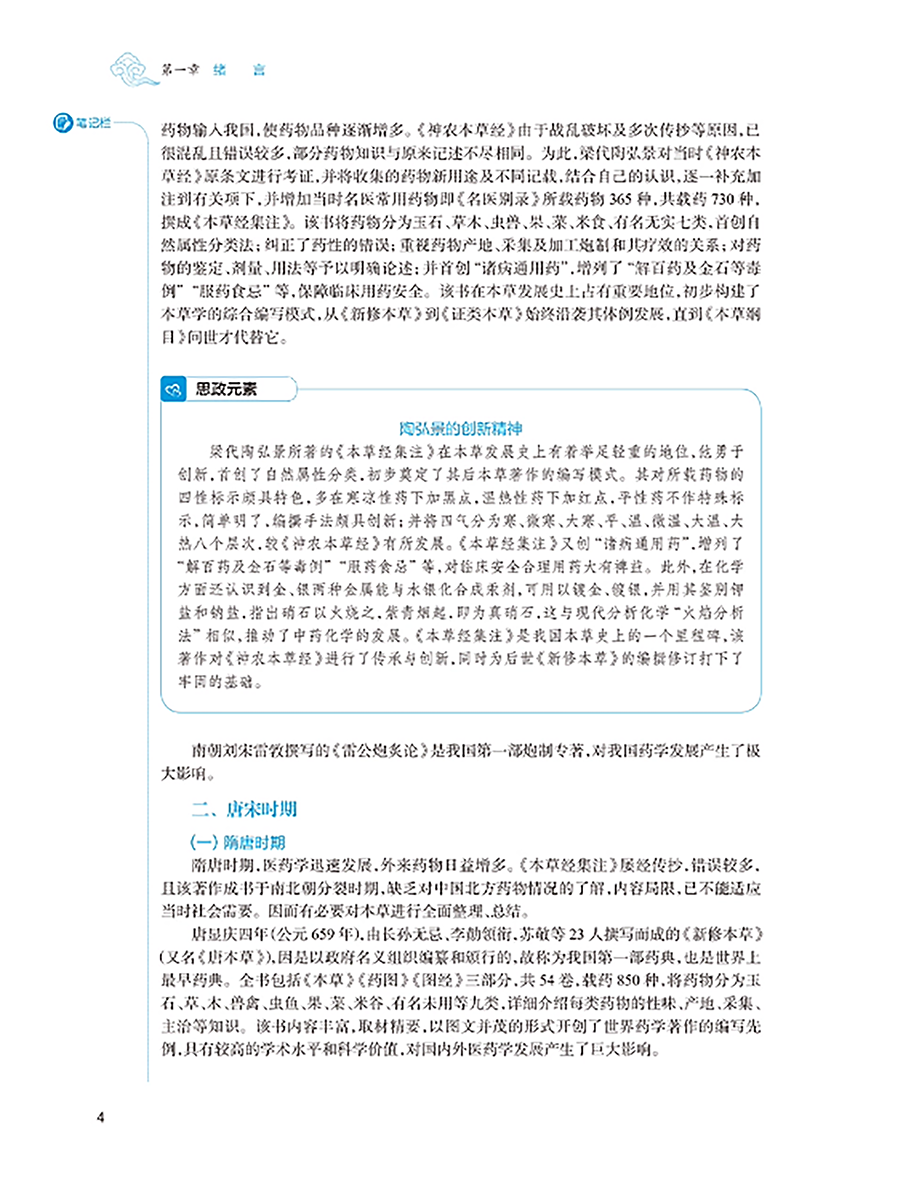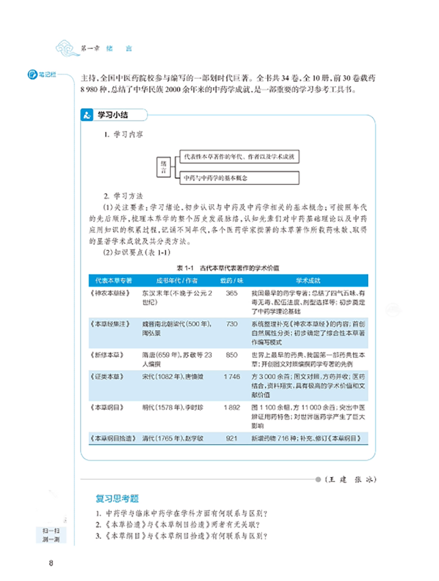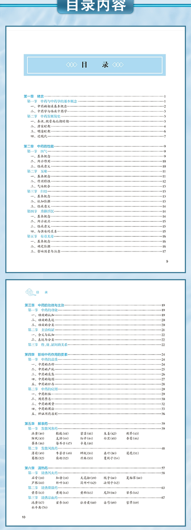 临床中药学以研究中药基本理论和各药临床合理应用为核心,是中药学、中医学及中西医结合各专业学生必修的重要专业基础课程。本教材以“三基”“五性”“三特定”为编写指导方针,注重知识点、创新点和执业需求的有机结合,突出课程的基础性、适用性、科学性、创新性和时代性。教材共 26 章,第 1~4 章为绪言、中药的性能、中药的功效与主治、影响中药作用的要素等基础理论;第5-26 章按功效分类介绍 400 味常用中药的性味归经、主要功效、临床应用、用法用量等内容。其中,要求掌握的中药有 180 味,熟悉 120 味,了解 100 味。