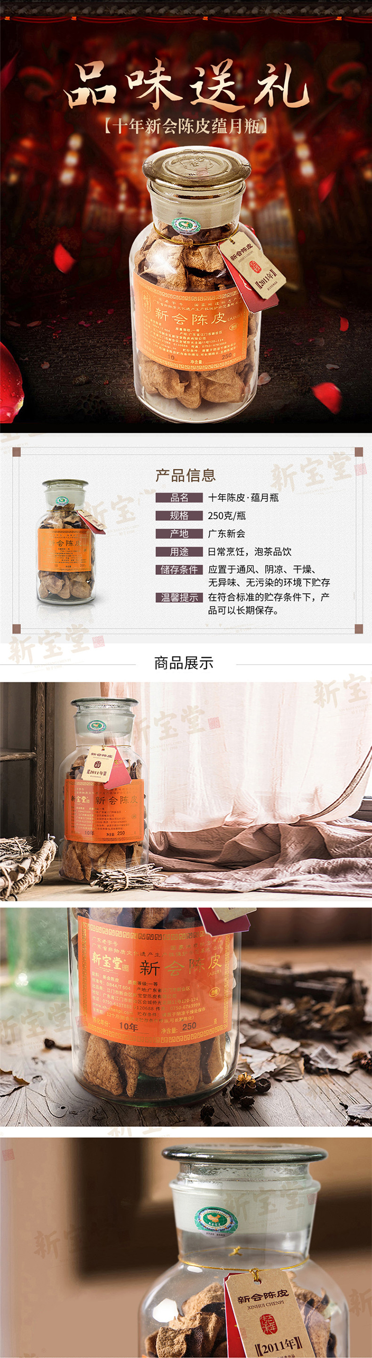 【大象优选】新宝堂牌新会陈皮10年老陈皮蕴月瓶250克 十年陈