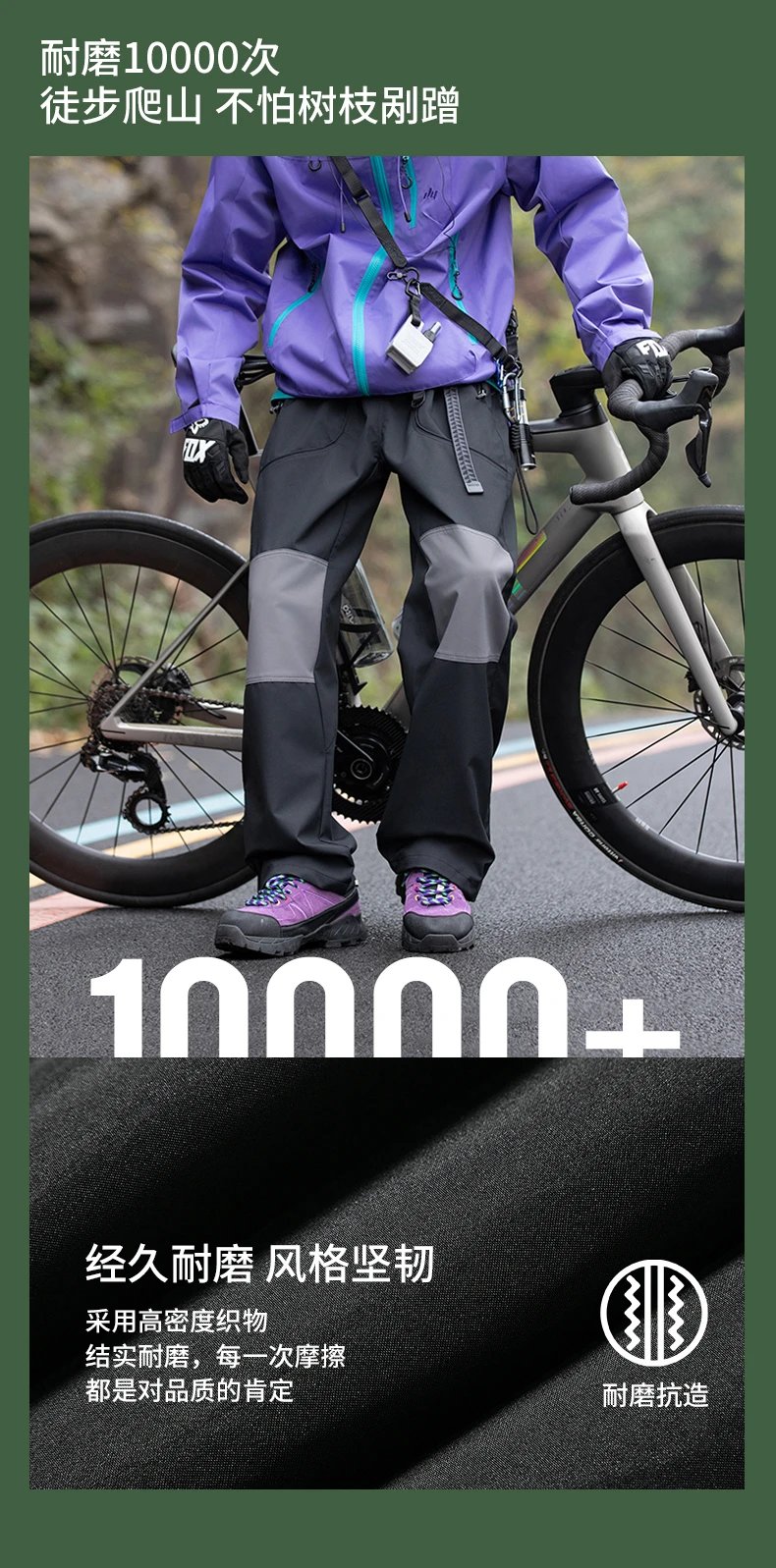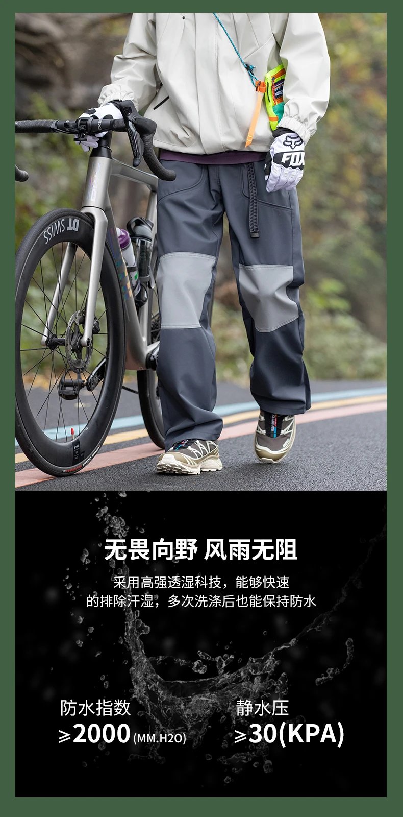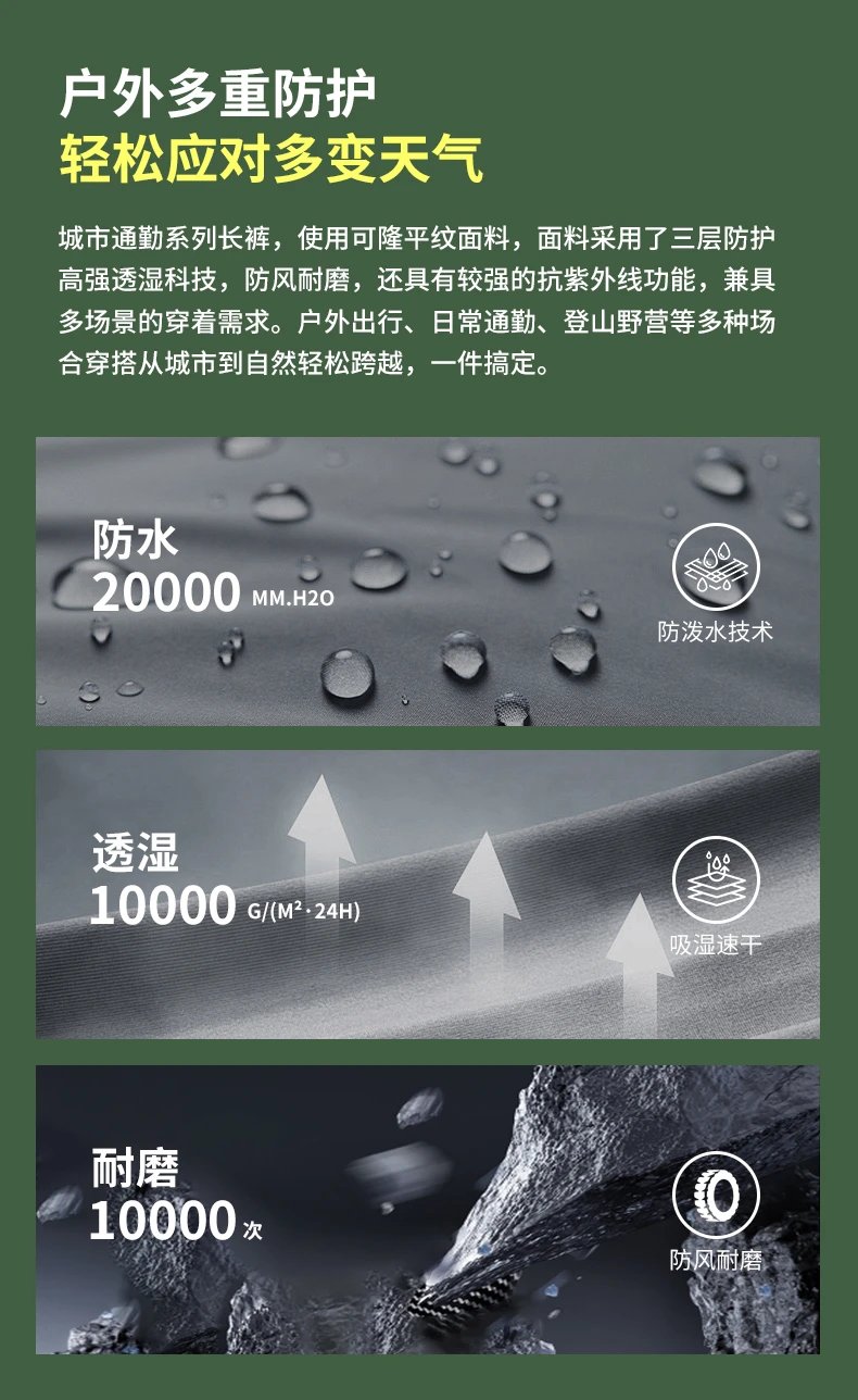城市通勤系列长裤,使用可隆平纹面料,面料采用了三层防护,防水指数高达20000+,多次洗涤后也能保持防水,采用高强透湿科技,透湿率高达10000+,能够快速的排除汗湿,防风耐磨,耐磨指数达到10000次,能够很好的保护身体不被划伤,还具有较强的抗紫外线功能,兼具多场景的穿着需求。