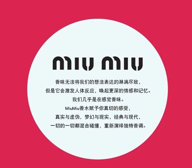 这款原料带有广藿香 胡椒 以及沉香木的木质芳香 Miu Miu香氛的结构是:开头新鲜的花香 发展进入更温暖 更为木质的香味