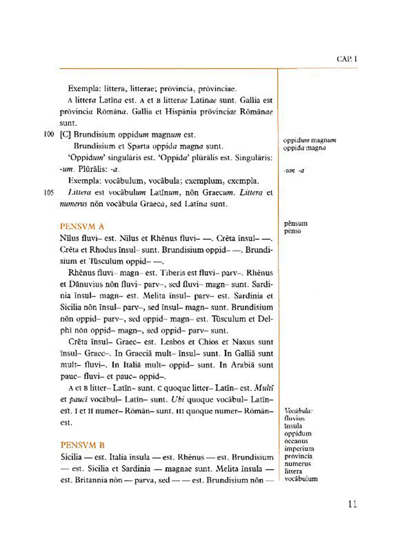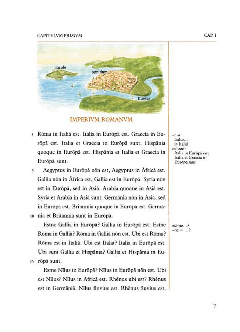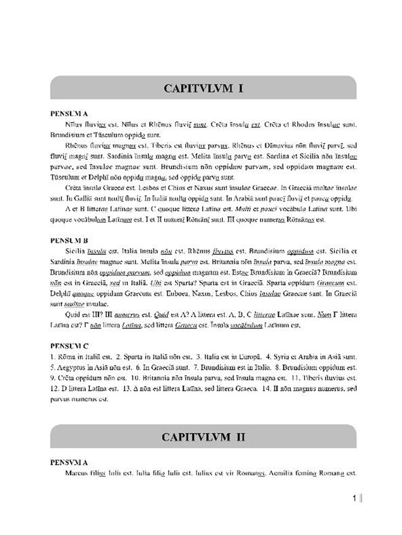 内容全部为拉丁语,避免其他语言的翻译。每章课文后有一段简明的语法讲解(GRAMMATICA LATINA)以及三道练习题(PENSVM)用来巩固课文理解和语法知识。