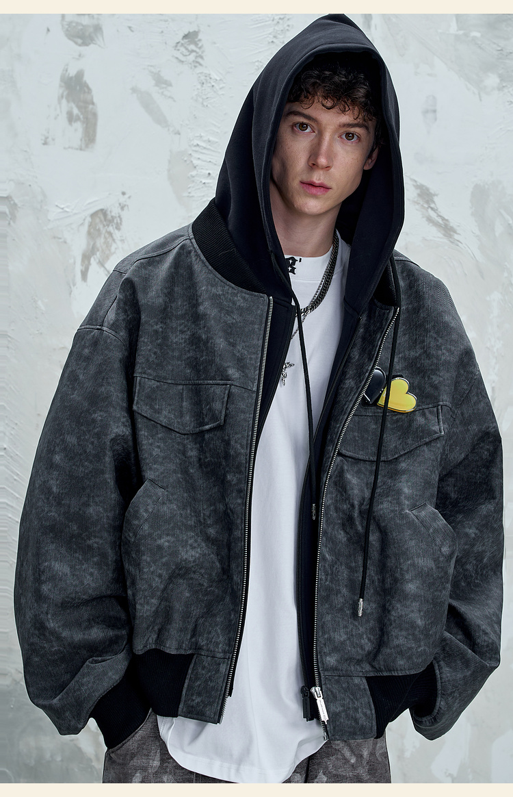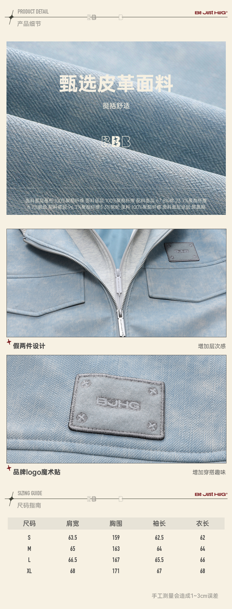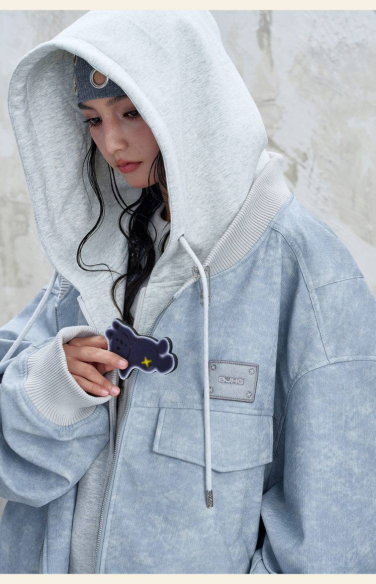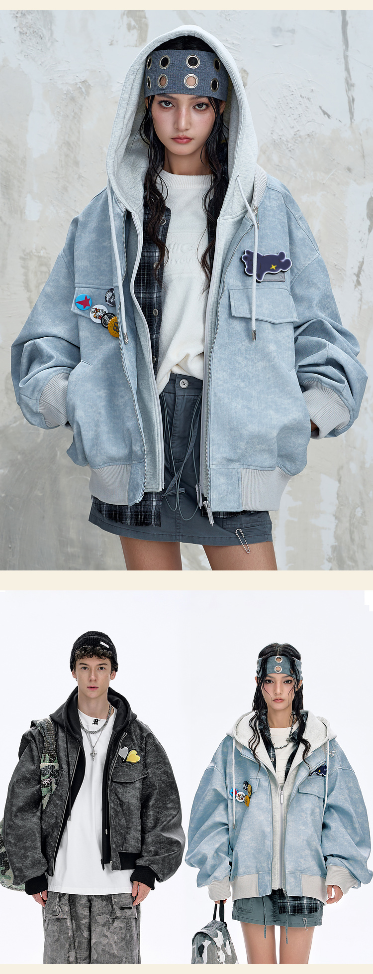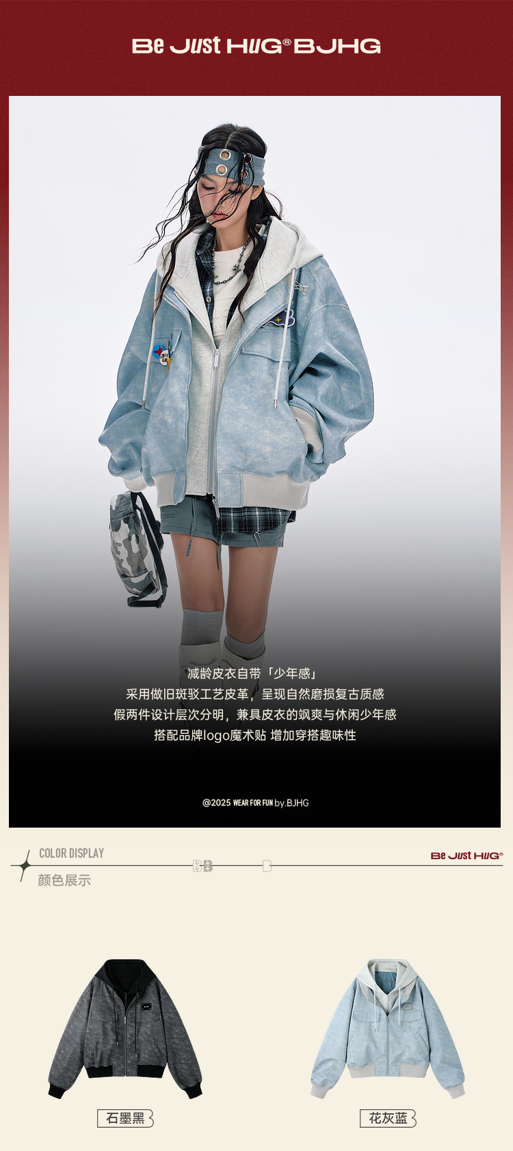 BJHG不计后果假两件夹克外套男款秋季复古做旧连帽休闲皮衣上衣女