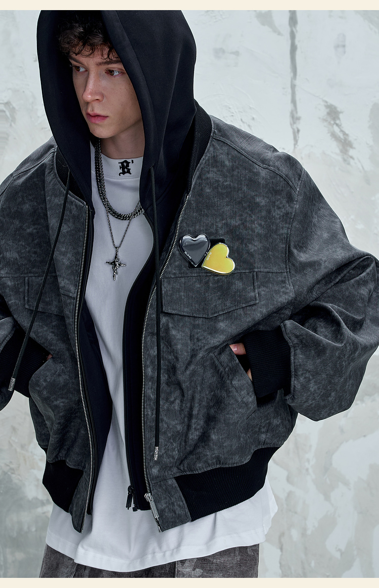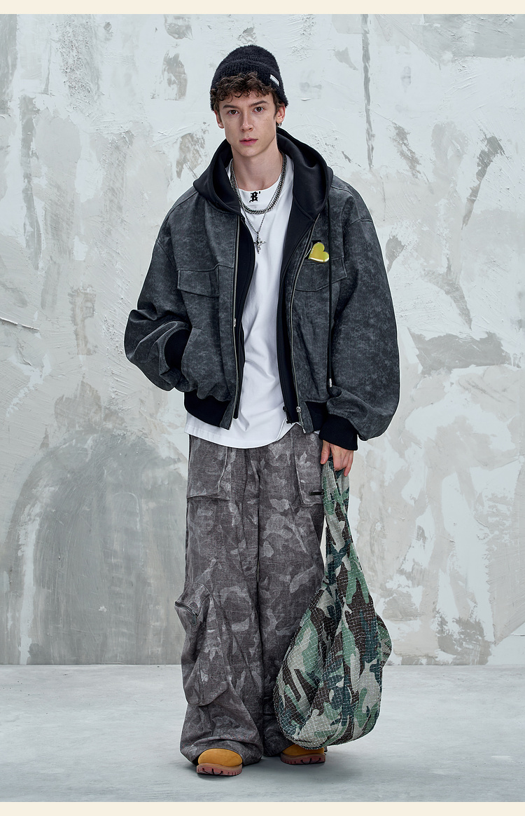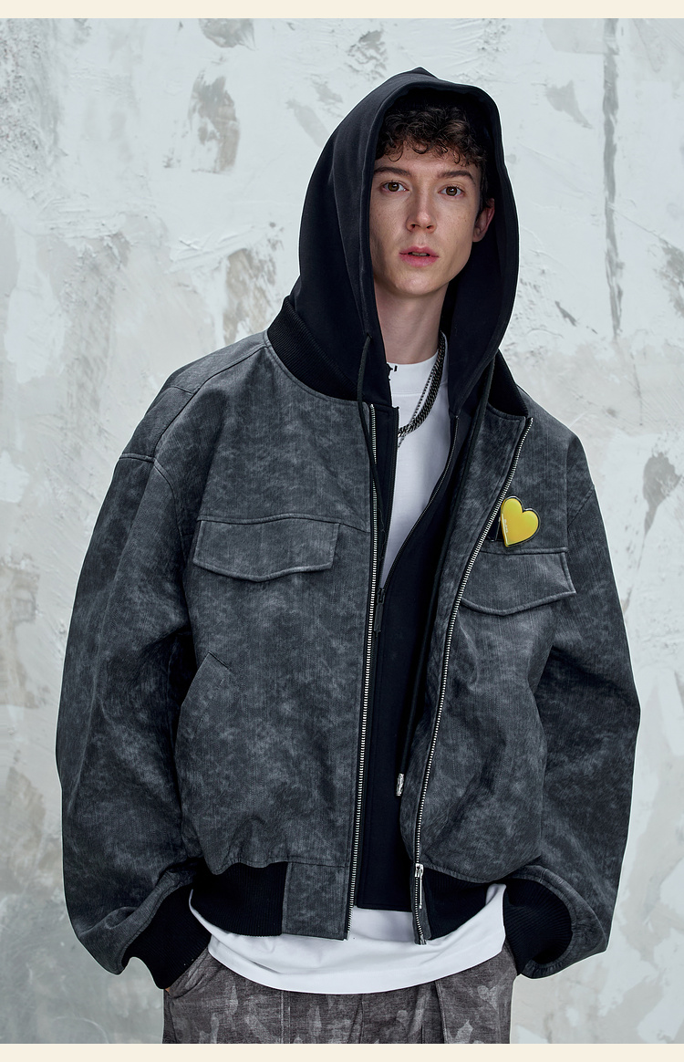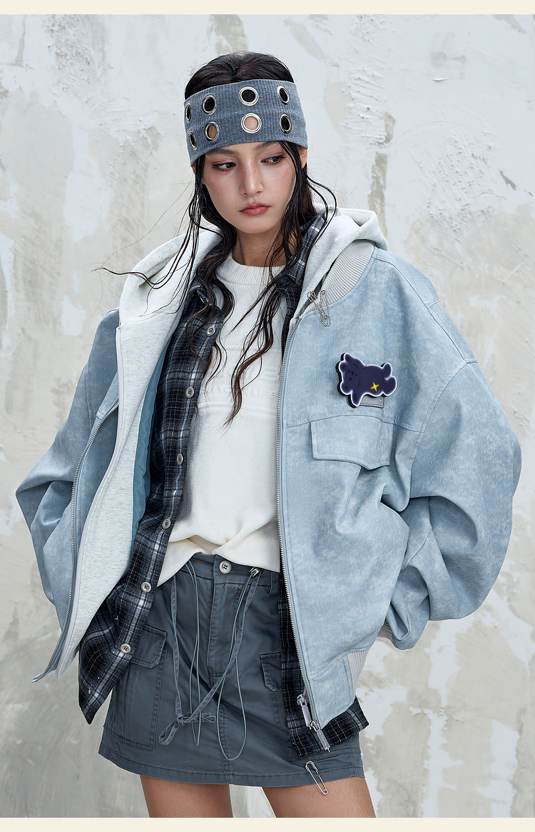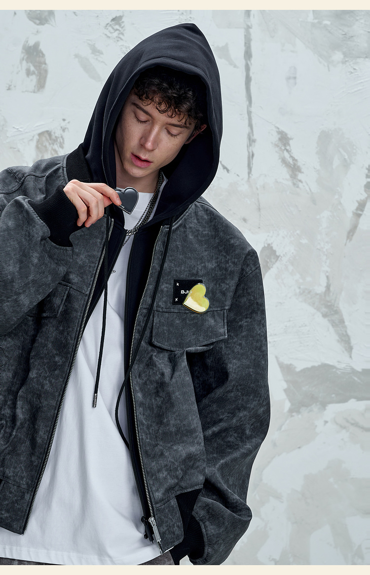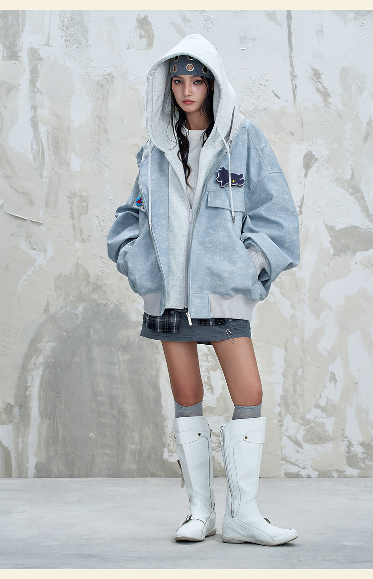 BJHG不计后果假两件夹克外套男款秋季复古做旧连帽休闲皮衣上衣女