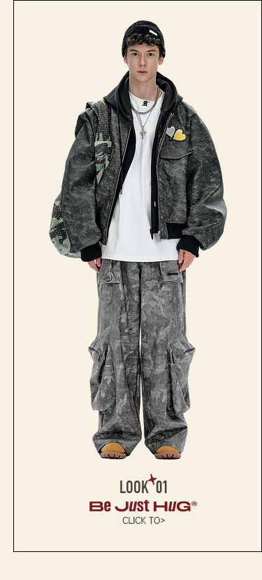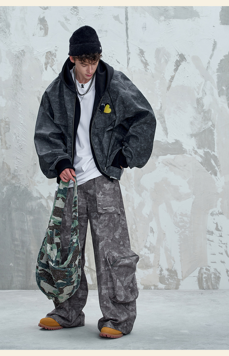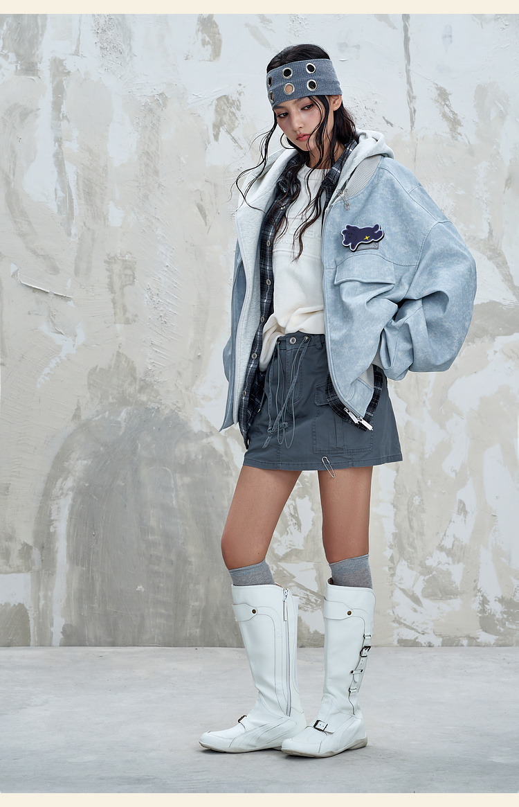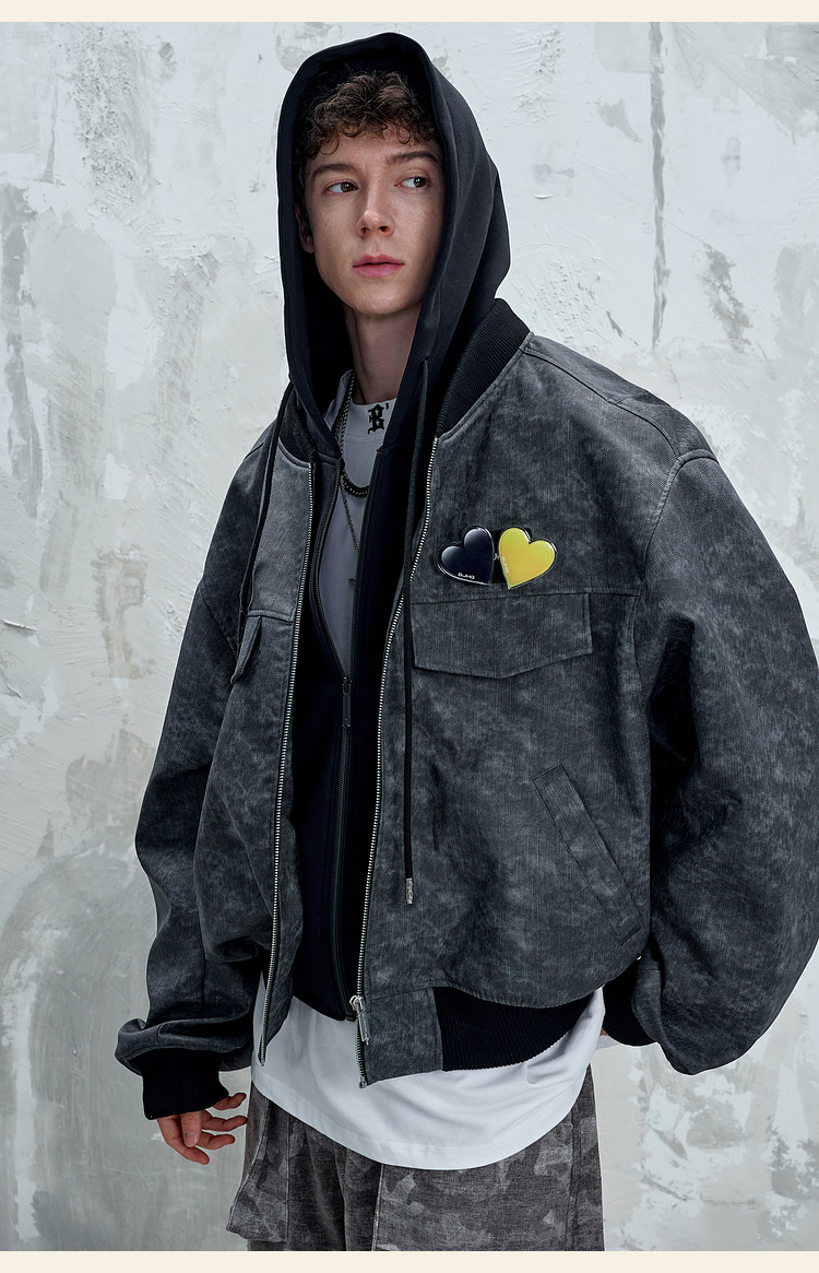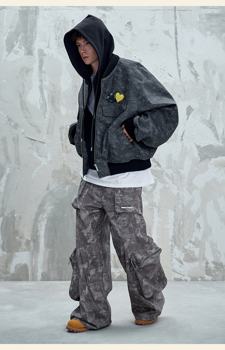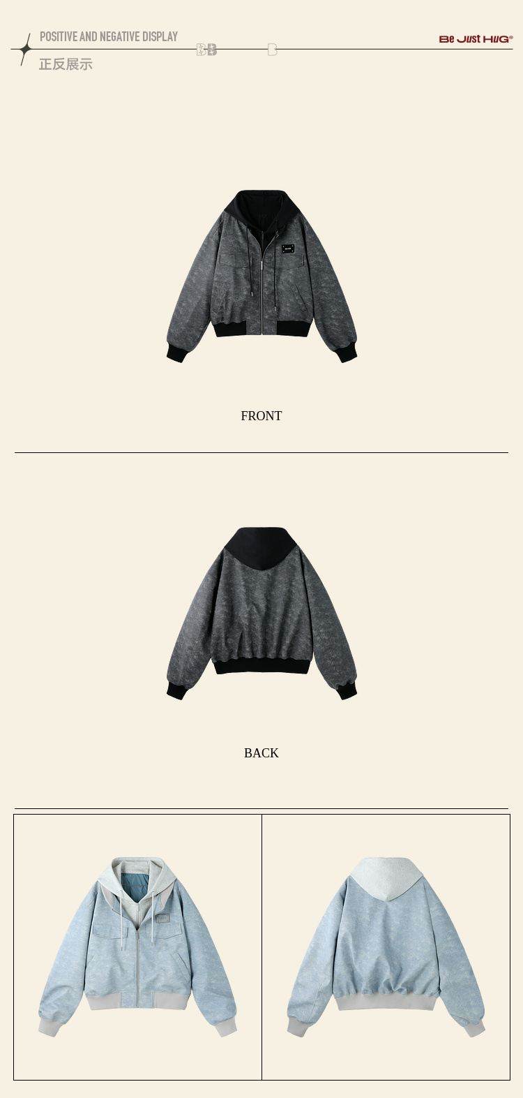 BJHG不计后果假两件夹克外套男款秋季复古做旧连帽休闲皮衣上衣女