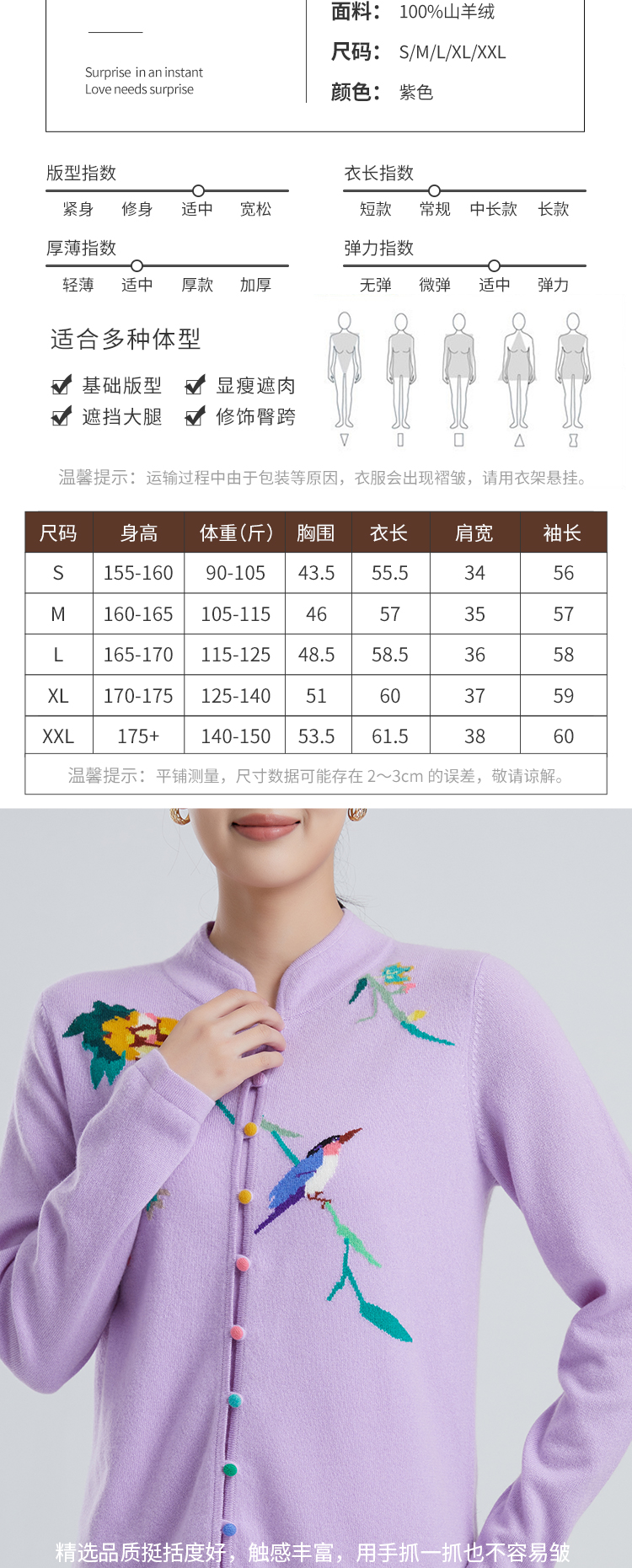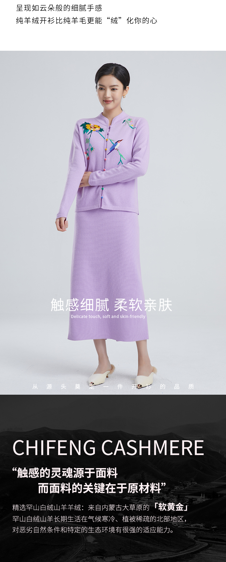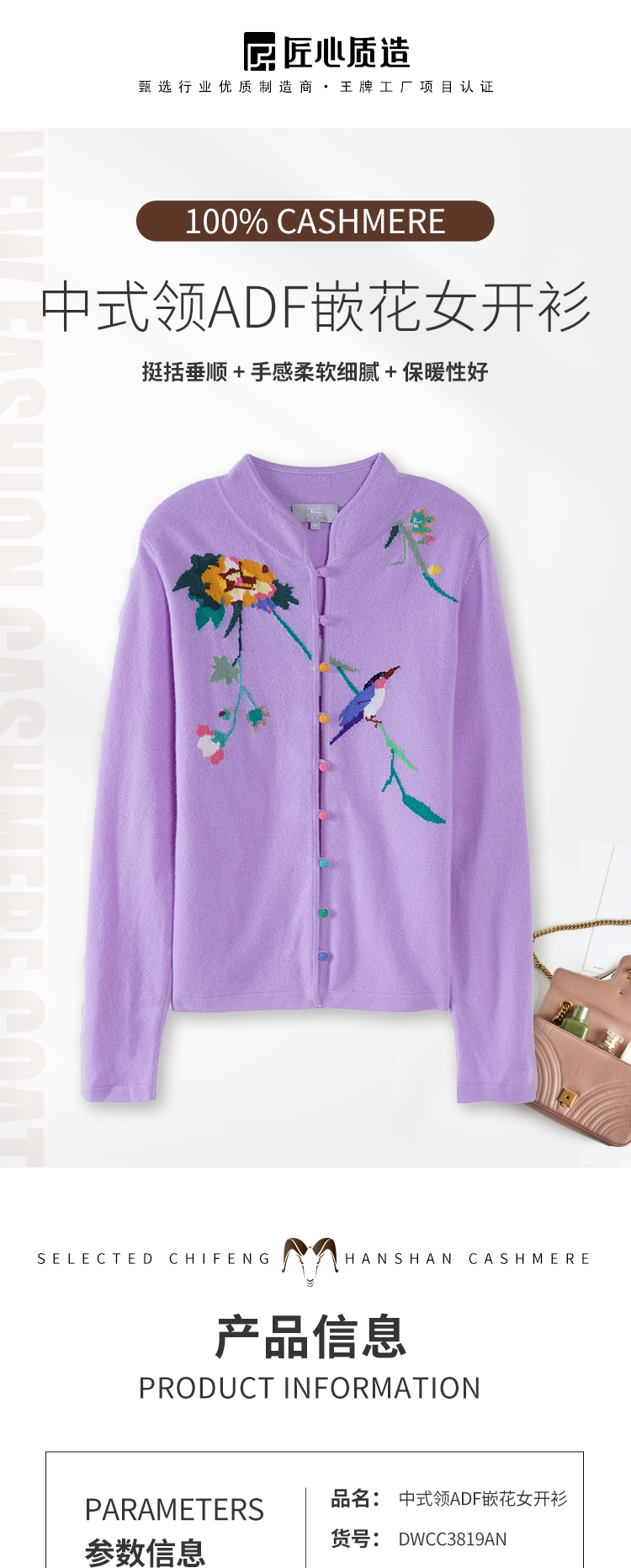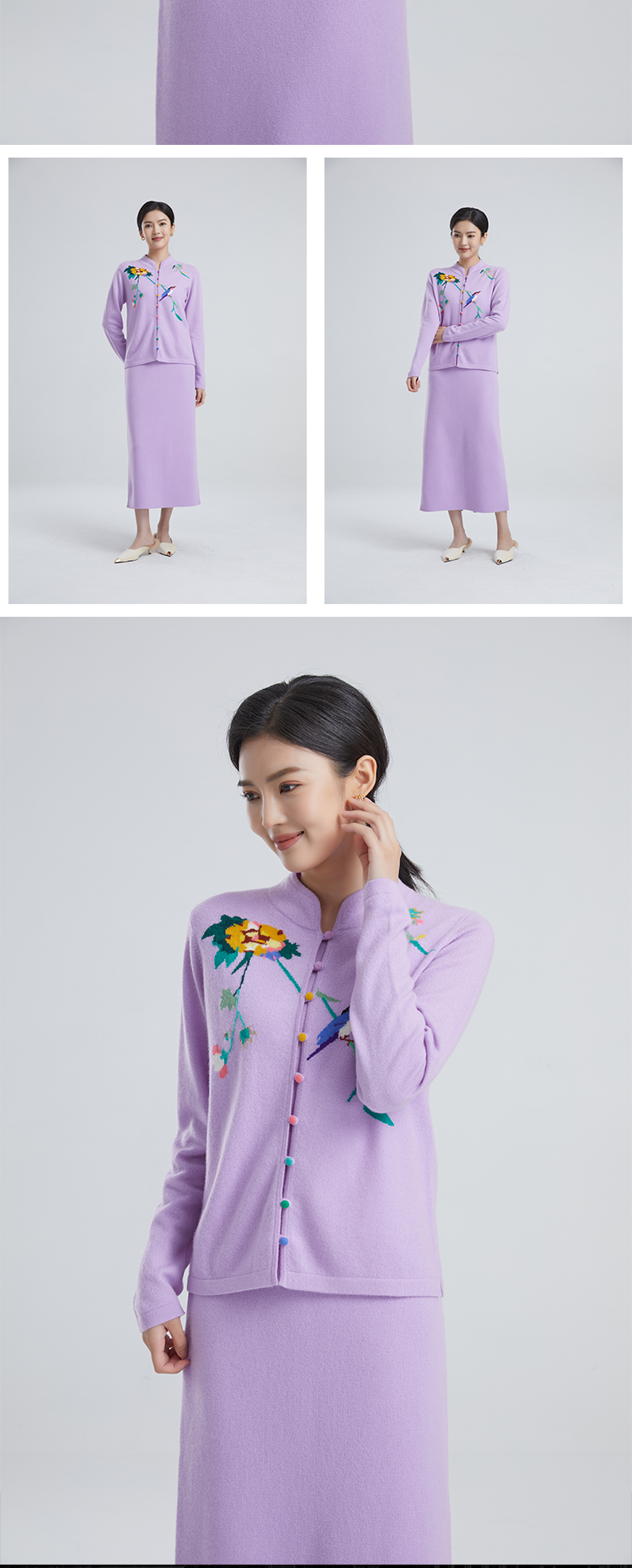 东黎 • 山羊绒女士春秋紫色嵌花中国风开衫 3819