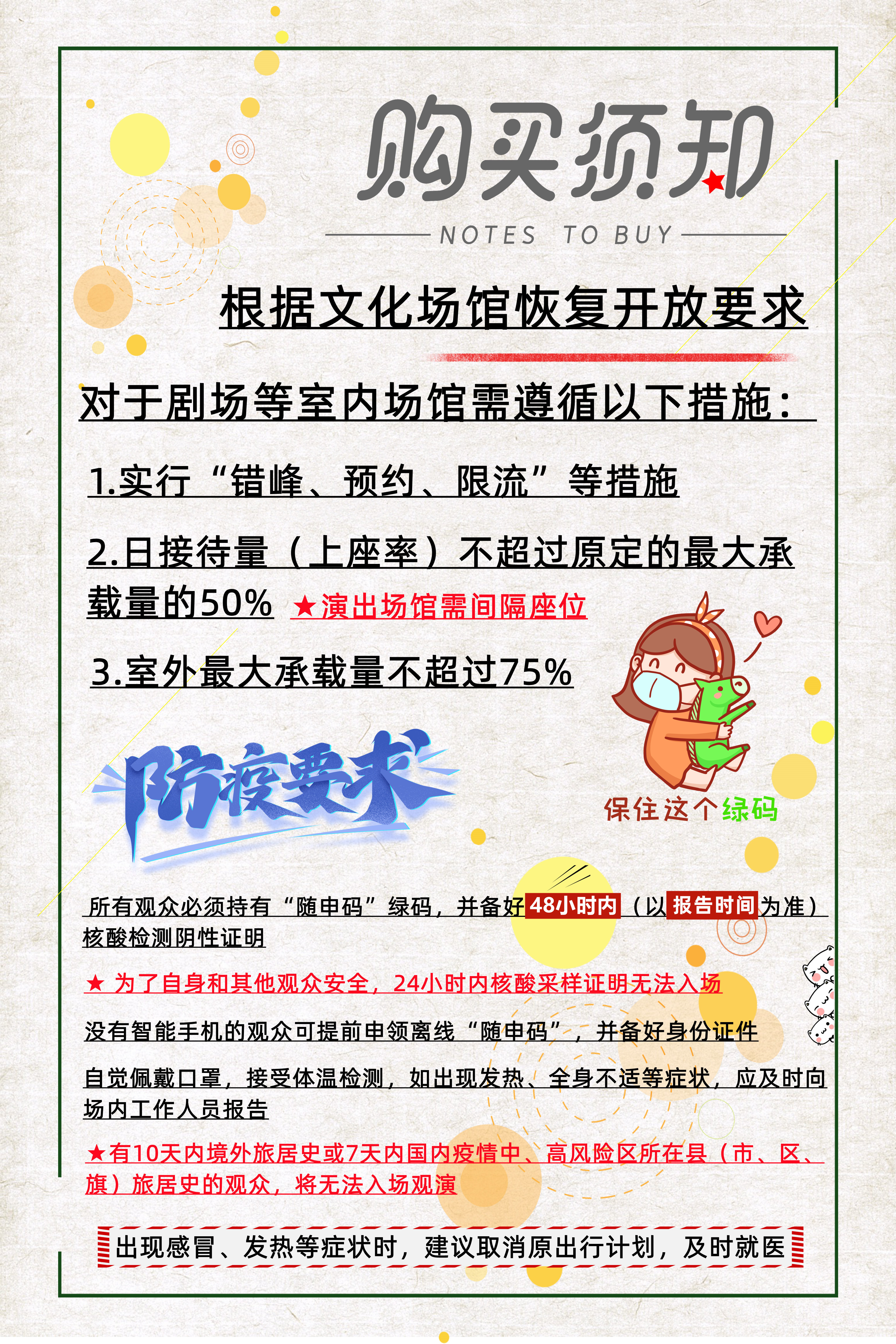 为切实做好疫情防控工作,剧场严格按照上海市演出场馆防控工作指南,做出如下购票须知: