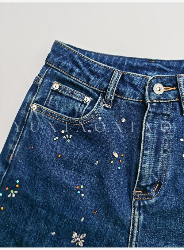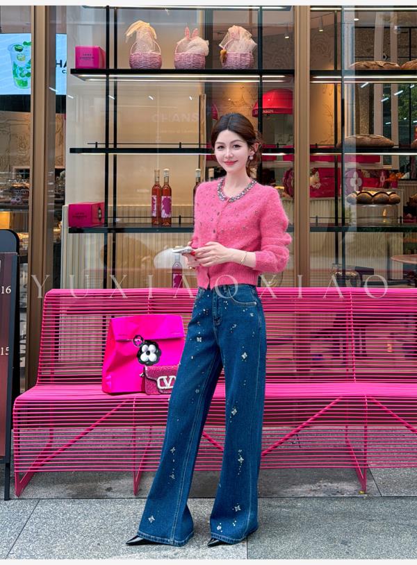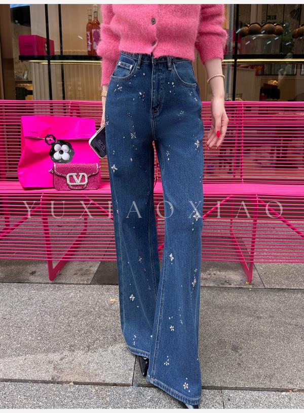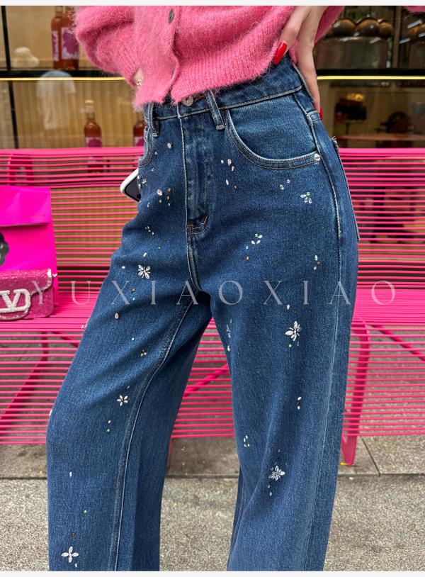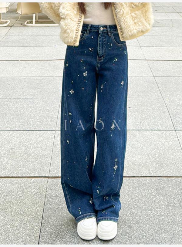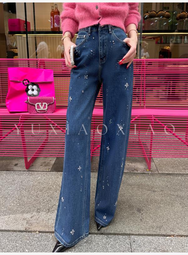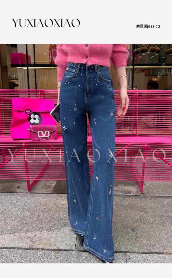 余潇潇【星光璀璨】棉感重工花朵烫钻百搭显瘦垂感直筒牛仔裤秋冬
