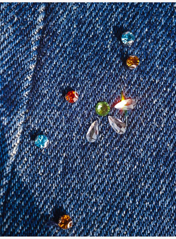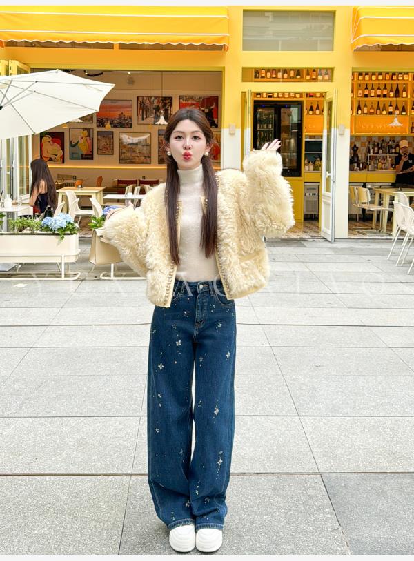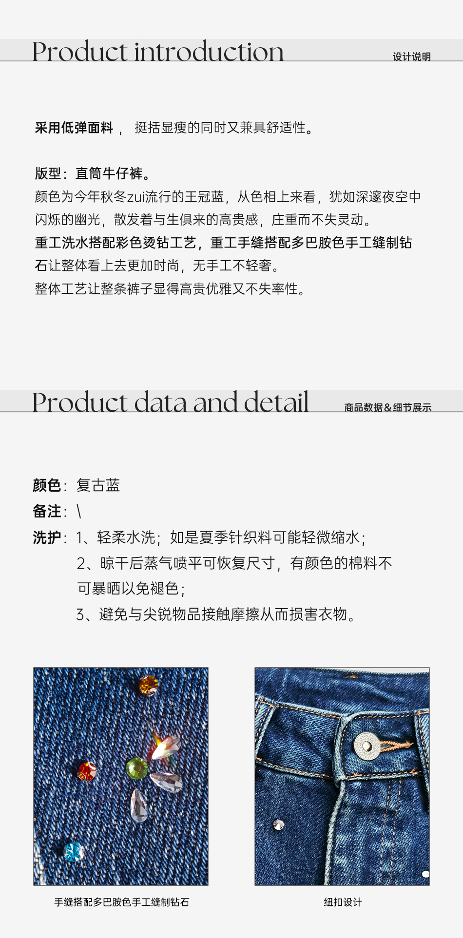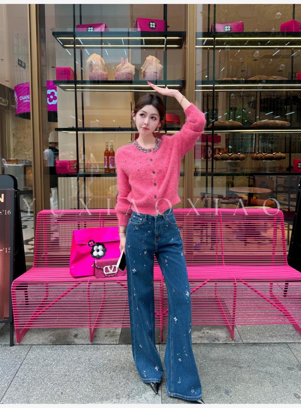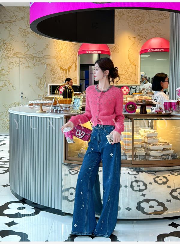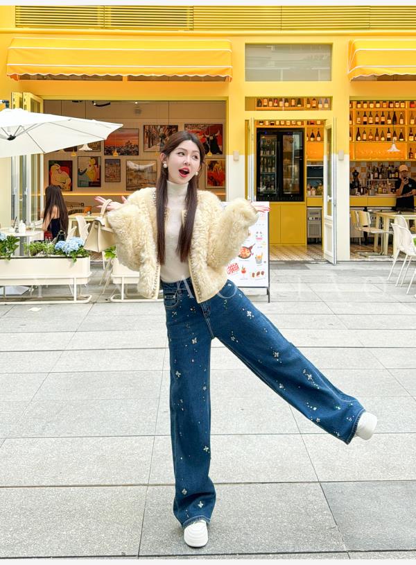 余潇潇【星光璀璨】棉感重工花朵烫钻百搭显瘦垂感直筒牛仔裤秋冬