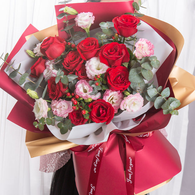 花材:绚烂 11朵红玫瑰,5支花边桔梗,尤加利,少量红豆搭配!