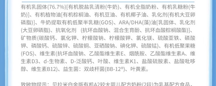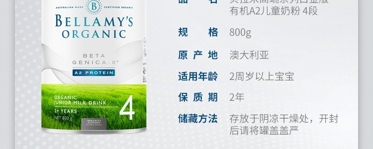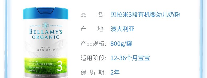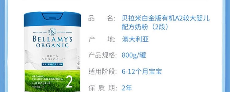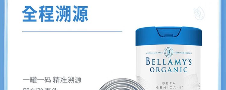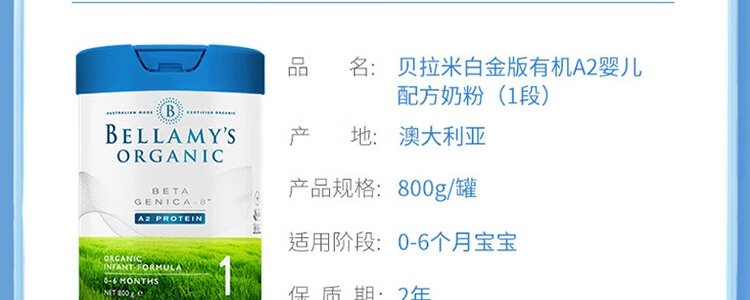 【保税】澳洲 白金版贝拉米(BELLAMY'S )有机A2奶粉 1段2段3段4段800g 罐装新包装 保税仓现货