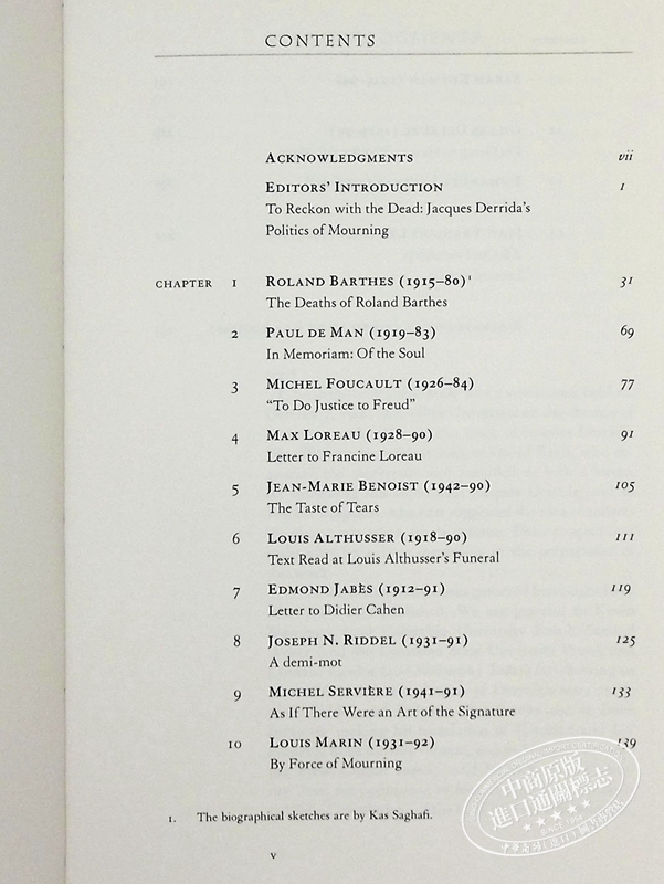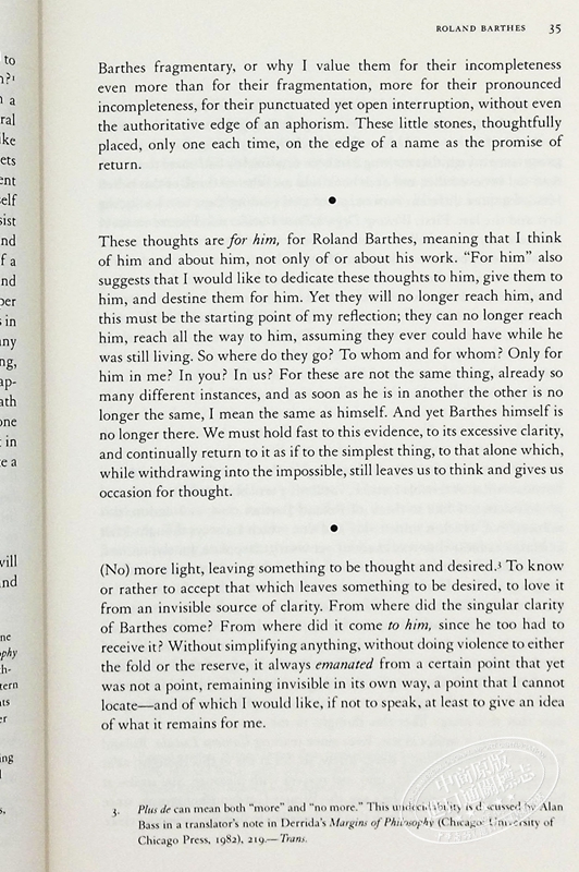在每一个案例中,他都敏锐地意识到在谈论死者时涉及的策略、品味和道德责任问题,以及为自己的目的、政治算计、个人恩怨和赎罪而利用这一场合的风险。这本书不仅仅是一本纪念性演讲集,它不仅揭示了德里达与过去四分之一世纪中一些杰出的法国思想家的关系,也揭示了德里达整个作品中一些重要的主题--悼念、"死亡的礼物"、时间、记忆和友谊本身。"在他对他的研究对象的工作和他们对他的影响的全神贯注中,这本书也对德里达自己在法国哲学史上的生活提供了一个犹豫和切入的复述。书中有一些富有启发性和趣味性的轶事,如利奥塔如何引导德里达开始使用文字处理机;保罗-德曼如何与德里达的儿子谈及爵士乐的知识。任何一个仍然认为德里达是个爱说笑的双关语的人,都会发现这种怨恨的偏见在阅读这部美丽的作品时无法存活。"
