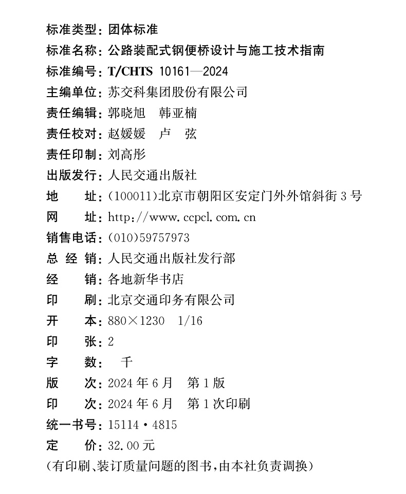 书名:公路装配式钢便桥设计与施工技术指南(T/CHTS 10161—2024)