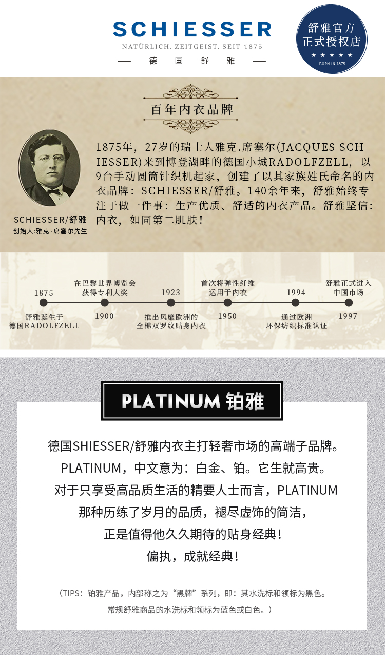 - 来自德国的SCHIESSER舒雅,专注做内衣一百四十余年,不遗余力的材料创新,因材而异的专业剪裁,健康环保的加工技术以及充满文化关注的时尚主题,做你认识之外的舒适内衣。