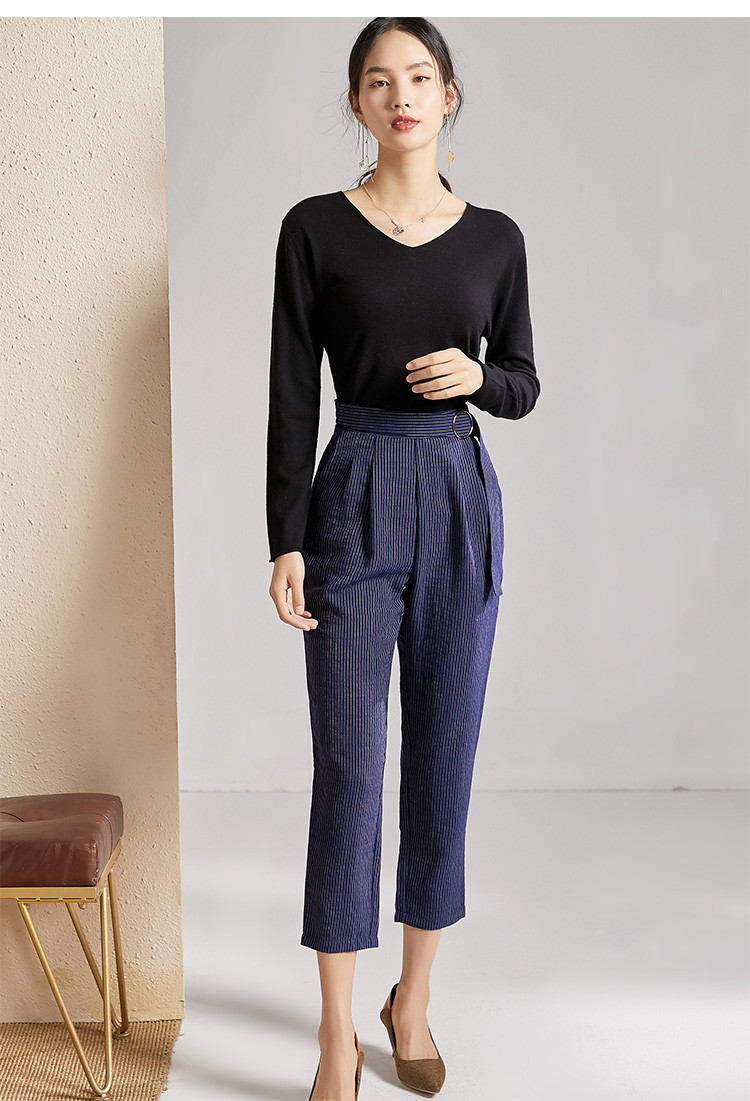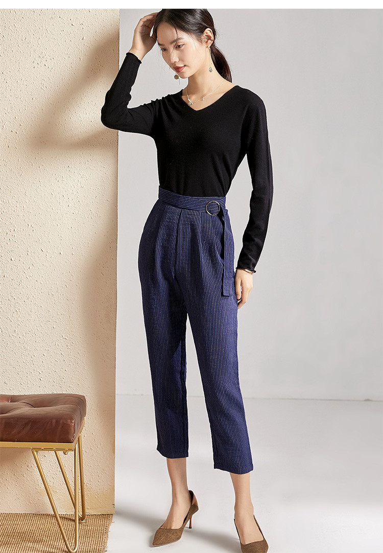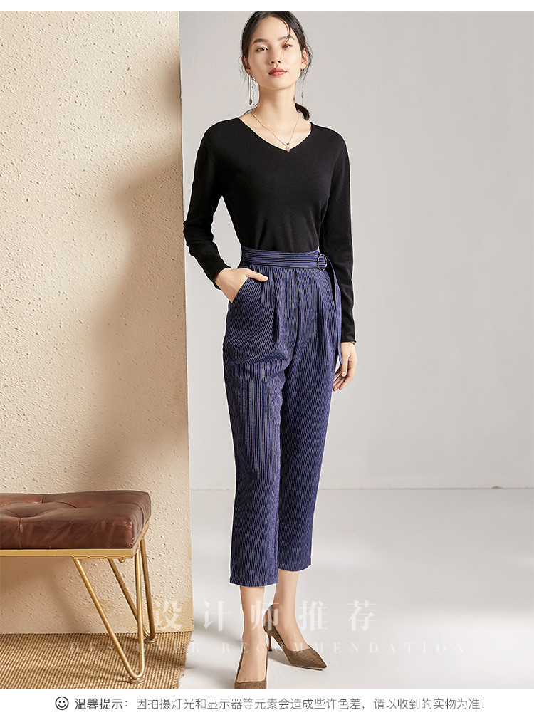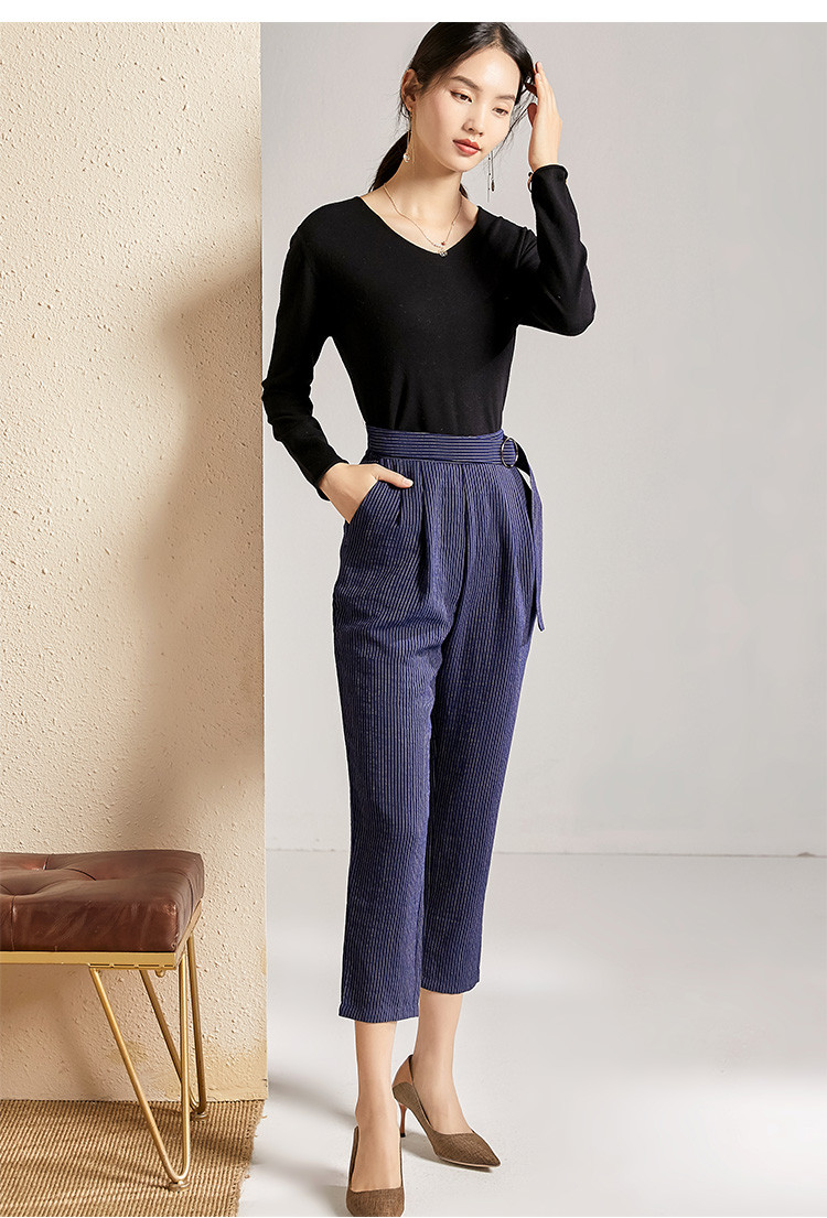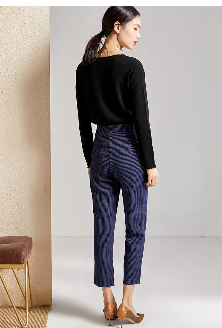 剩S 芳外春秋款竖条纹显瘦休闲裤女系带高腰时尚百搭女裤子