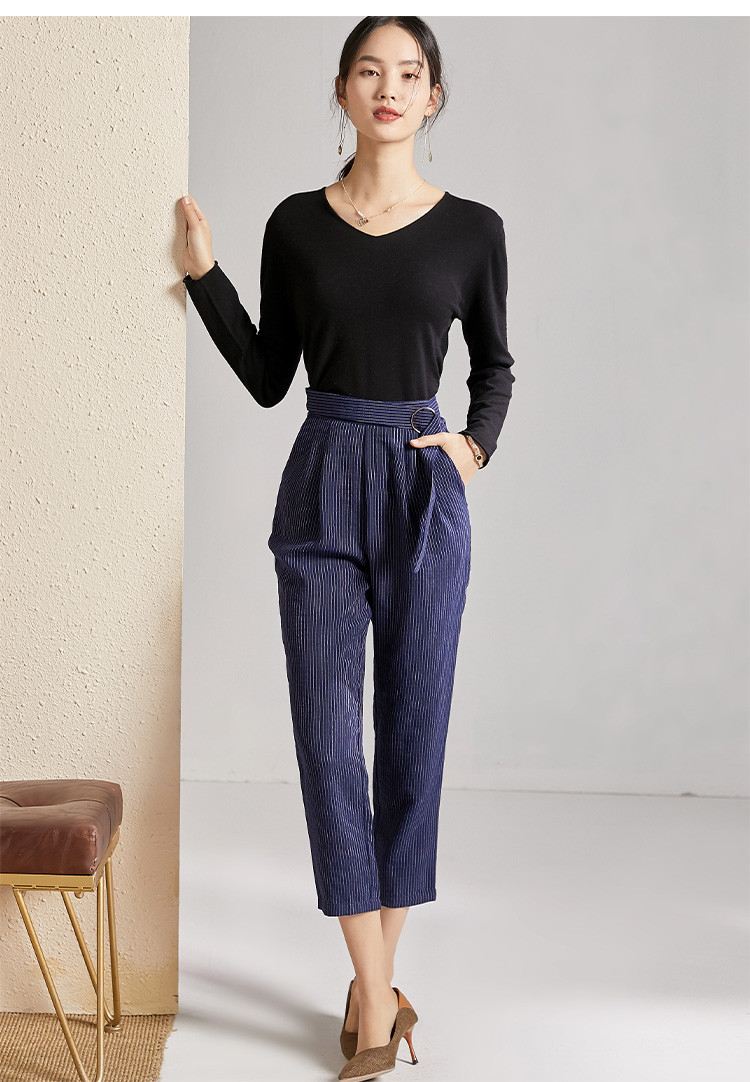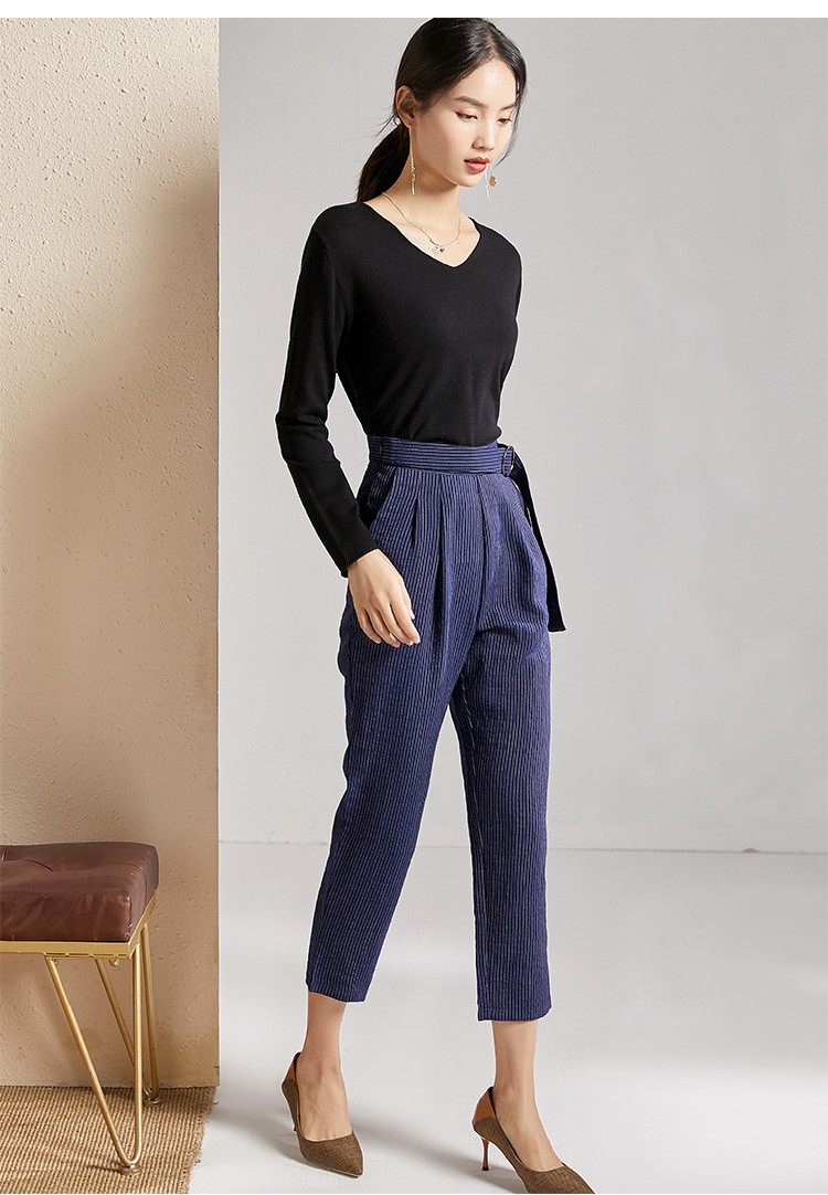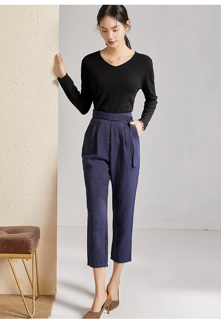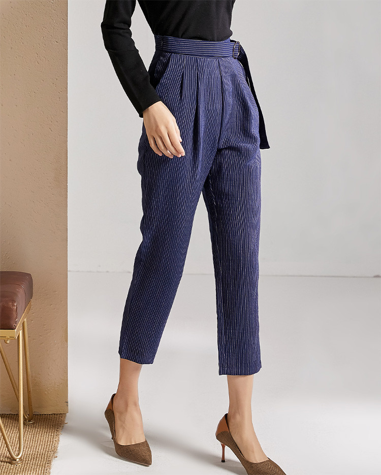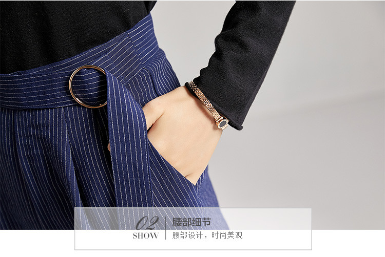 剩S 芳外春秋款竖条纹显瘦休闲裤女系带高腰时尚百搭女裤子