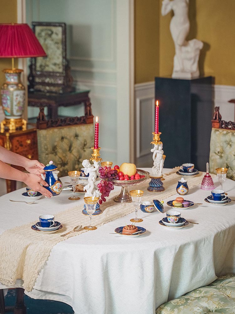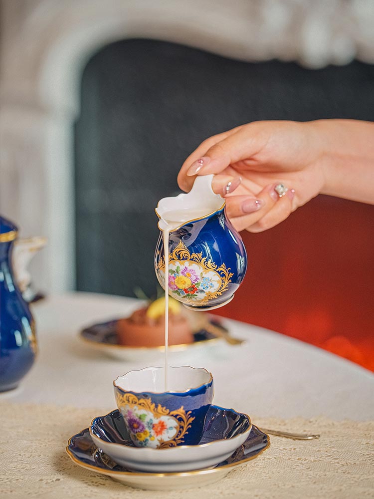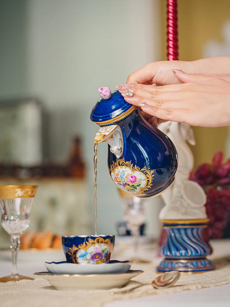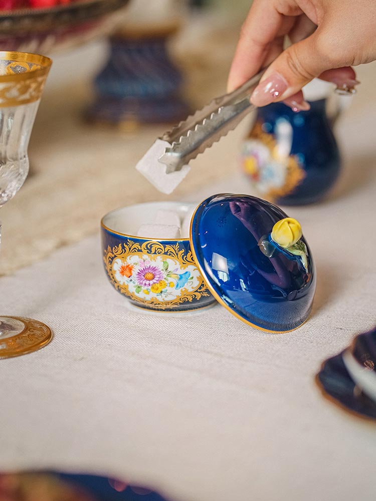 20世纪德国著名瓷窑梅森Meissen出品钴蓝釉描金手绘德国之花下午茶摩卡八人瓷器套件