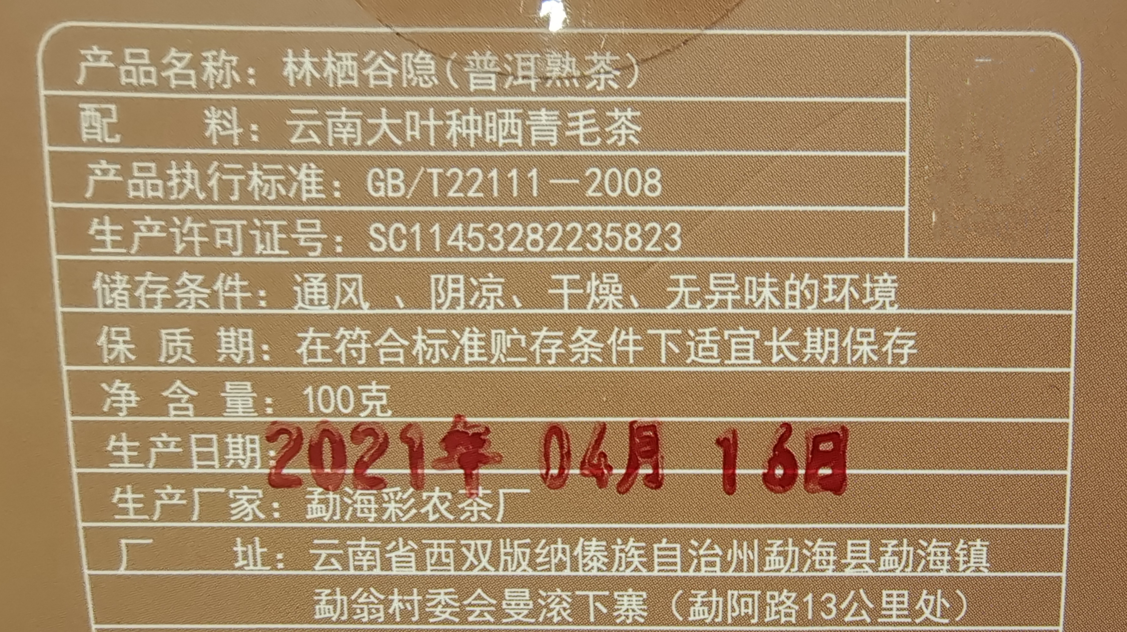 选2019春勐海高山优质乔木原料,彩农茶核心工艺发酵而成,经2年余自然仓储醇化后,方于2021年压制而成。