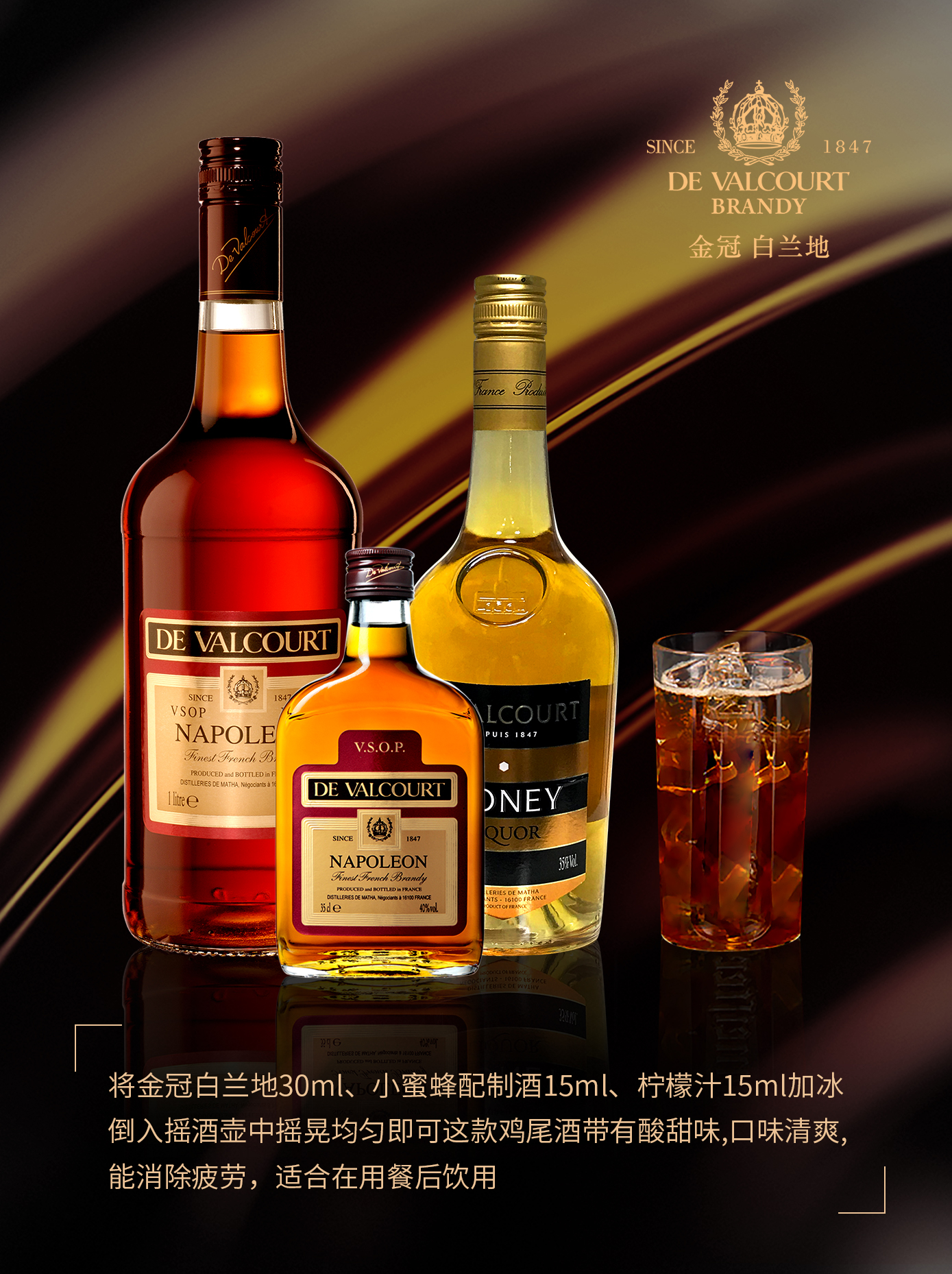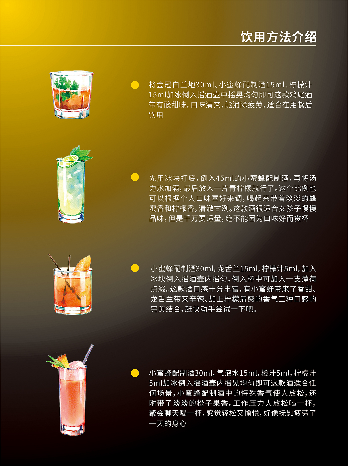 小蜜蜂是法国第五大烈酒集团DISTILLERIES DE MATHA推出的一款采用天然蜂蜜和陈年白兰地调配而成的产品,入口即可感受到淡淡的茉莉花香与天然蜂蜜的香味,与陈年白兰地的醇厚融合,甜蜜而浓烈。