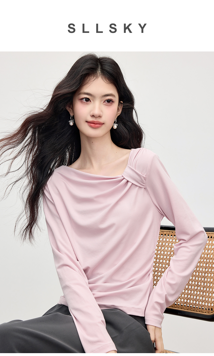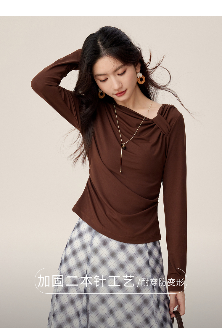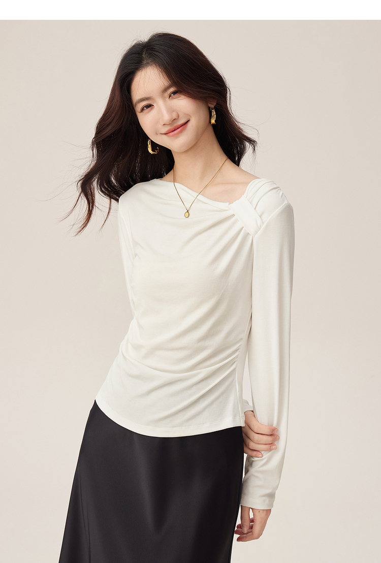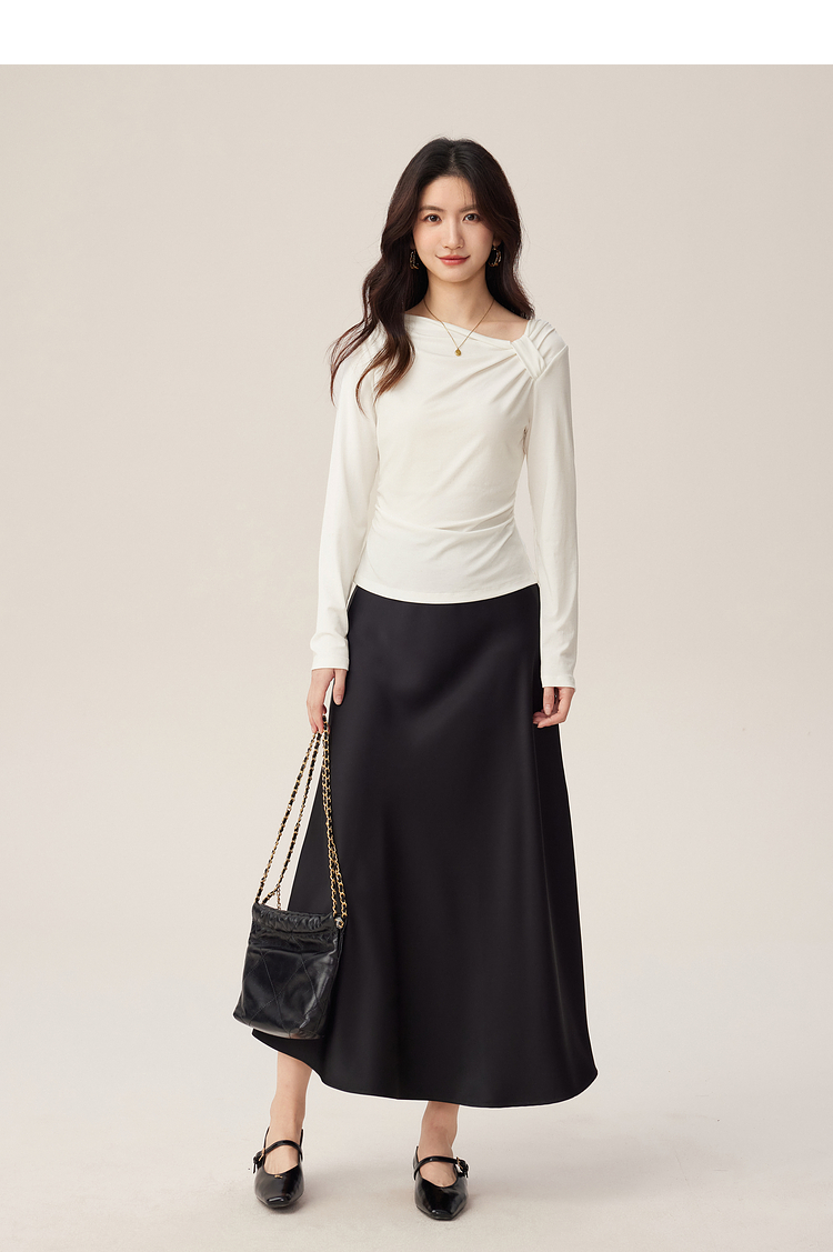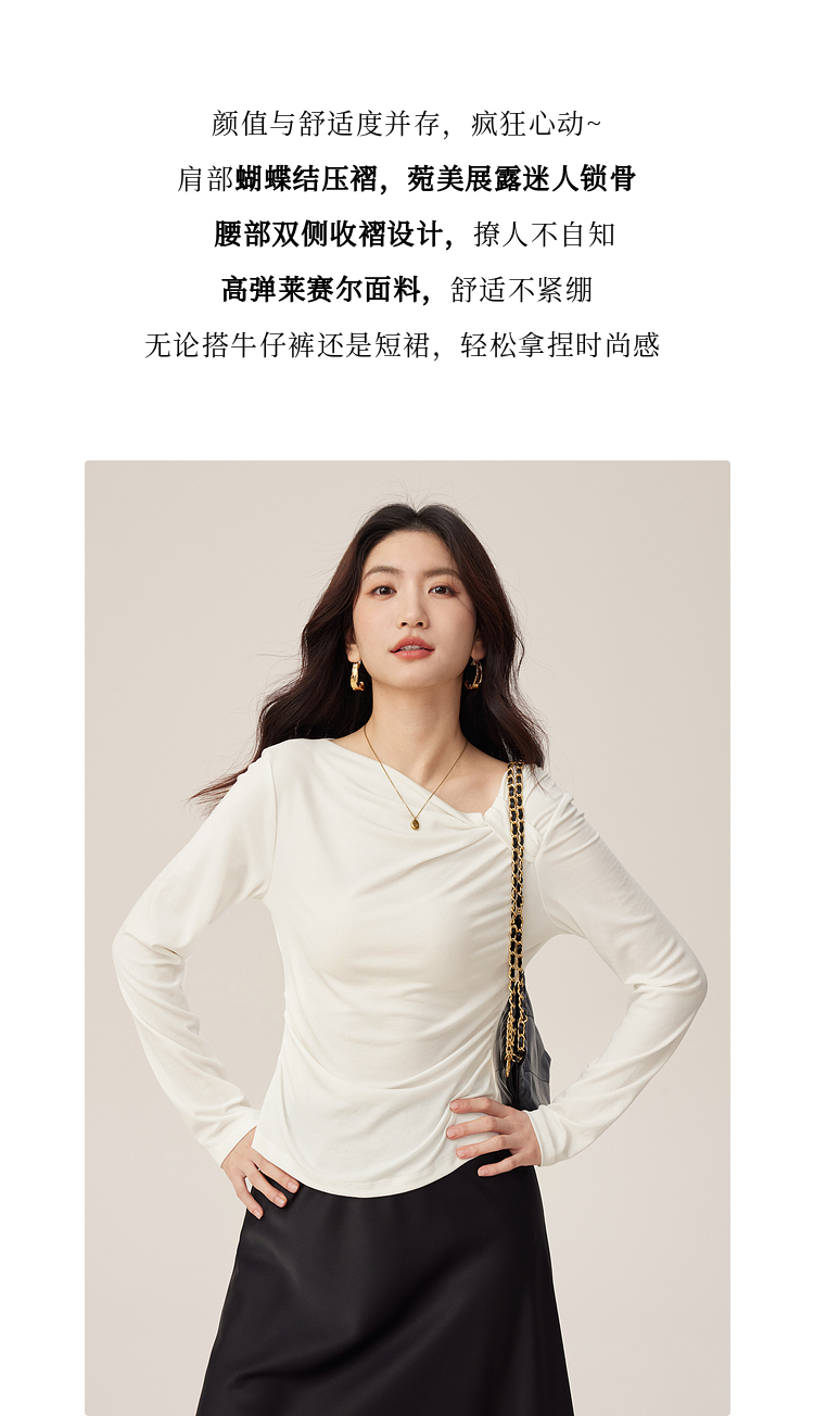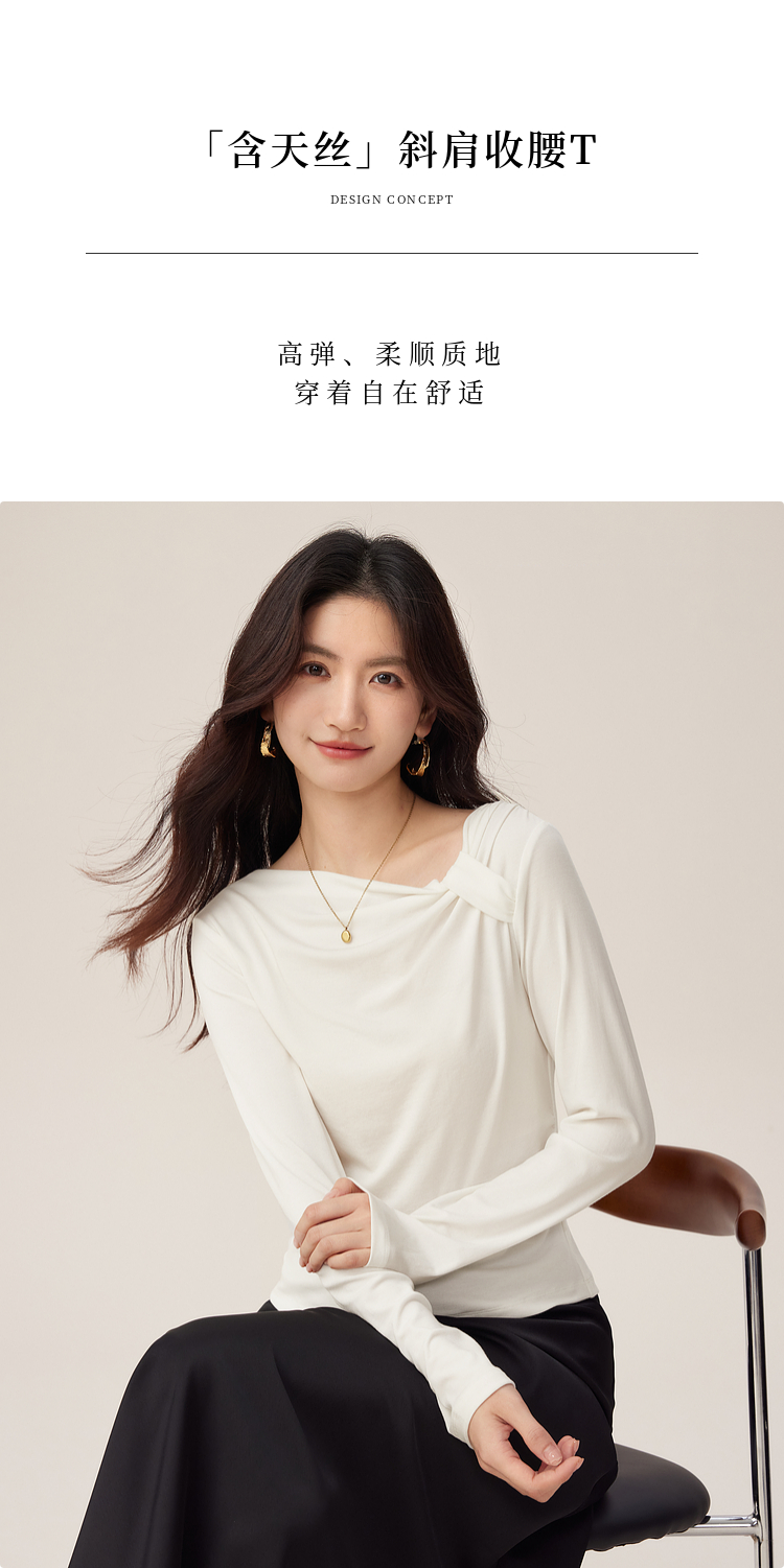 【周四狂欢价】熙世界独特别致斜肩天丝T恤女长袖2025早秋新款气质修身收腰上衣