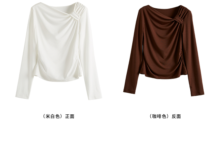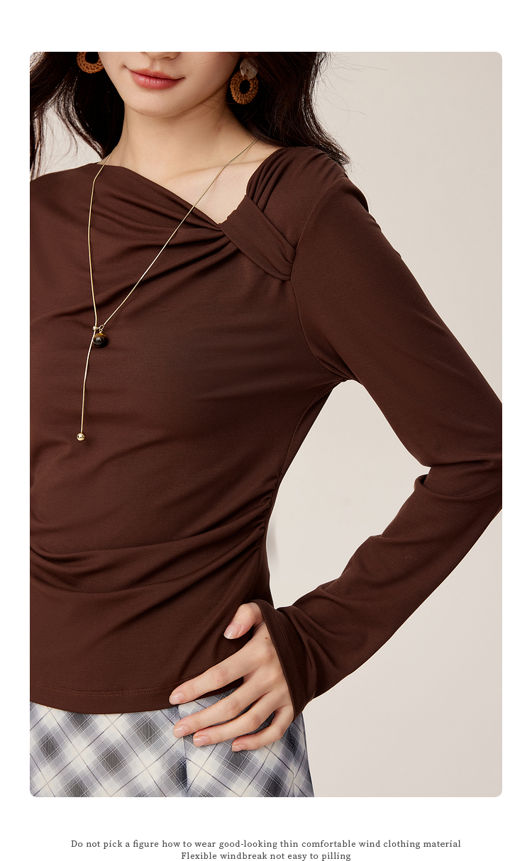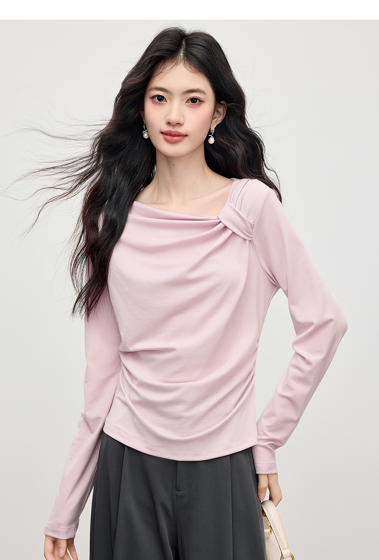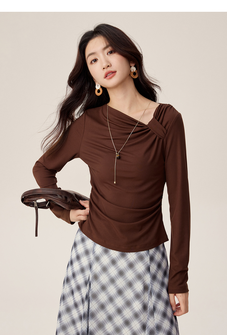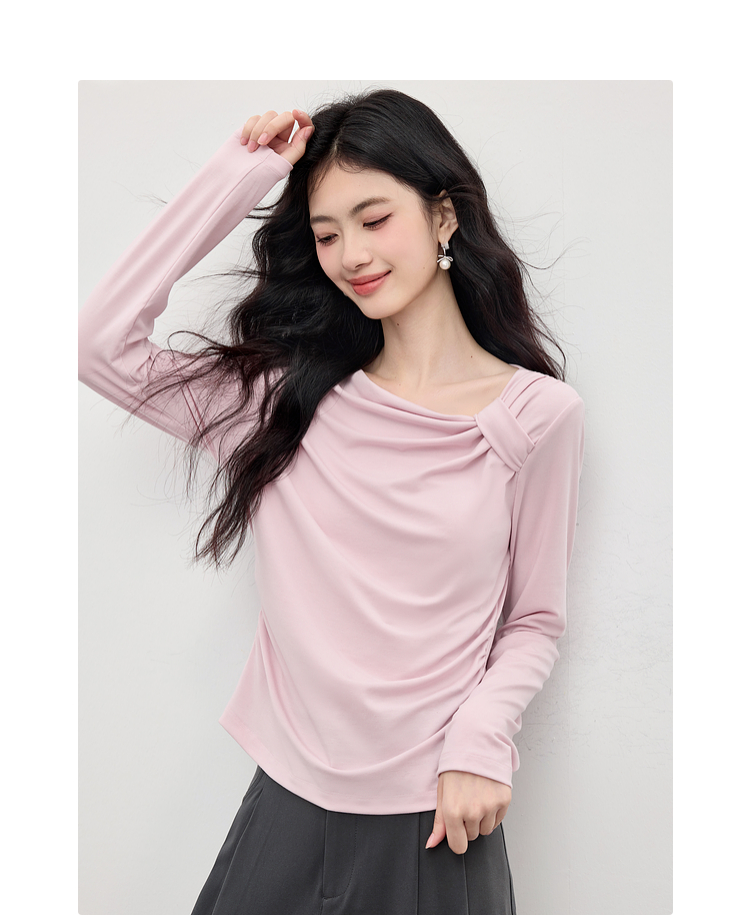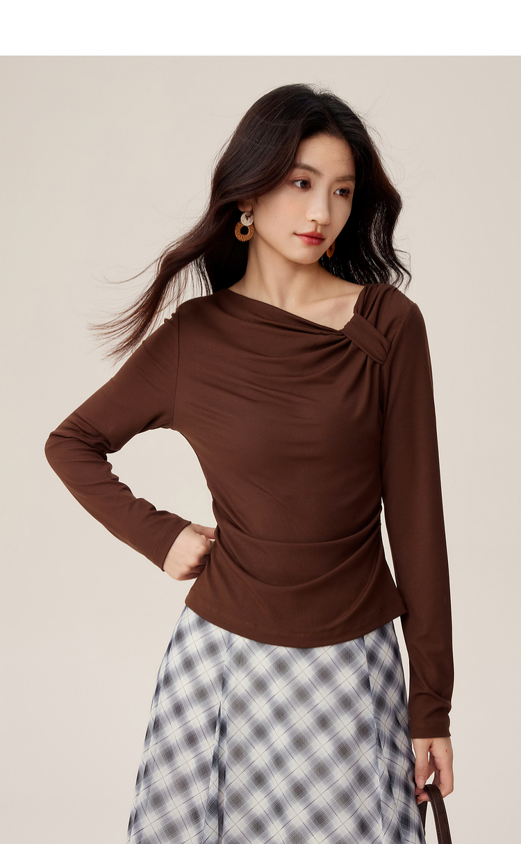 【周四狂欢价】熙世界独特别致斜肩天丝T恤女长袖2025早秋新款气质修身收腰上衣