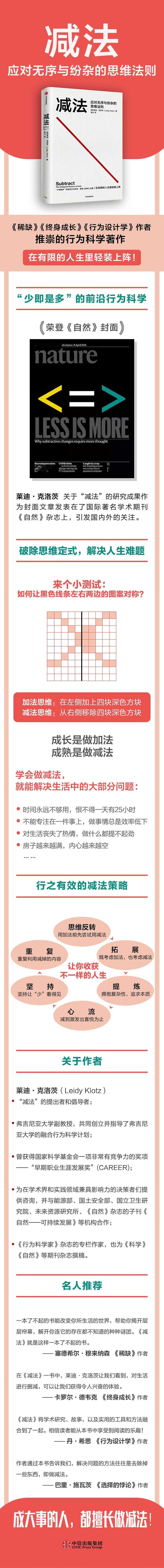 本书作者莱迪·克洛茨开创性提出减法概念,并且他关于“减法”的研究成果作为封面文章发表在了国际著名学术期刊《自然》杂志上,引发国内外的关注。