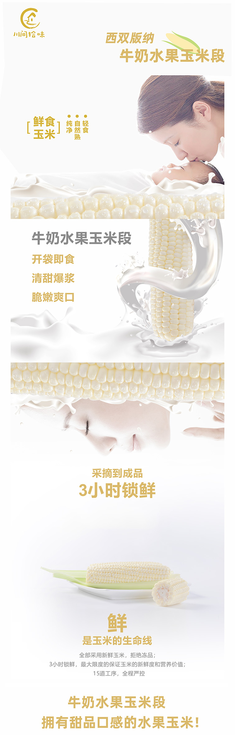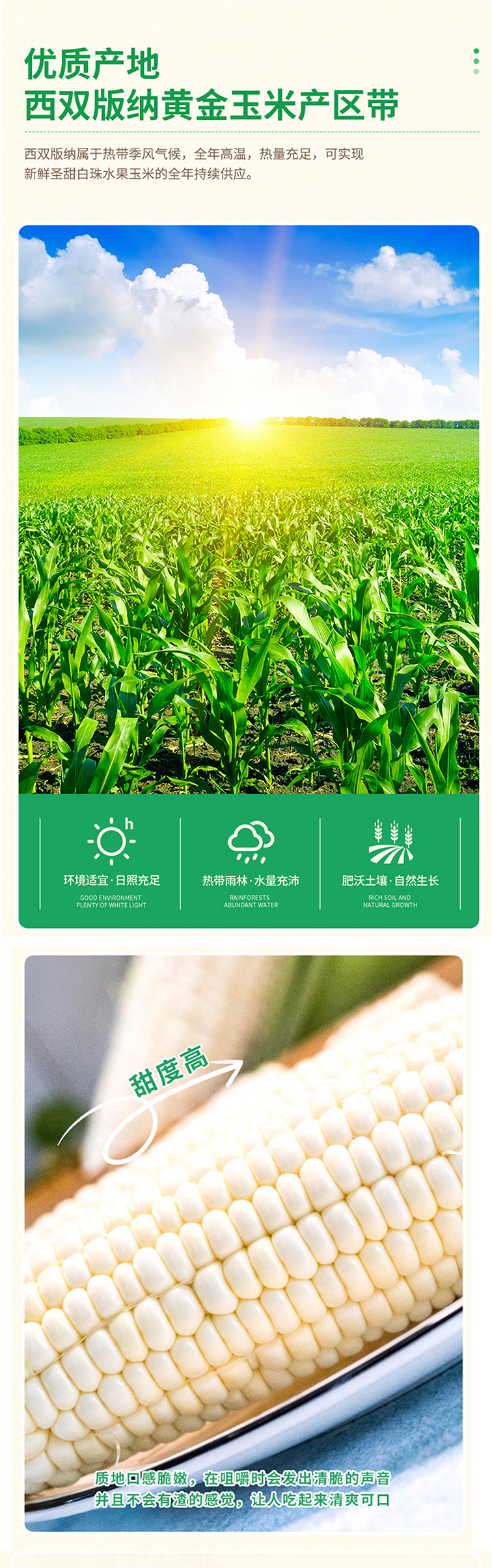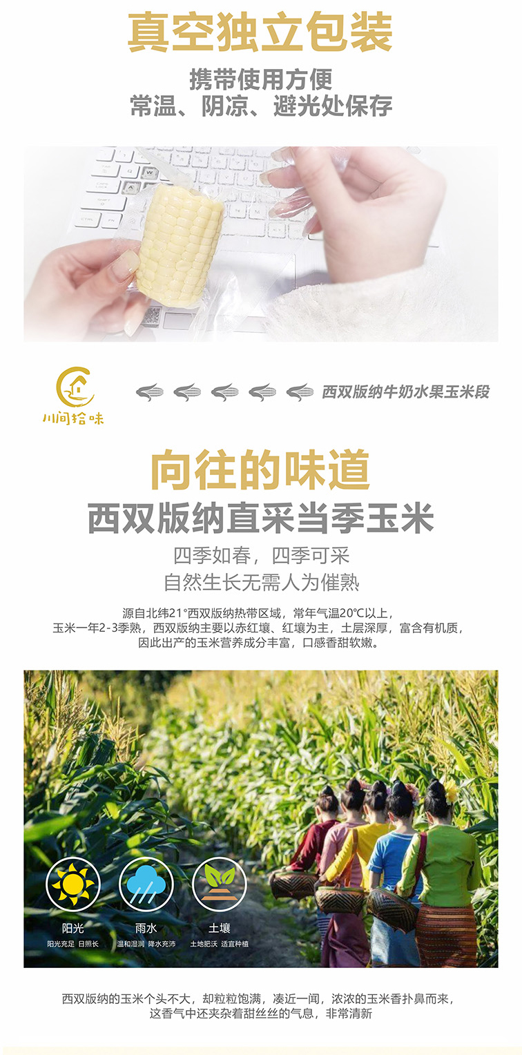 体型较普通水果玉米更为小巧,色洁白如珍珠,籽粒饱满亮白,果衣更薄,清甜多汁,带有牛奶香甜味。