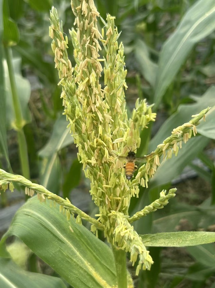 蜜蜂挂在未成熟的玉米穗上,天然授粉~