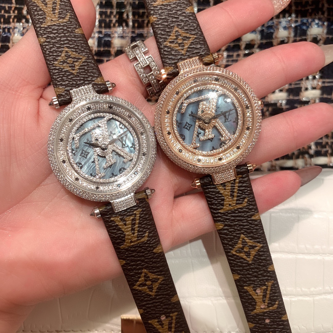 LV时来运转 满钻最高版本—时来运转系列 让你时时刻刻都时来运转 好运转到你身边,不停的旋转着表盘 非常炫耀漂亮,搭配顶级原装瑞士机芯,走时精准 采用拱形蓝宝石镜面 316L精钢表壳 表带进口意大利牛皮带 表盘直径38mm 厚度12mm 30米防水