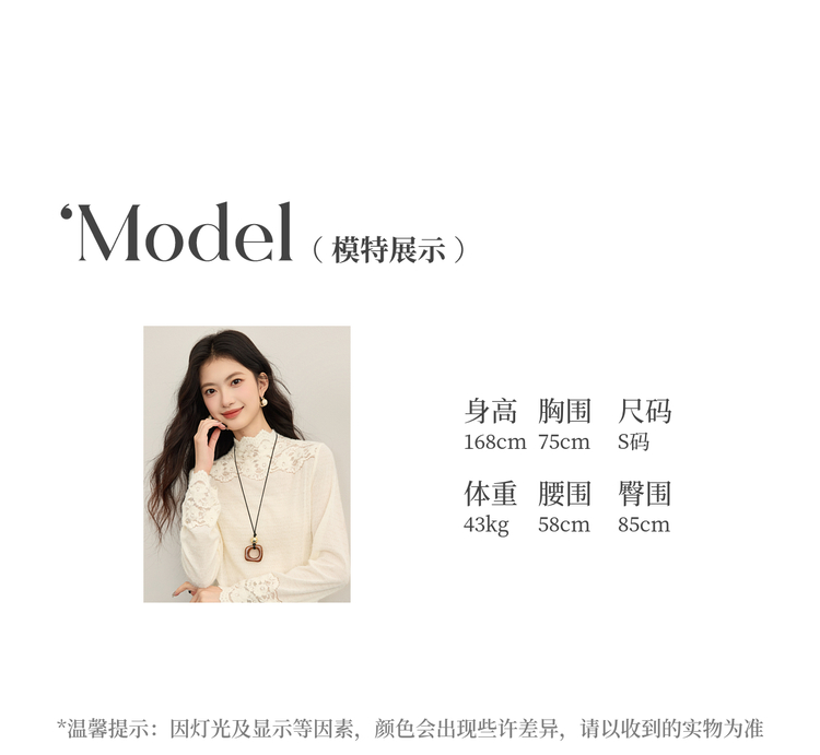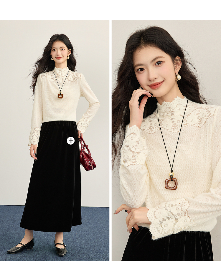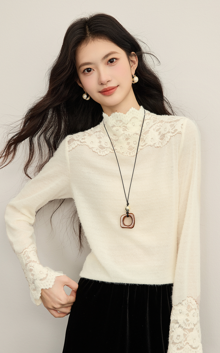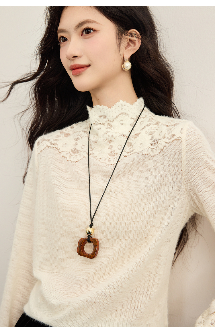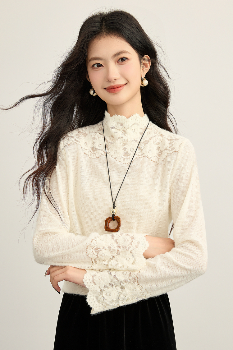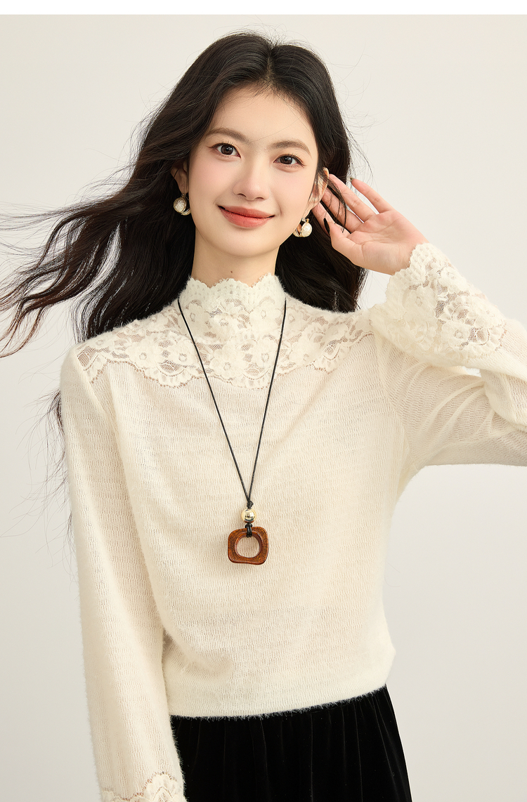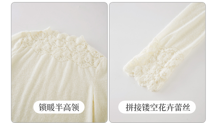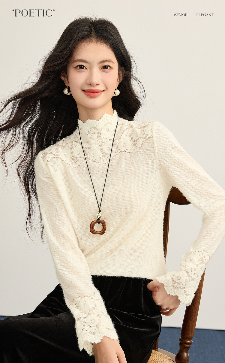 【12/10新品6折】熙世界花边半高领蕾丝打底衫秋冬女装高级感优雅韩系气质长袖上衣