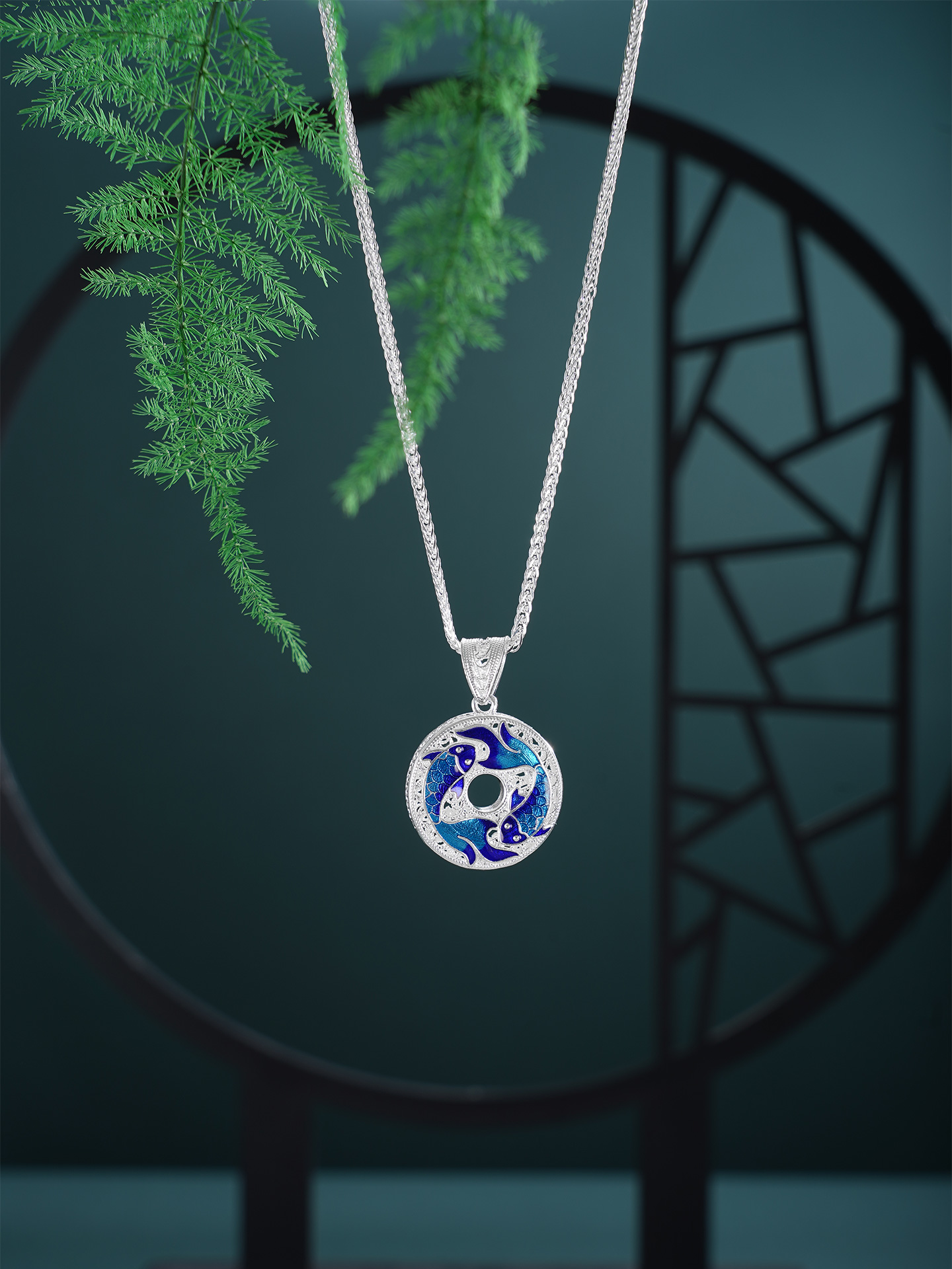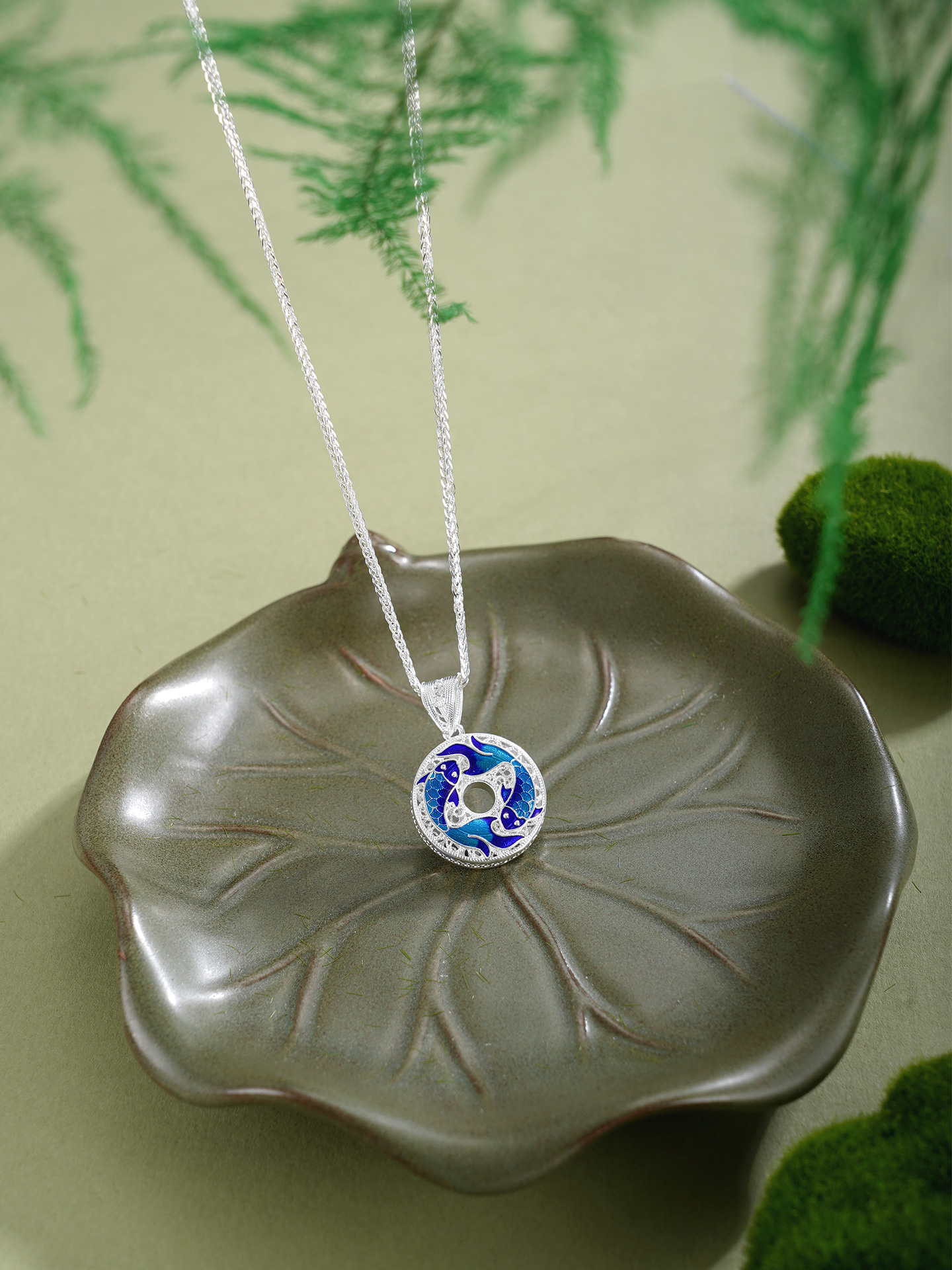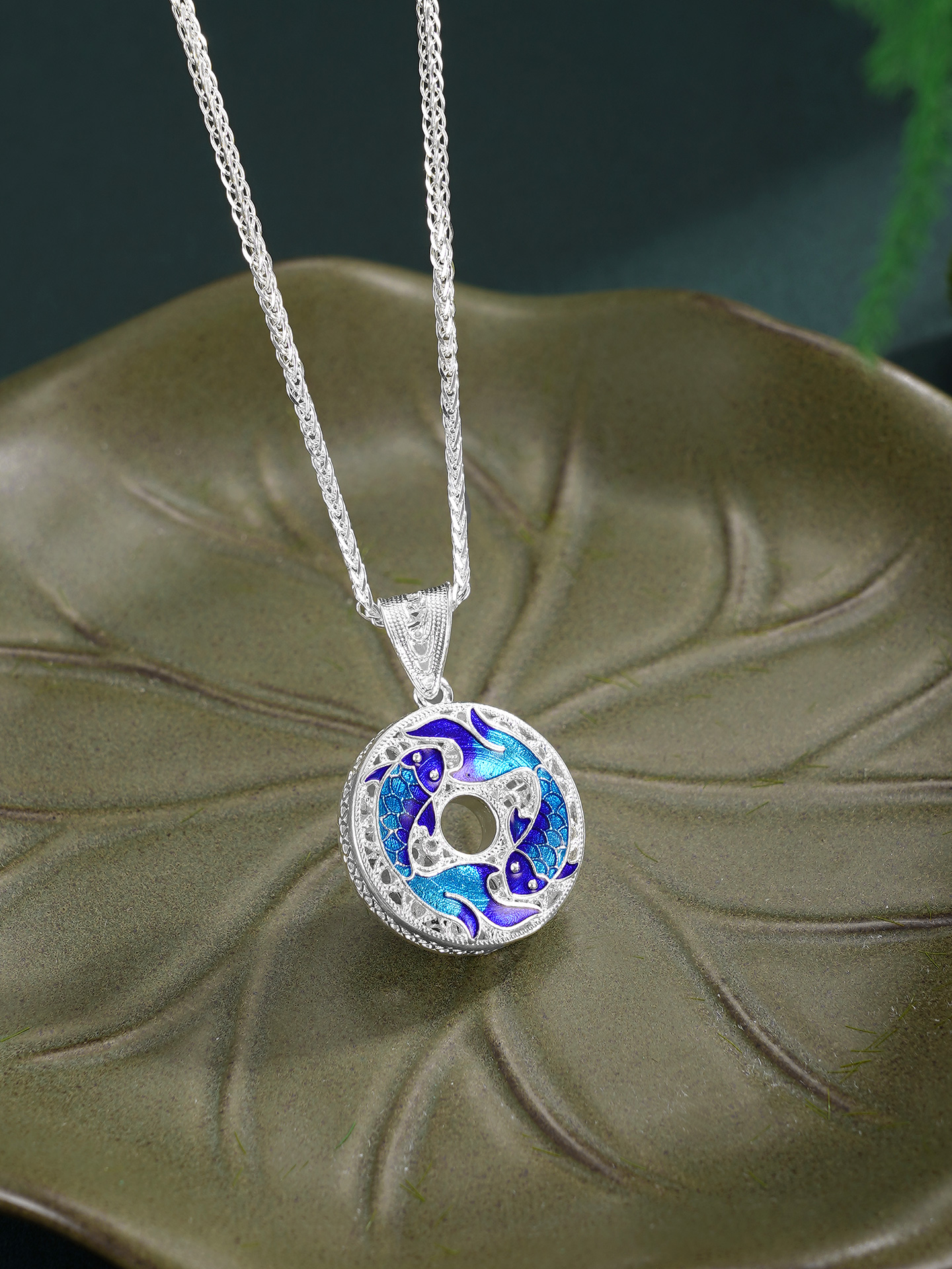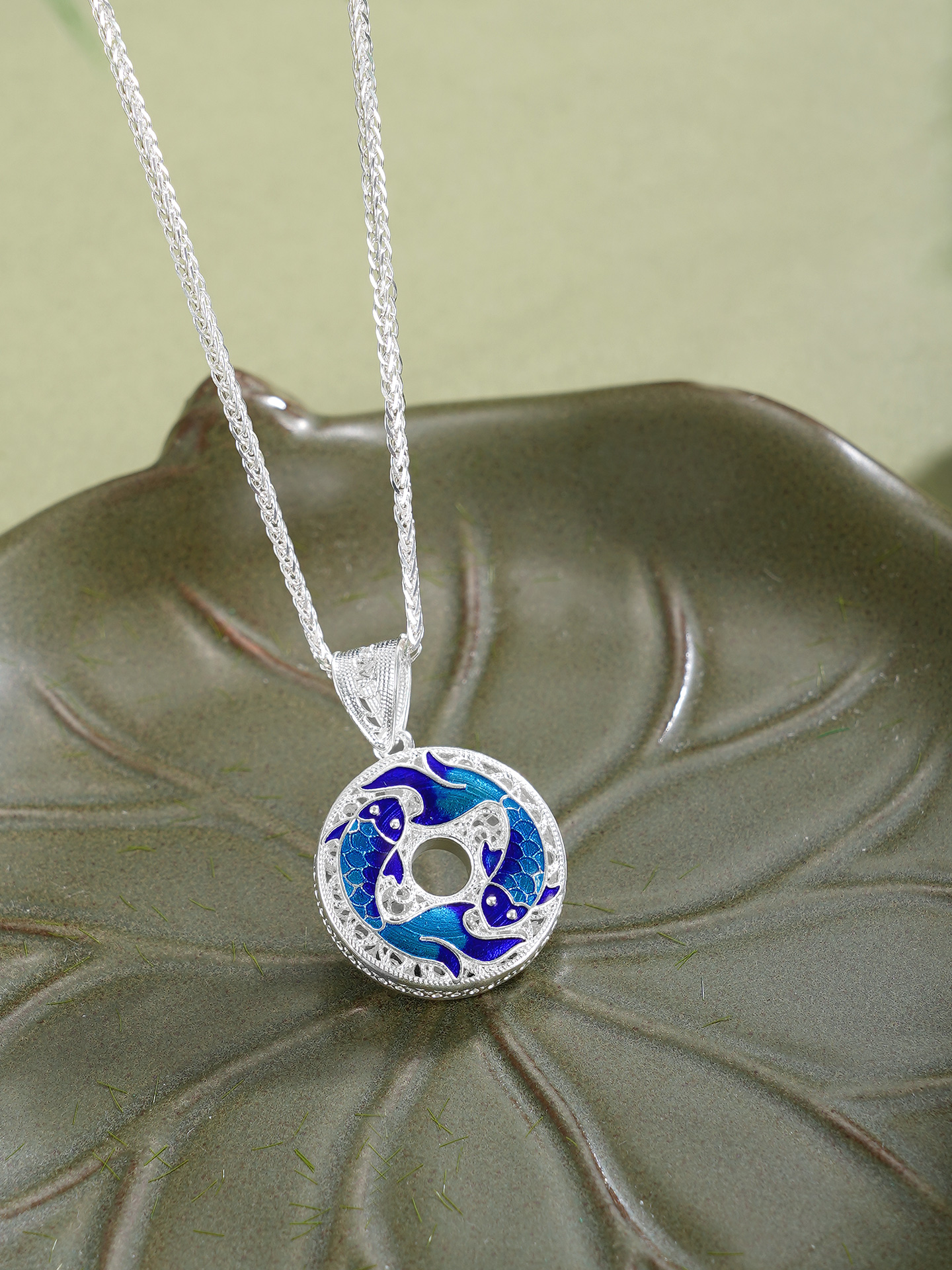 子佩集【好运连鲤】S990银套链【YXYLDZ056】花丝珐琅彩双鱼平安扣福字项链2510