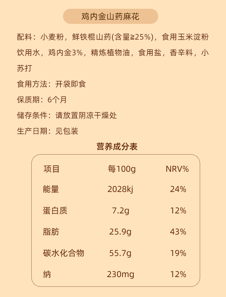 【配料表】小麦粉,铁棍山药粉(含量≥25%)食用玉米淀粉,饮用水,鸡内金3%,精炼植物油,食用盐,香辛料,小苏打
