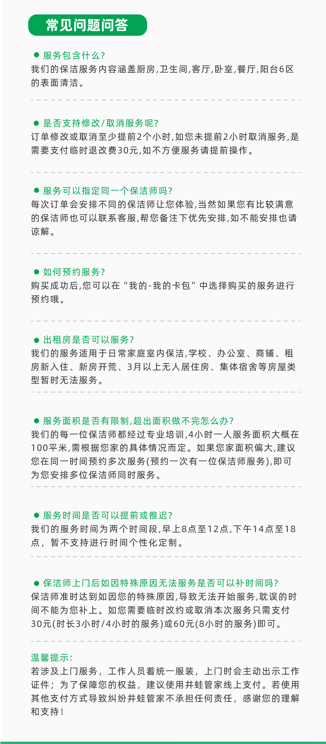 1.服务上门服务时间为8:00-18:00,超出时间暂无法提供服务,请根据家庭情况预约合适人员上门!如遇服务旺季,请提前预约,以免耽误您的排程;