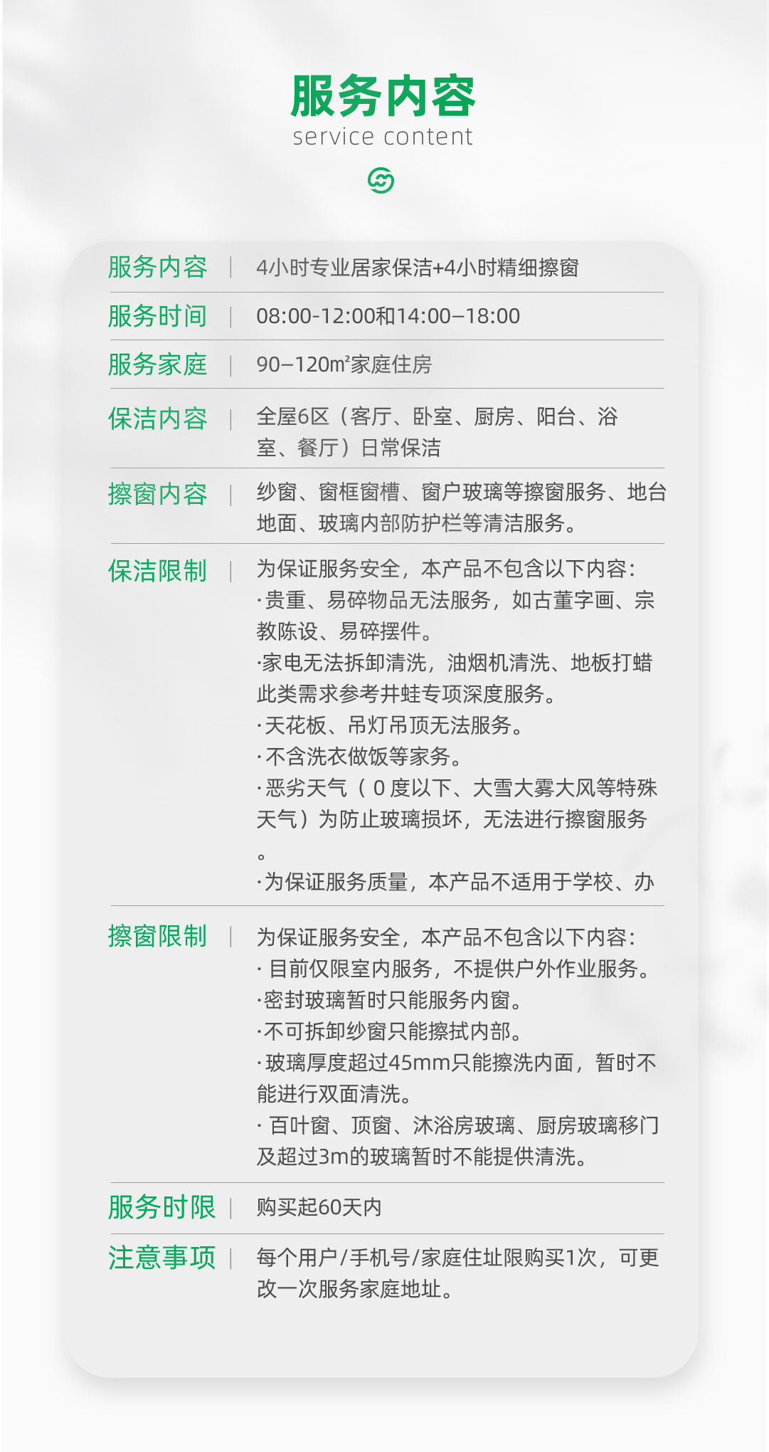 3.下单后可联系客服预约上门服务时间或等待客服致电预约时间,不可指定员工;上门服务具体时间以客服沟通时间为准,客服工作期间(9:00-18:00)将在客户下单后2个小时内电话联系确认上门服务时间。