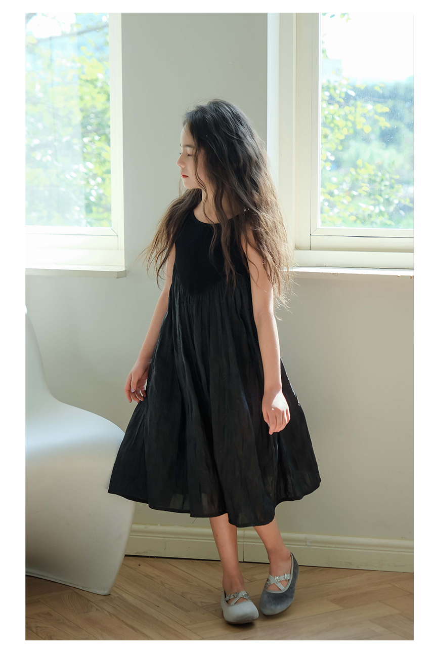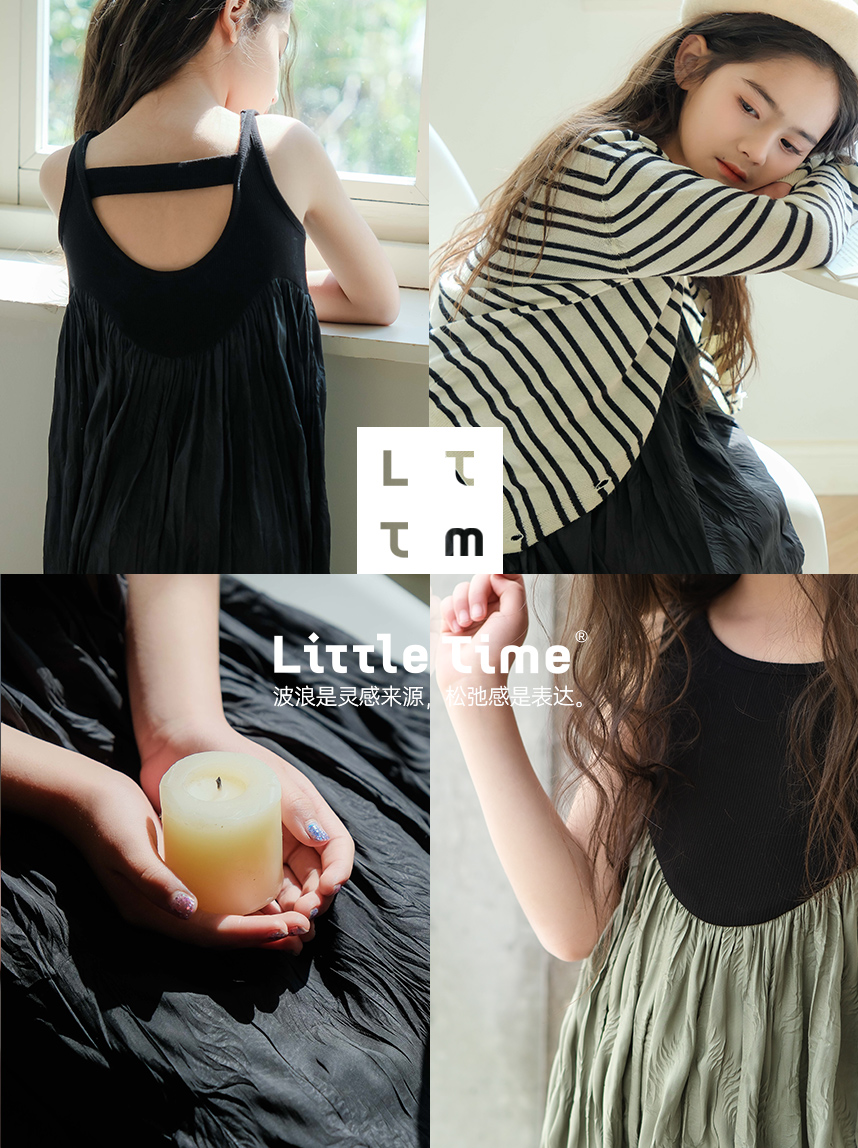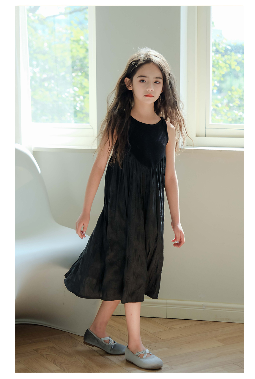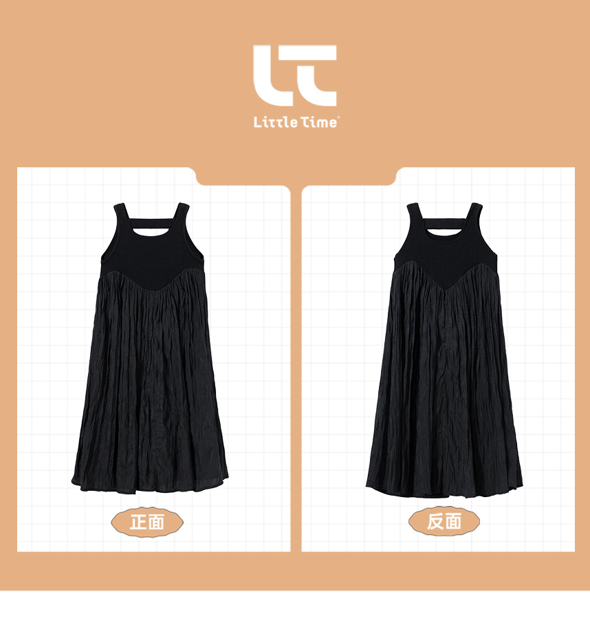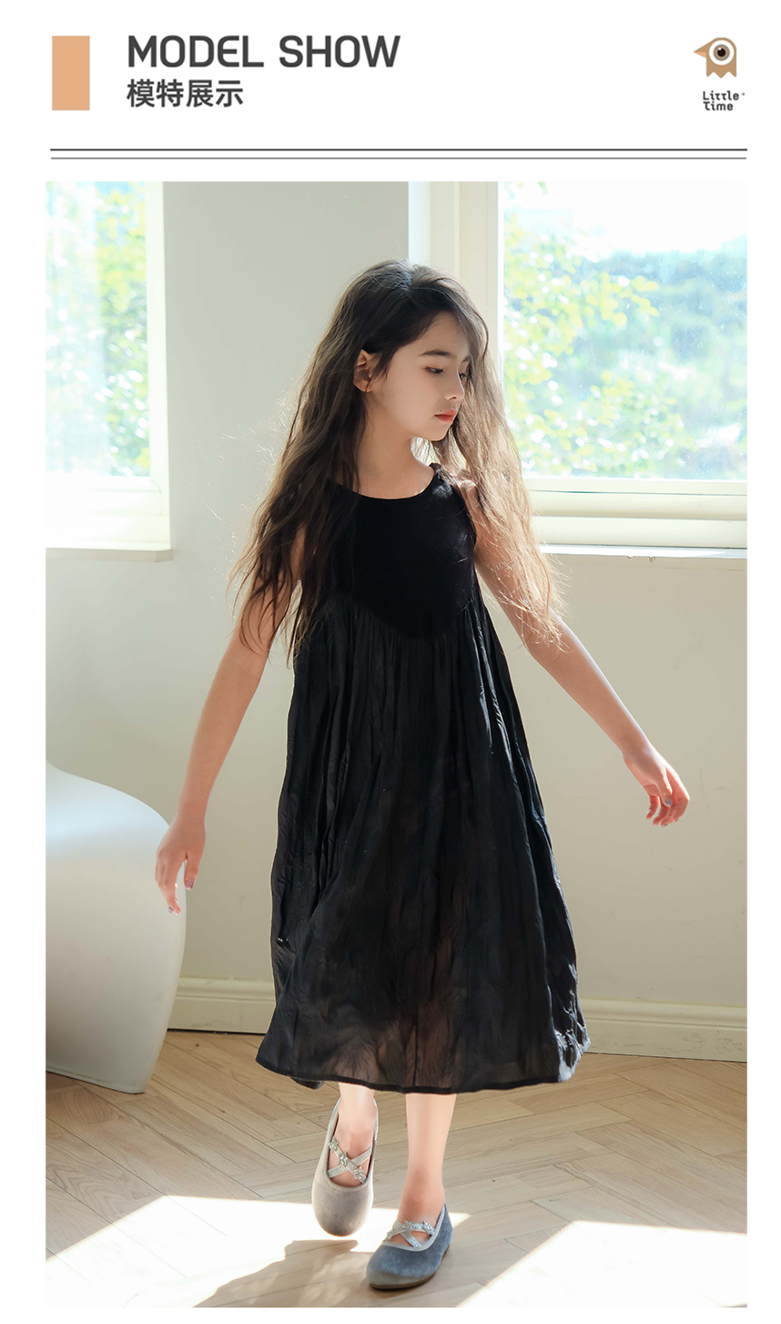 littletime女童黑色连衣裙2024春秋新款复古肌理裙春夏无袖吊带裙