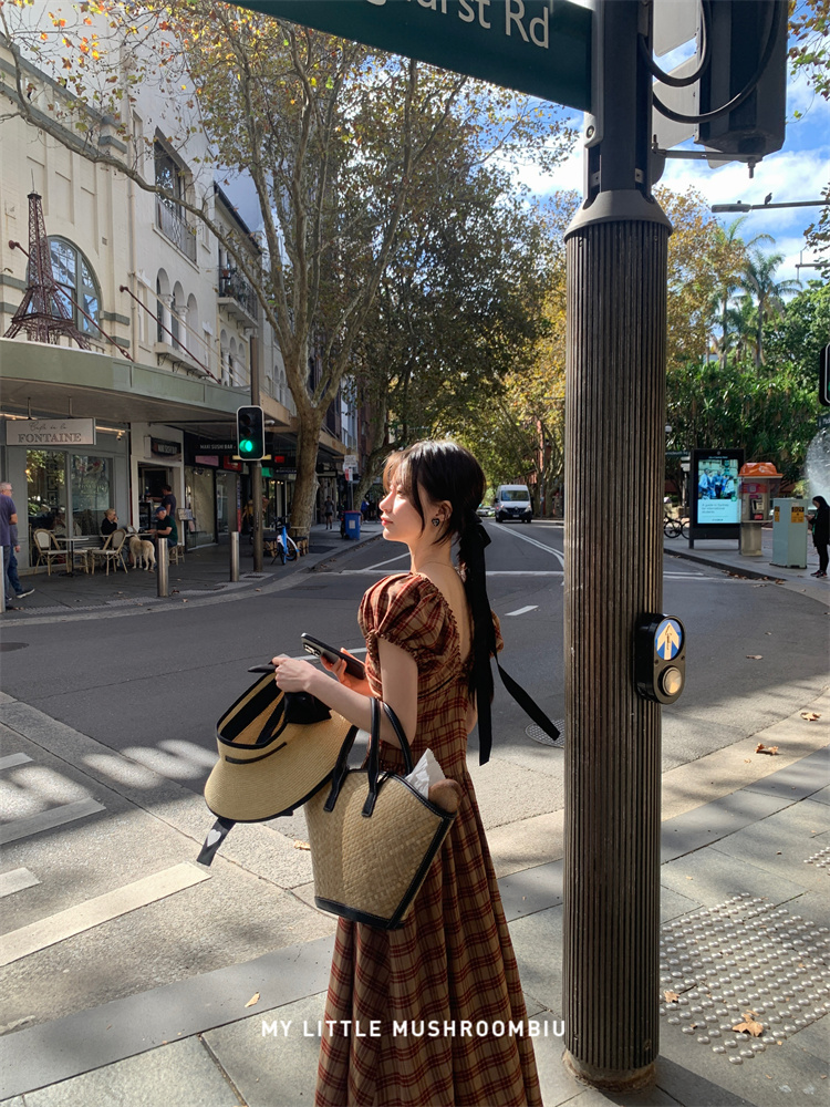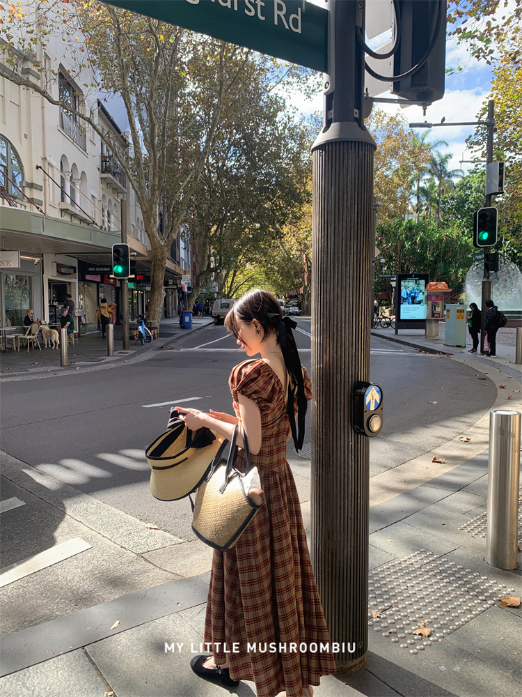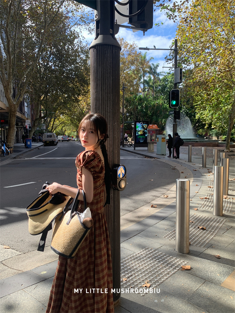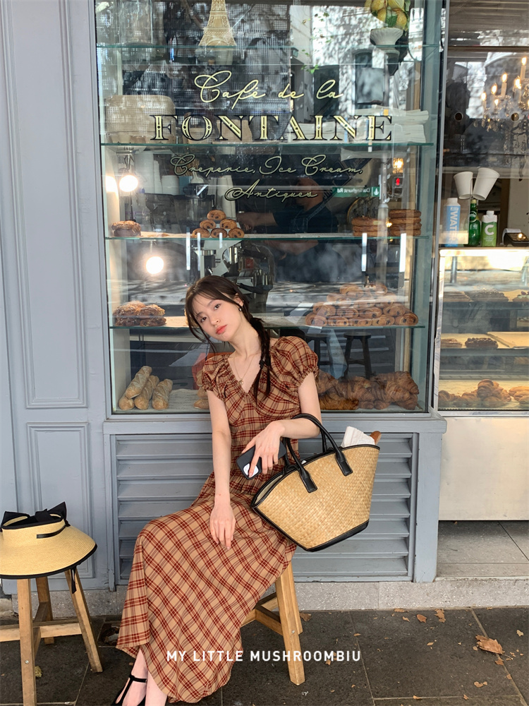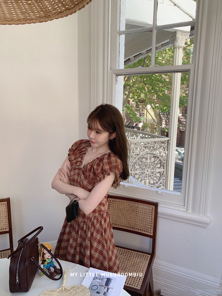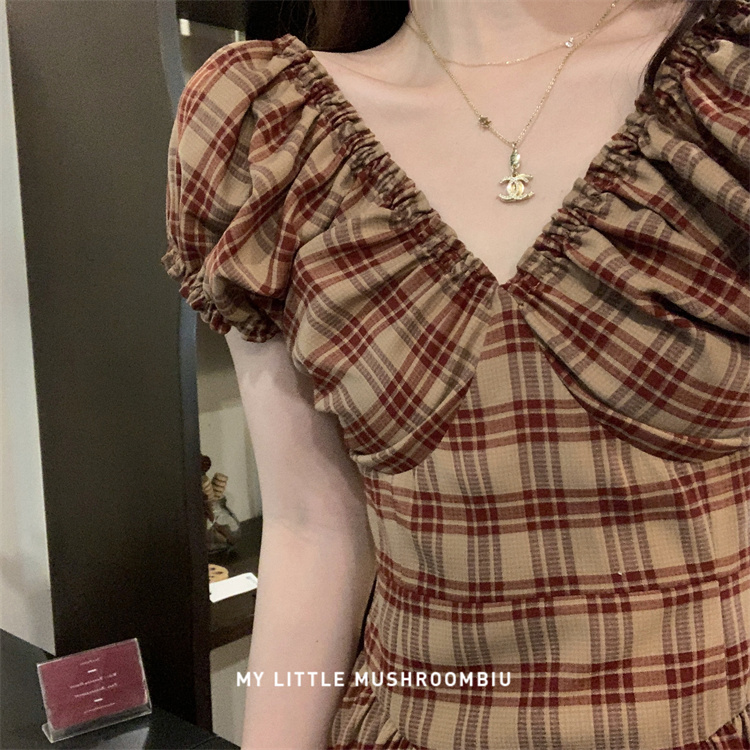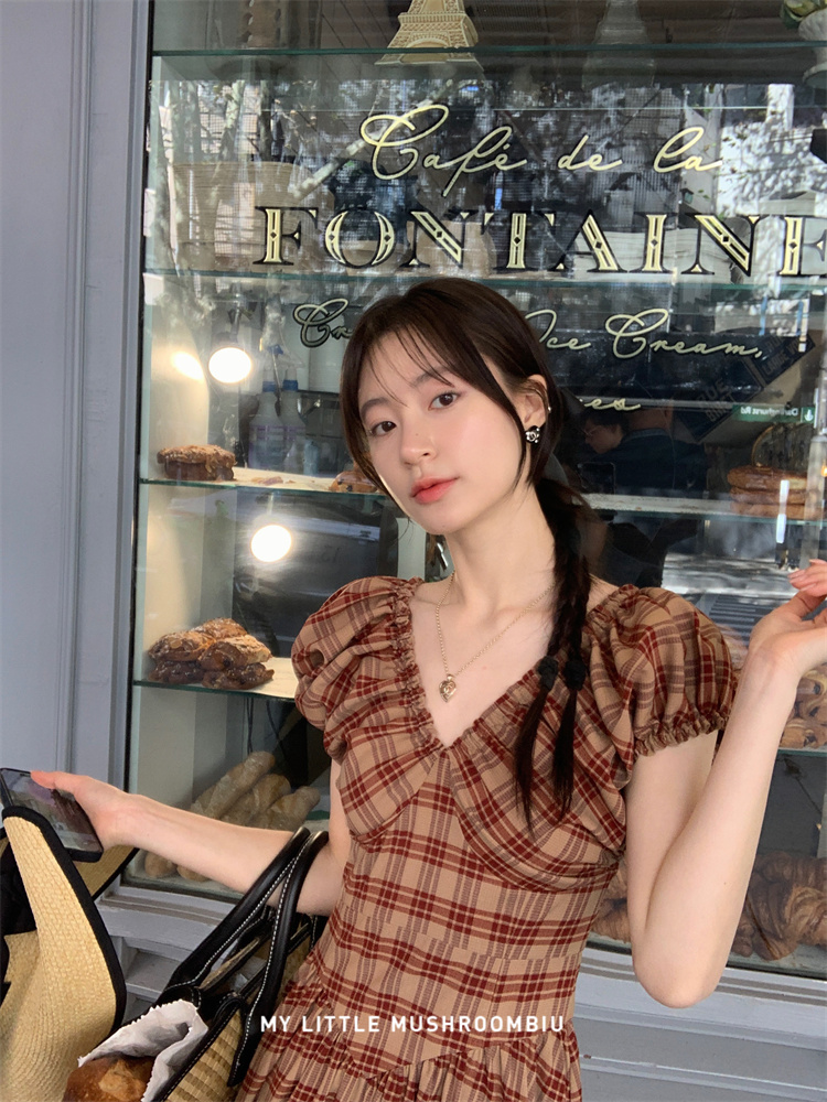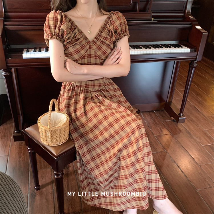 金蘑菇菇 水果篮子 小红裙 /长短款复古耐看v领泡泡袖格子连衣裙