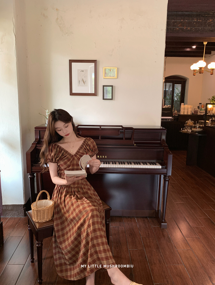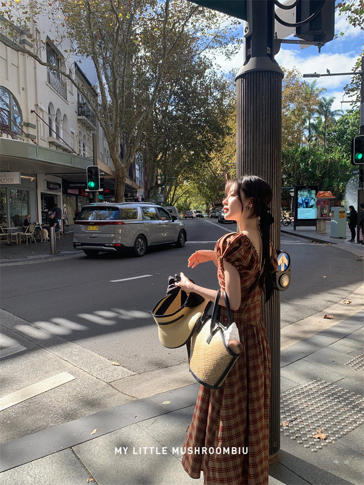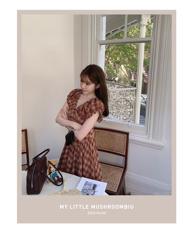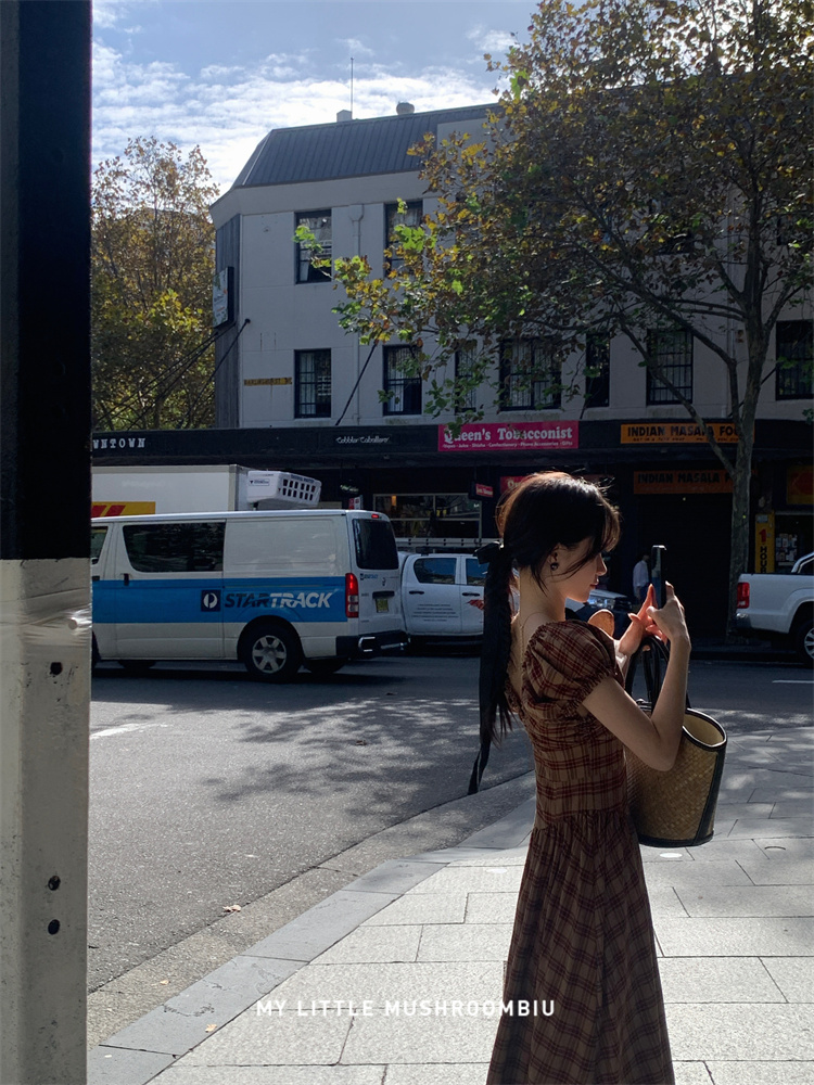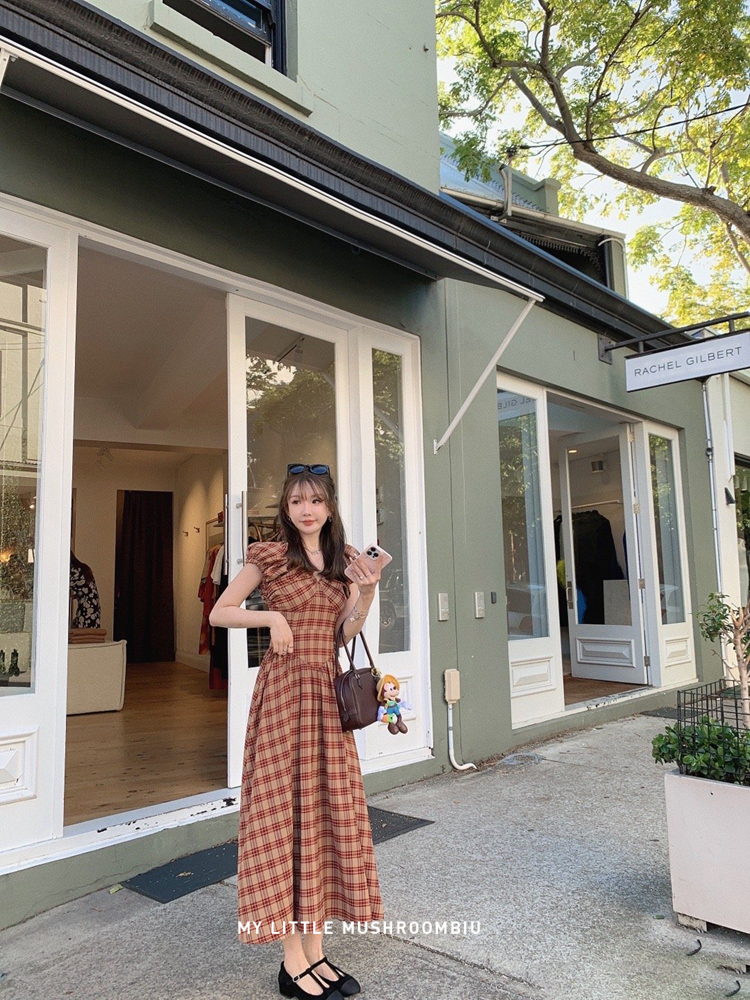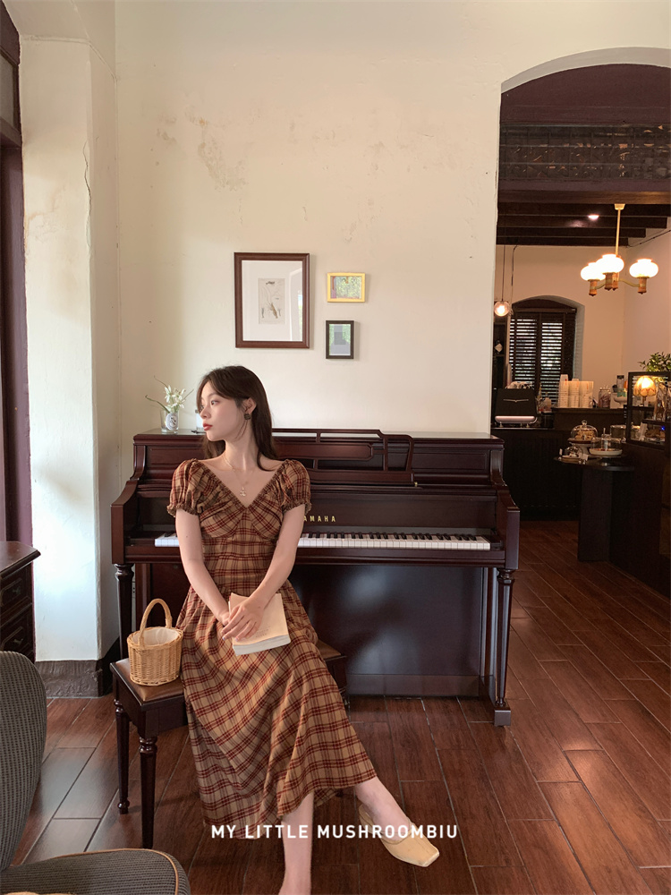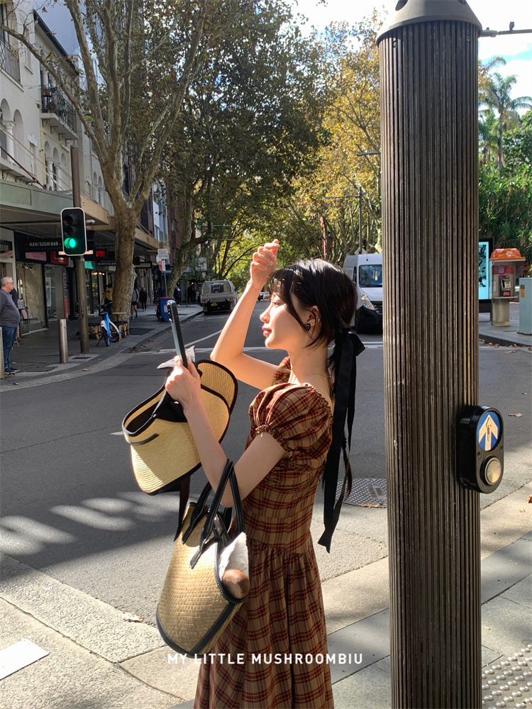 金蘑菇菇 水果篮子 小红裙 /长短款复古耐看v领泡泡袖格子连衣裙