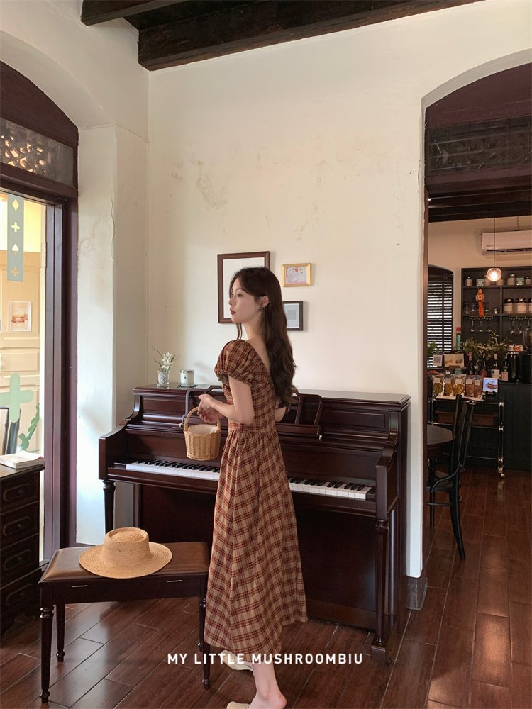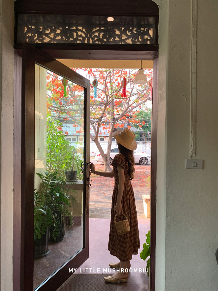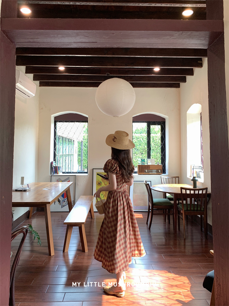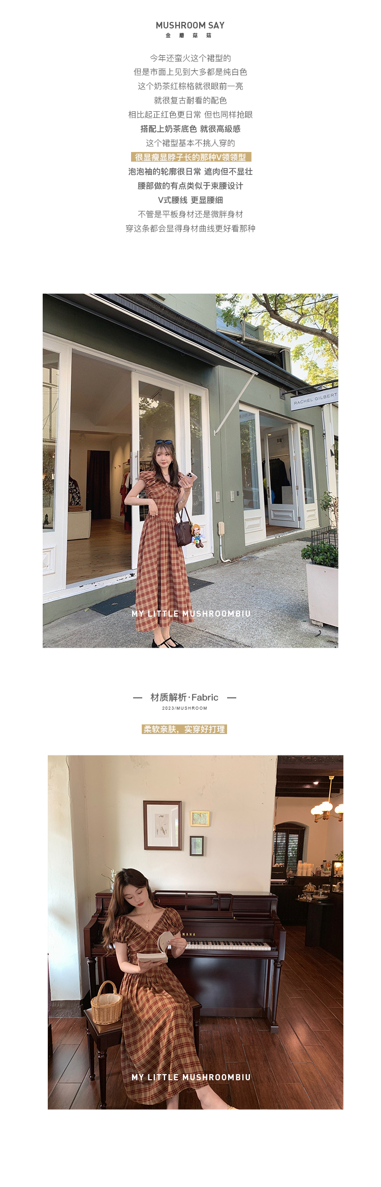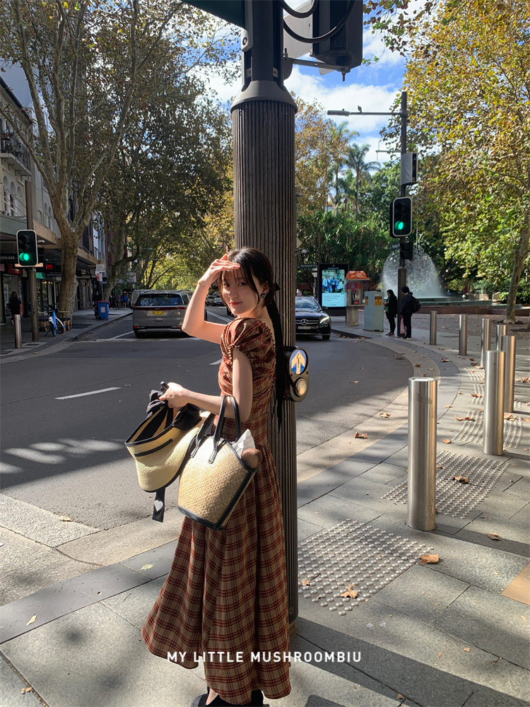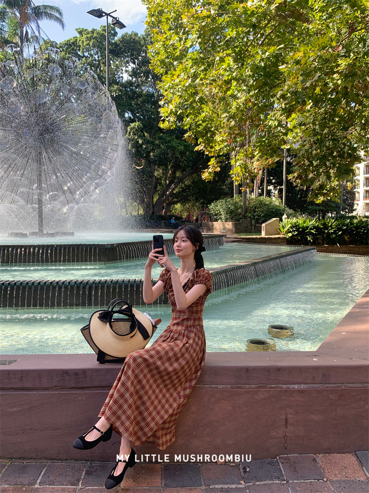 金蘑菇菇 水果篮子 小红裙 /长短款复古耐看v领泡泡袖格子连衣裙