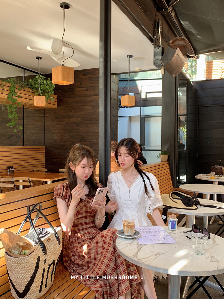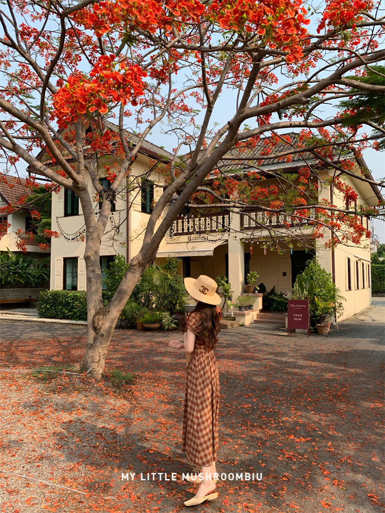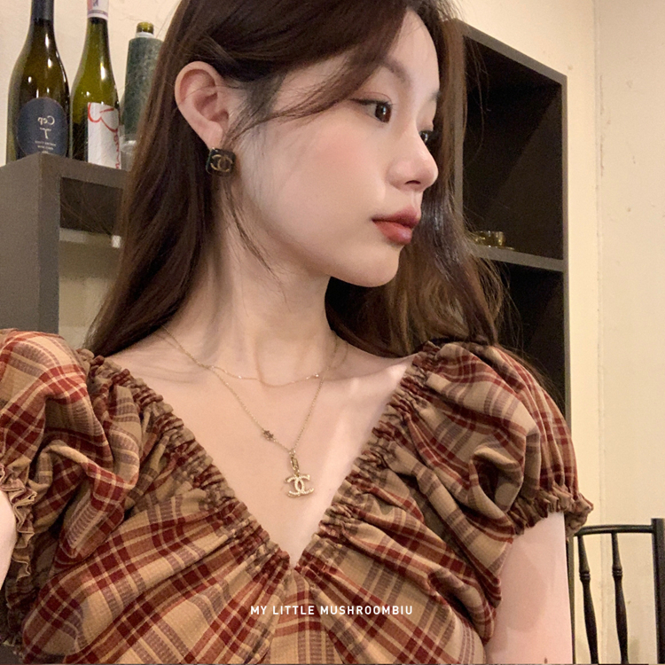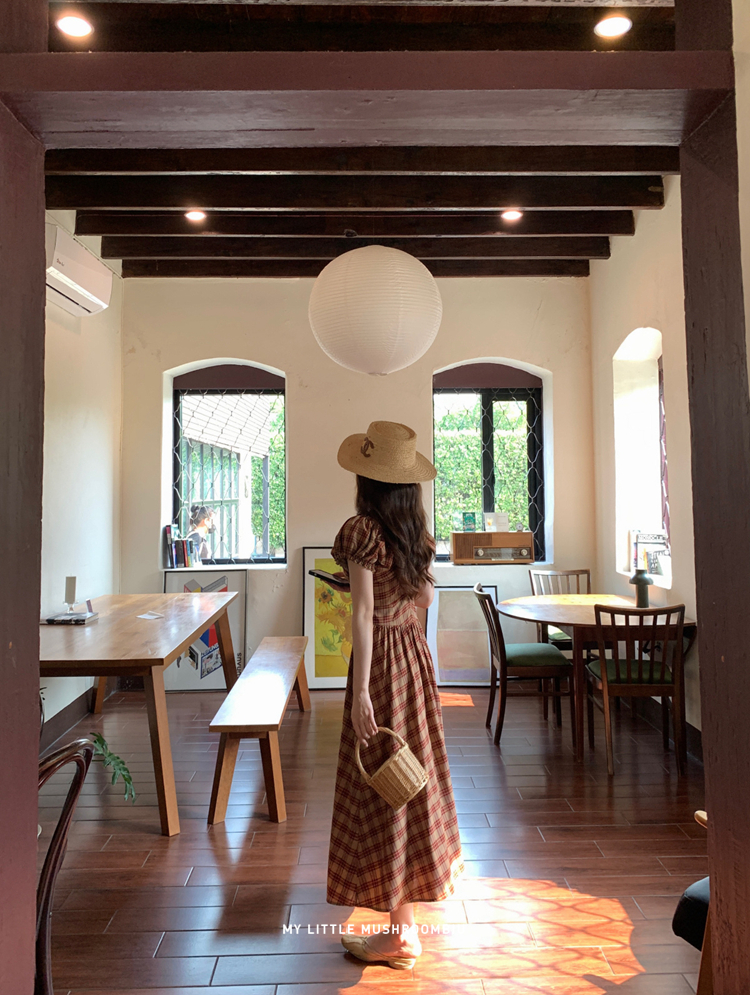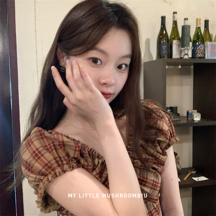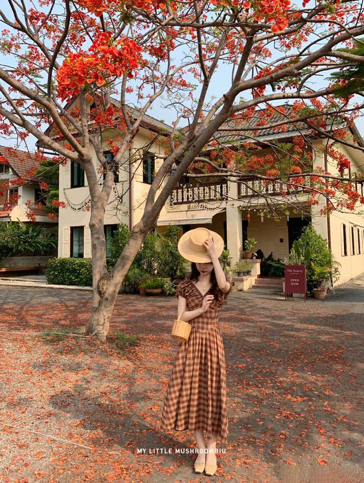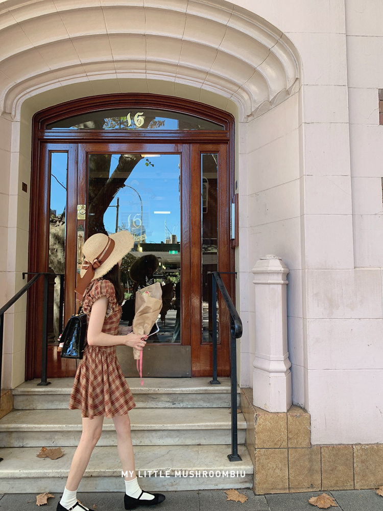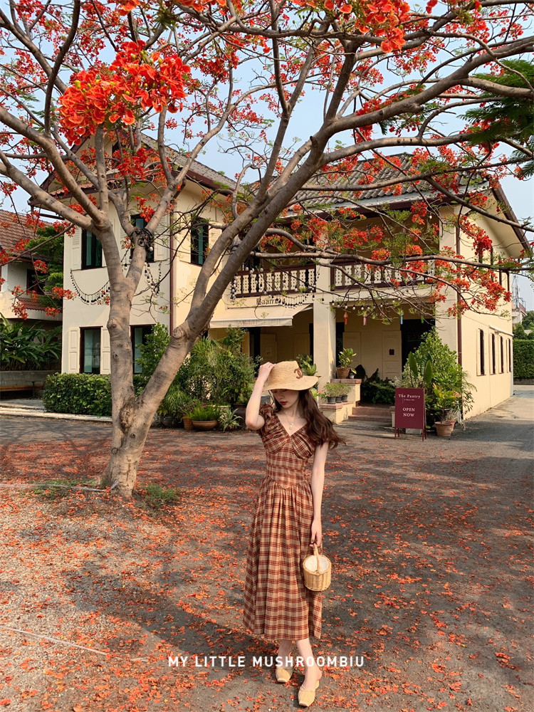金蘑菇菇 水果篮子 小红裙 /长短款复古耐看v领泡泡袖格子连衣裙