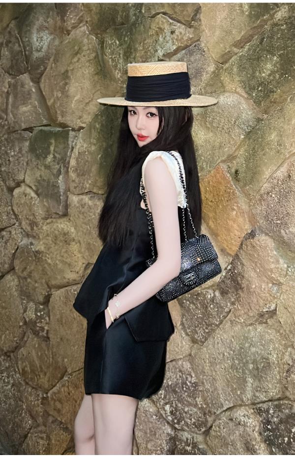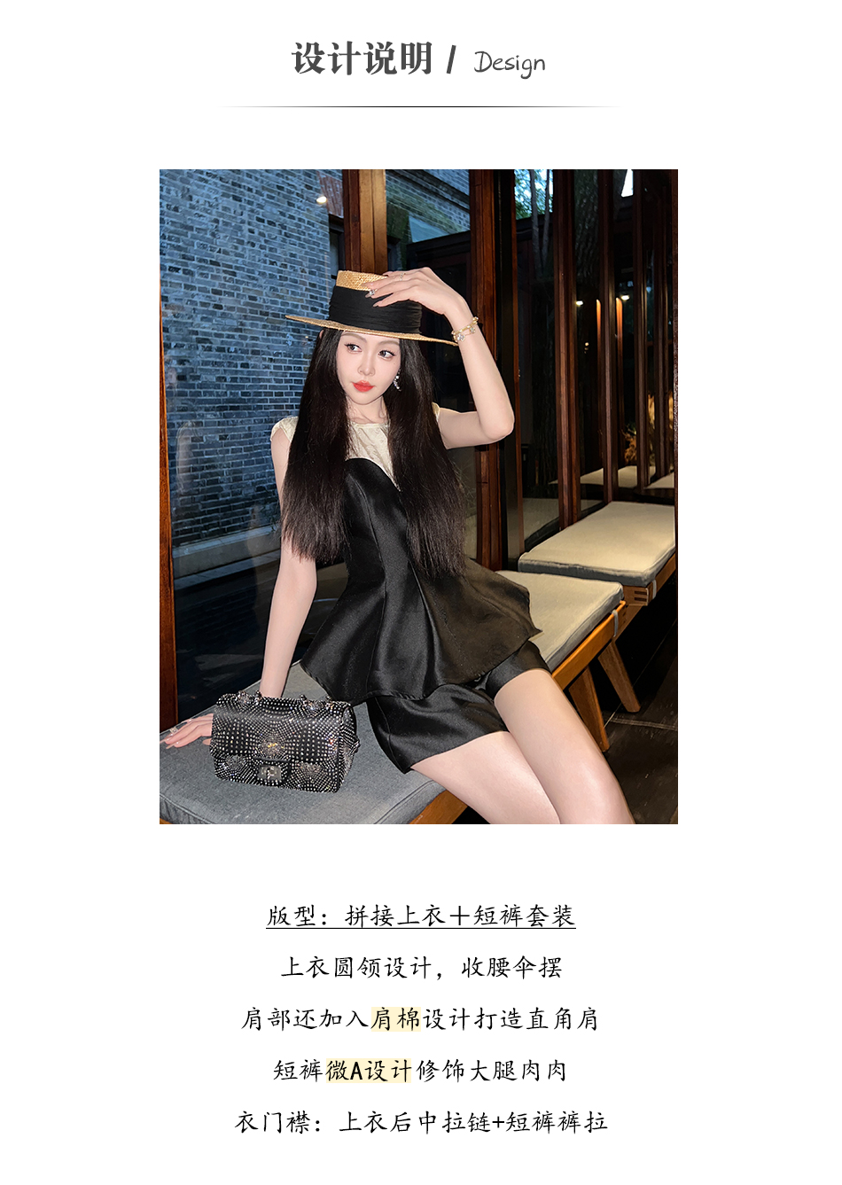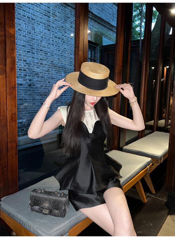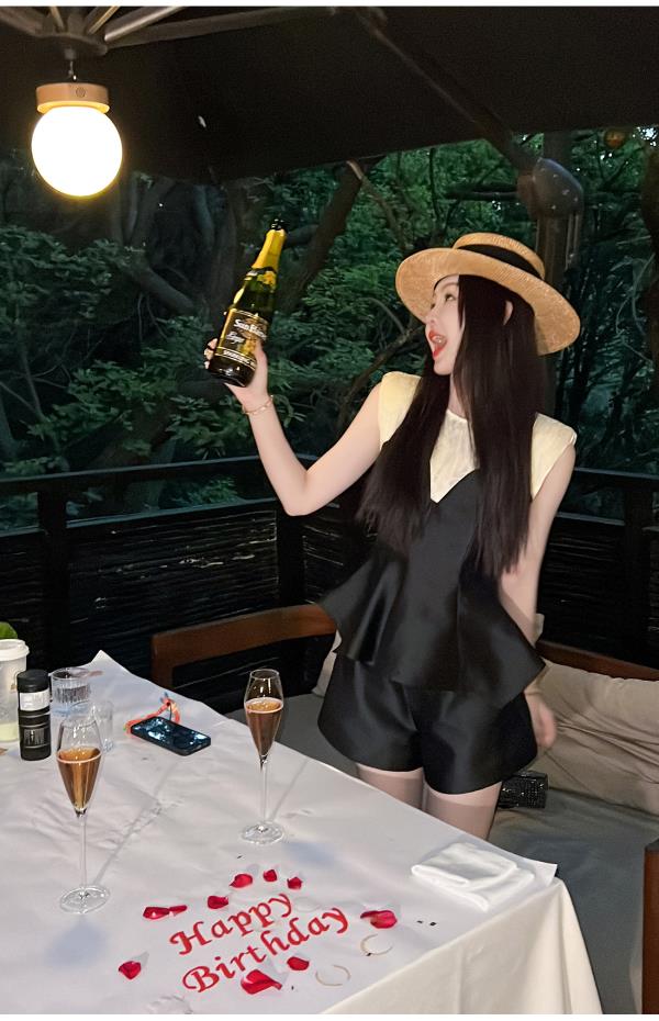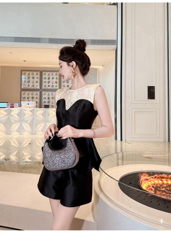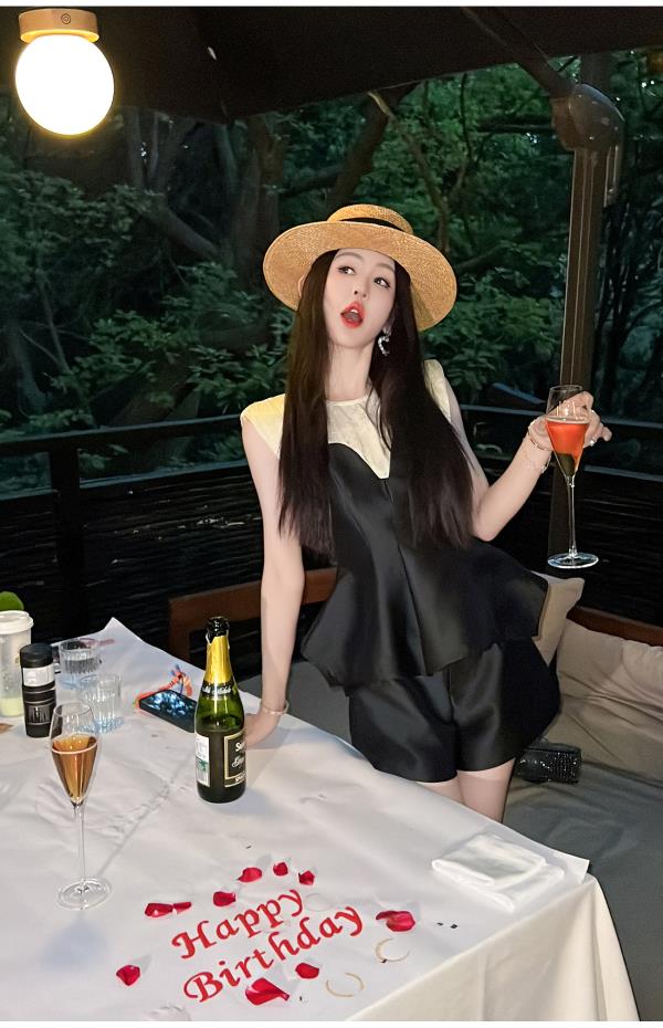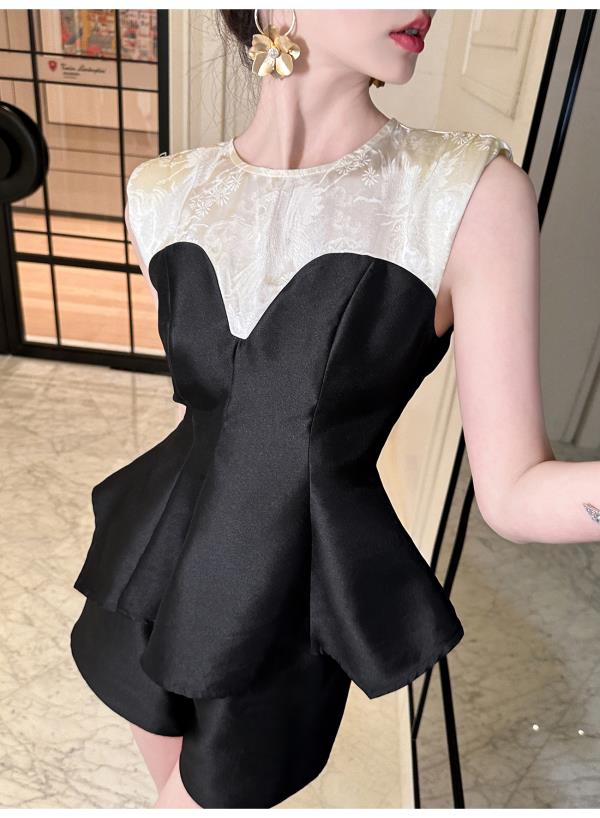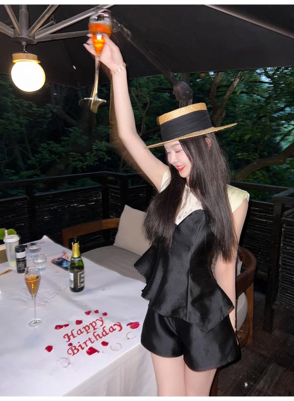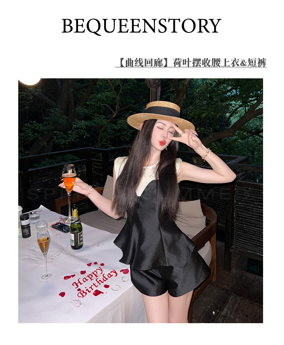 BeQueenStory【曲线回廊】高级感撞色拼接荷叶摆收腰上衣&短裤套装