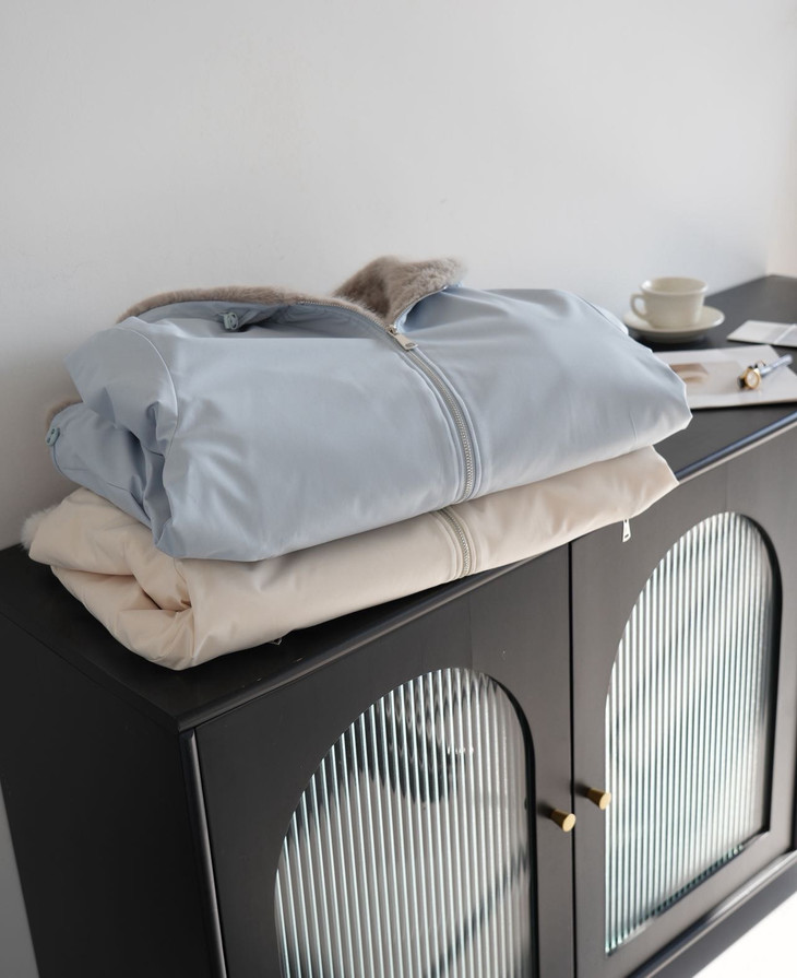 📷团长实拍动图 是谁还没有拿下这件外套❗️到手就疯狂心动 内里仿貂绒分量满满,超级暖和🔥 像裹了一团会呼吸的云朵☁️雾霾蓝也太戳我了 不是普通的浅蓝,是自带“冷调滤镜”的灰蓝色 清冷又温柔,黄黑皮穿直接白两个度✨ 下摆做了同色系定染伸缩扣,细节做工非常讲究