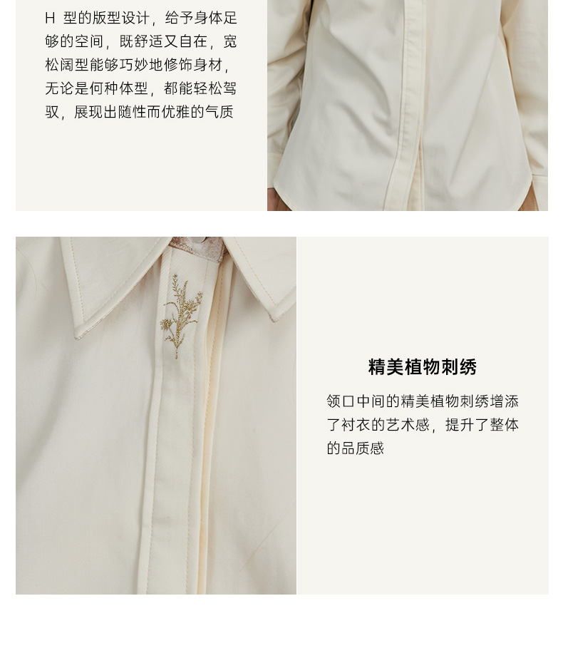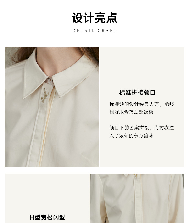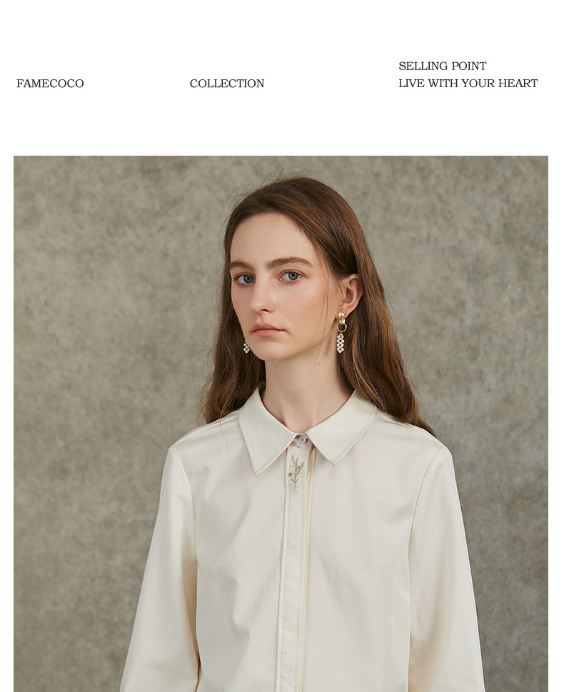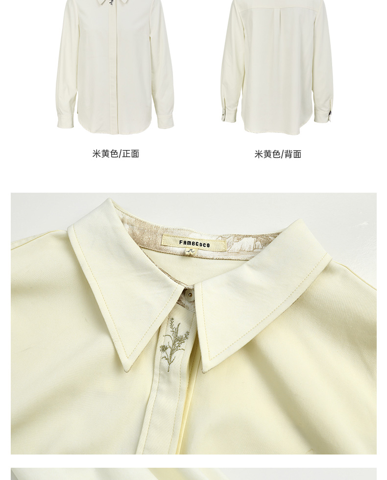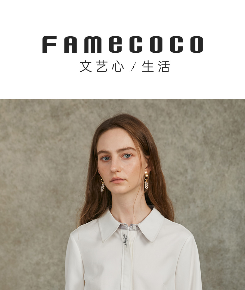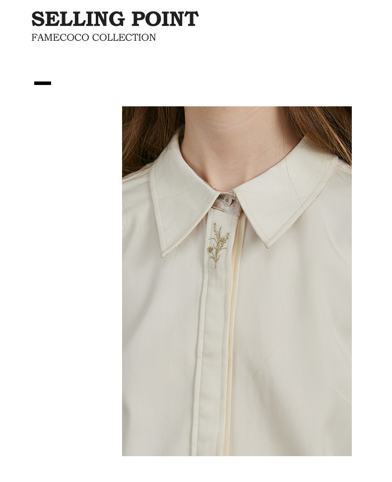 Famecoco范可儿正肩长袖衬衣气质通勤领口植物刺绣FAC6BH010