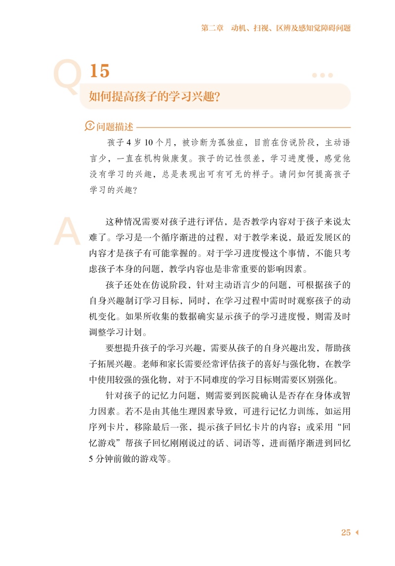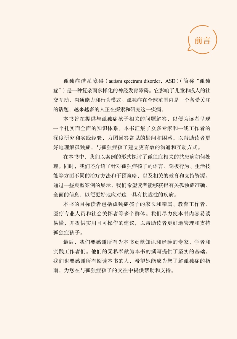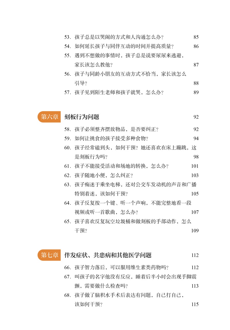 全书共包括101个问答,涉及孤独症谱系障碍相关常识、训练方法和技巧、刻板行为、问题行为的识别和纠正、语言和沟通等,涵盖了从诊断到干预、从幼年到青春期等不同阶段的研究与应用。在解答问题时,我们尽量做到权威、全面,并紧跟最近国际进展,以满足家长对知识的渴求。本书采用一般家长能够理解的朴实的语言,深入浅出地讲解相关的知识点。为了让家长能够针对自己的孩子的情况进行针对性的指导,本书还特地选取了临床工作中遇到的很多实际案例。这些案例有很强的代表性,并且我们尽可能全面、详细地呈现孩子在生活中的表现,并给出实际性的指导。相信通过这些案例,家长们应该能够有所借鉴。