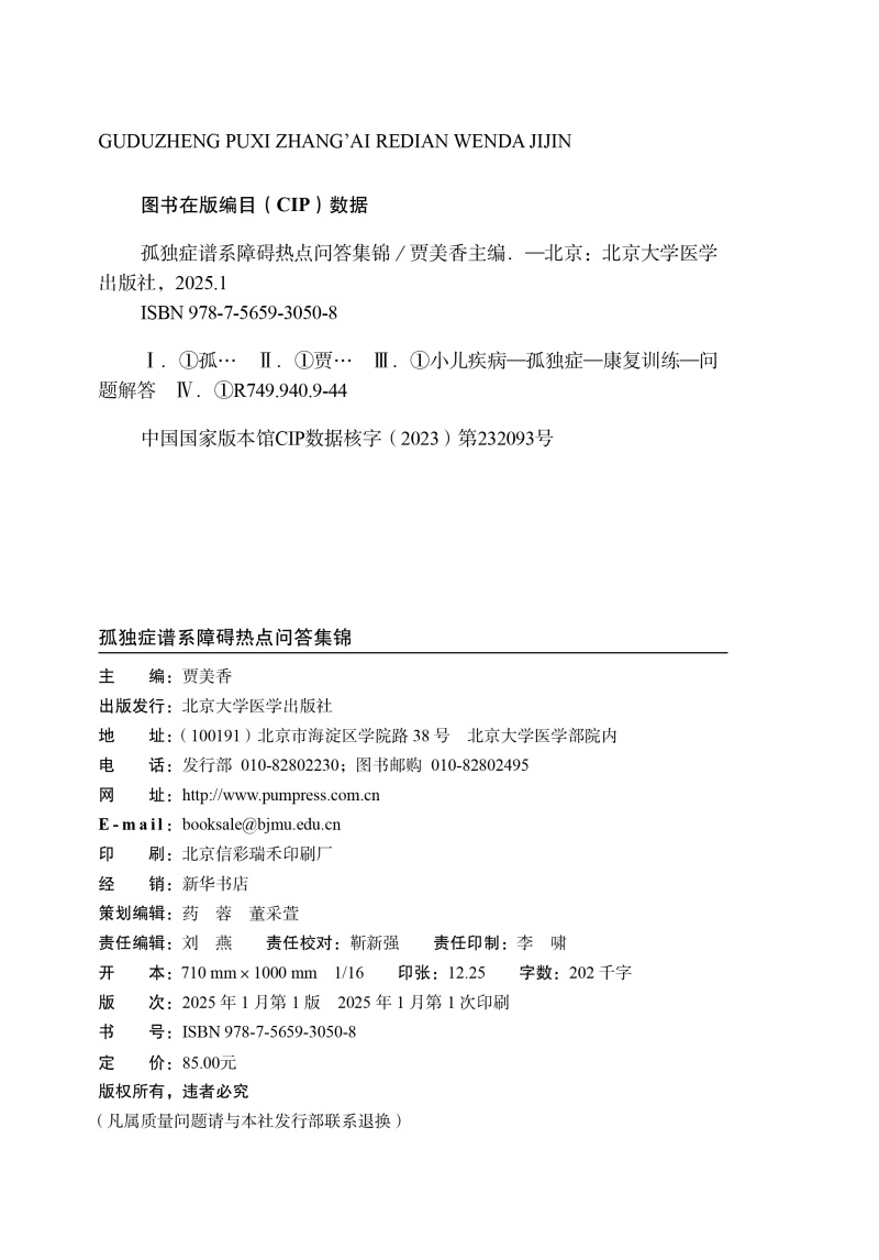 孤独症谱系障碍热点问答集锦 孤独症谱系障碍诊疗康复系列丛书 贾美香 小儿疾病 孤独症 康复训练 问题解答 北京大学医学出版社