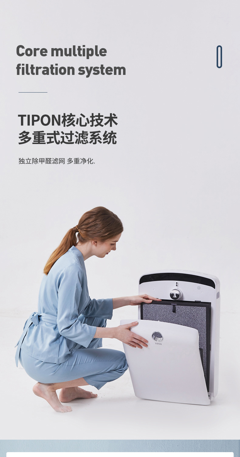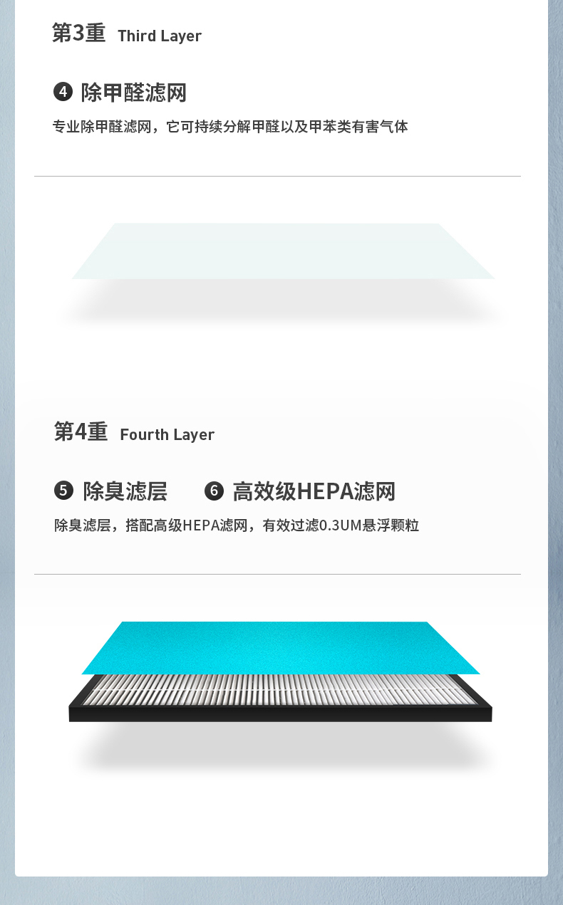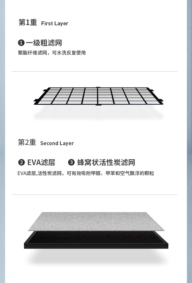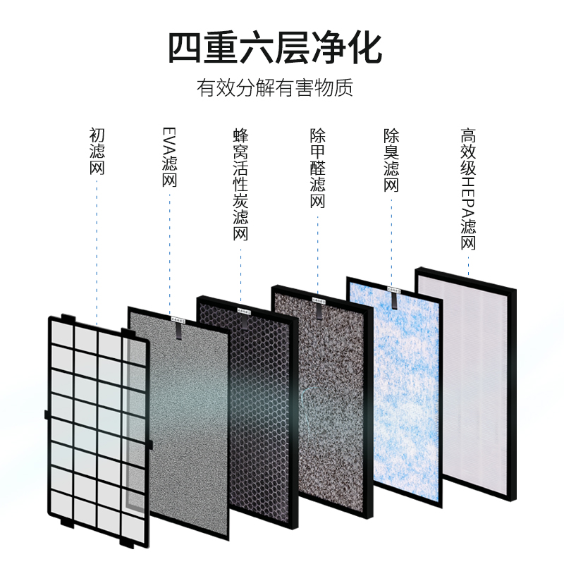 6层滤网:滤网可使用8000个小时,使用时长还需看空气质量