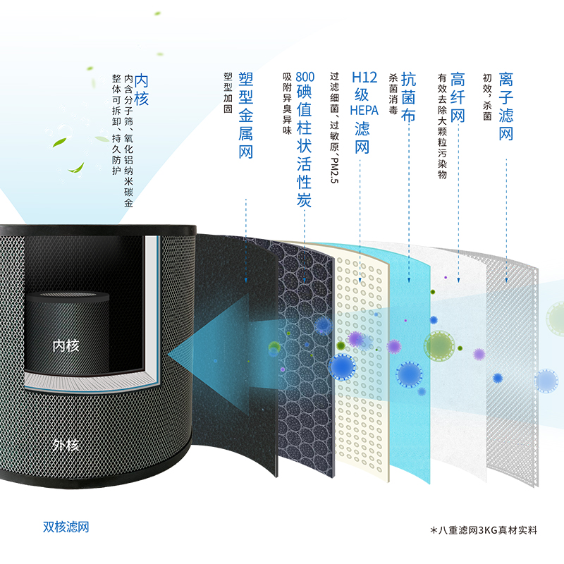 7层滤网芯:滤网可使用12000小时,使用时长还需看空气质量